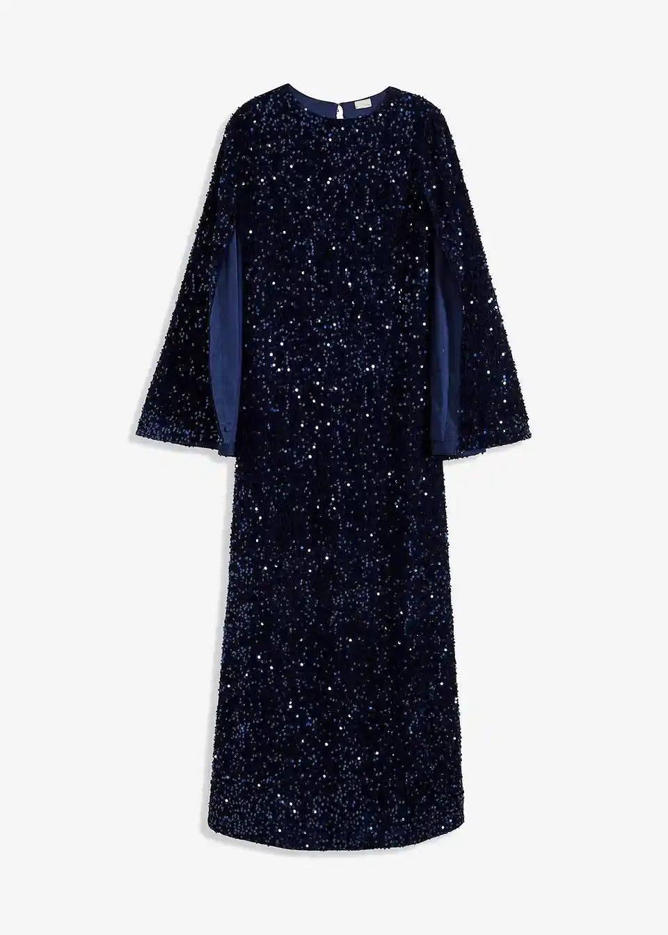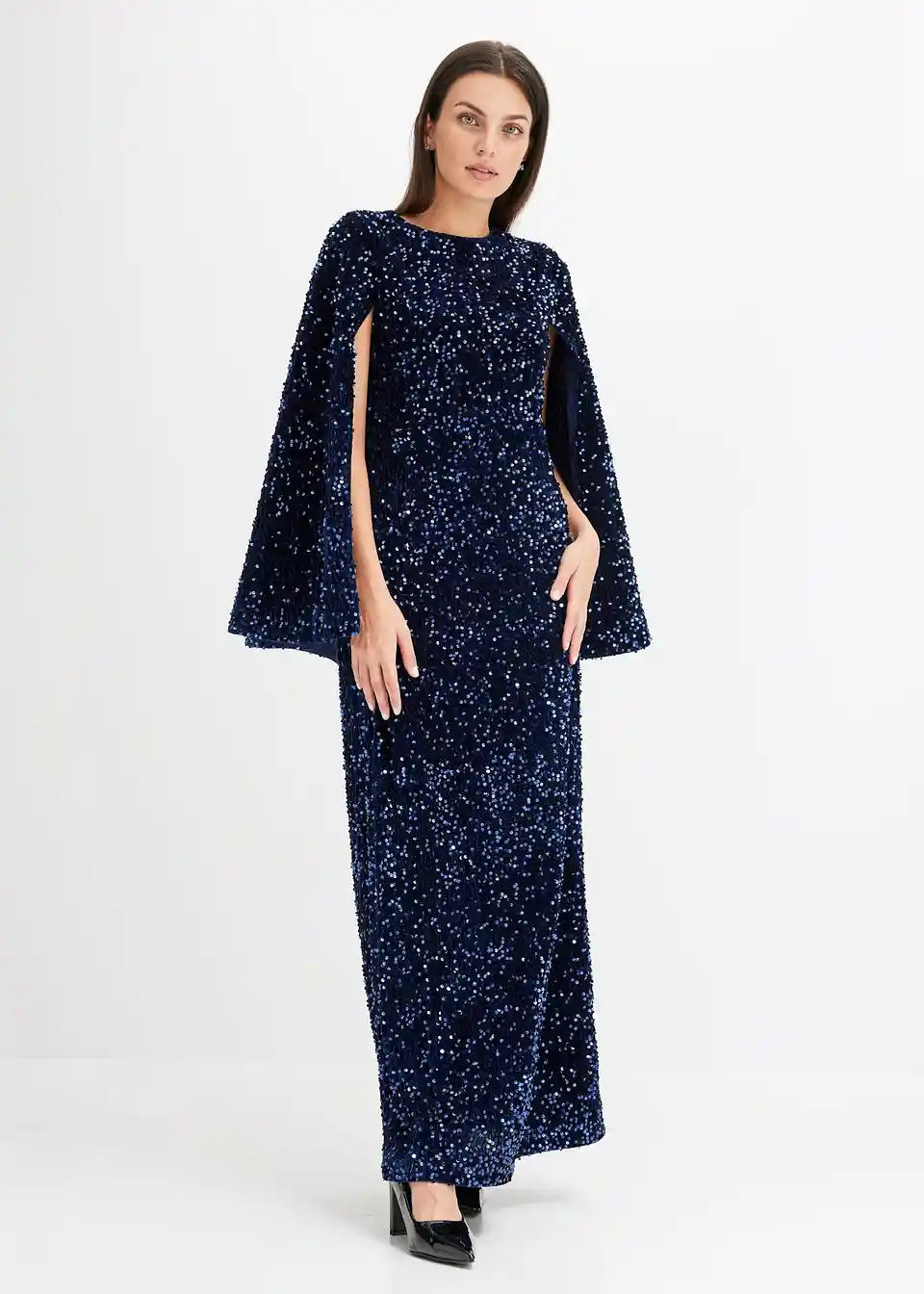 Moderna in ženstvena: dolga obleka iz mehkega žameta z bleščicami in dolgimi plaščnimi rokavi