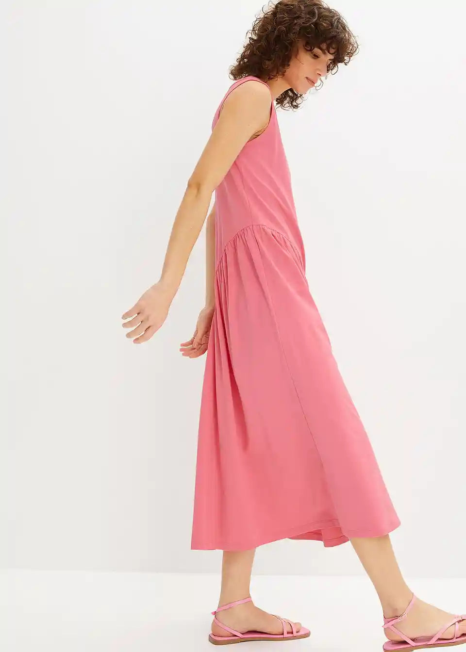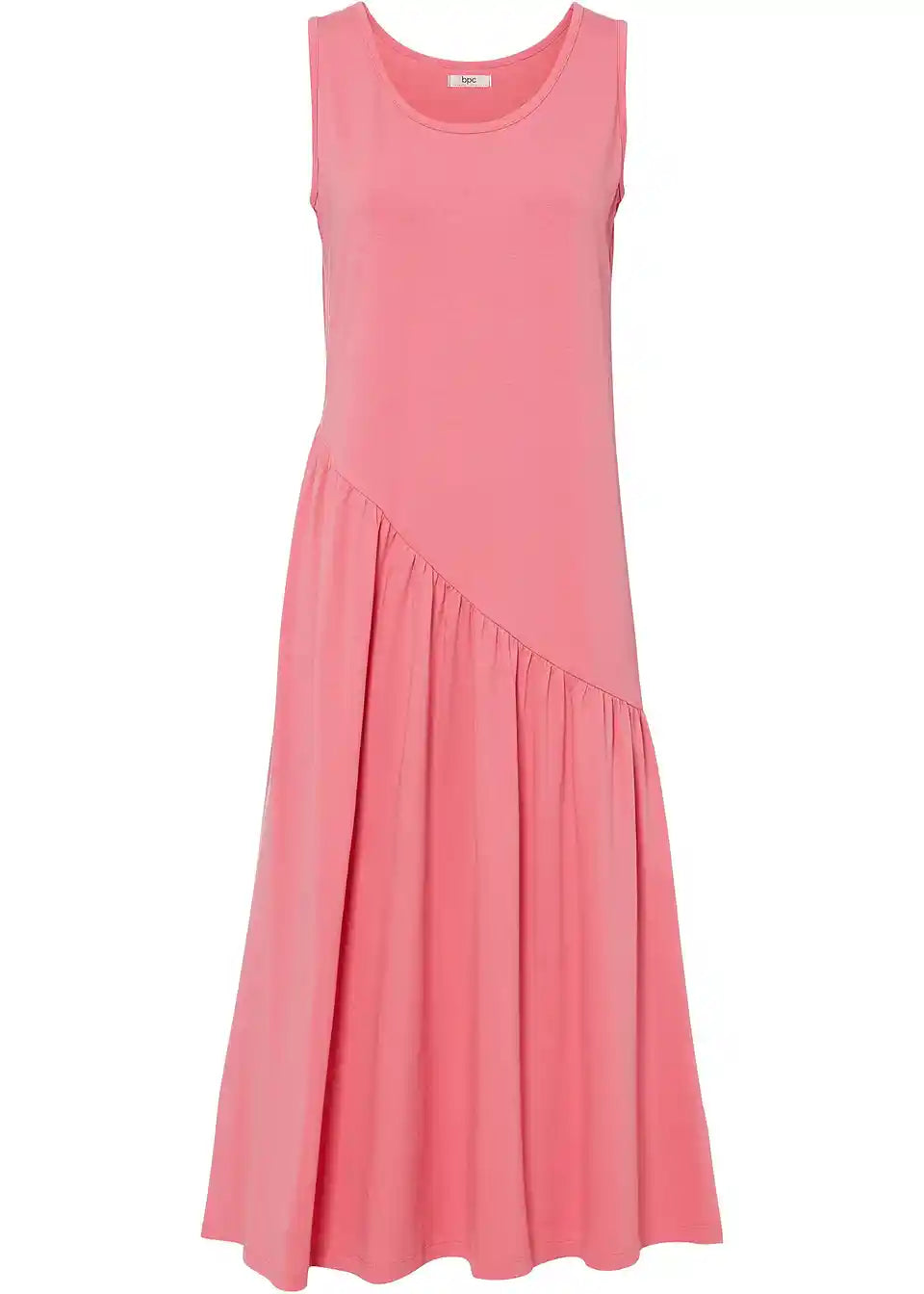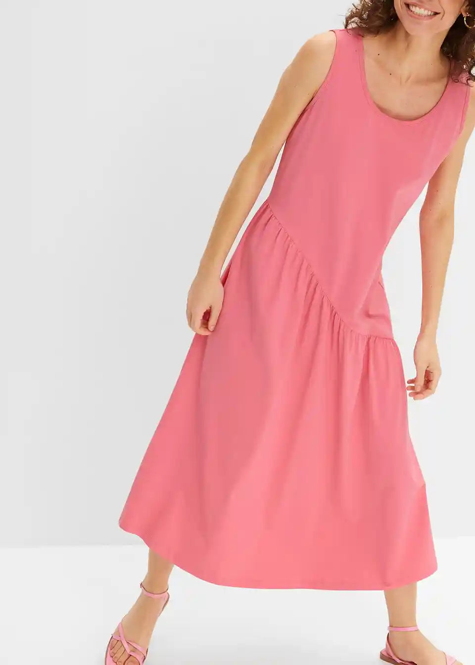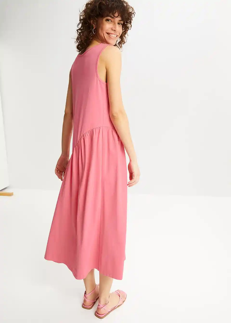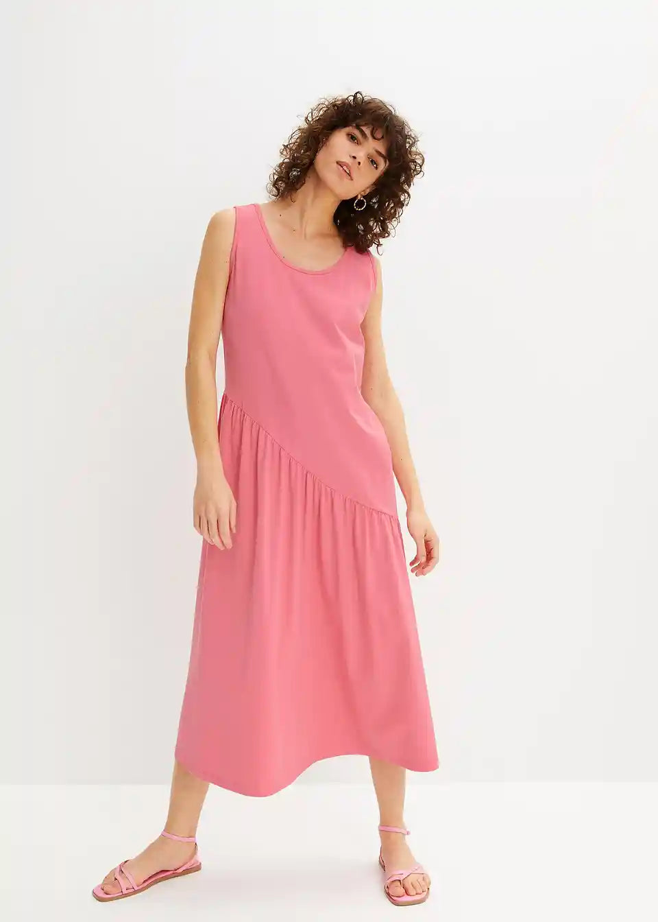Bombažna obleka iz trikoja z asimetričnimi volani v dolžini do meč