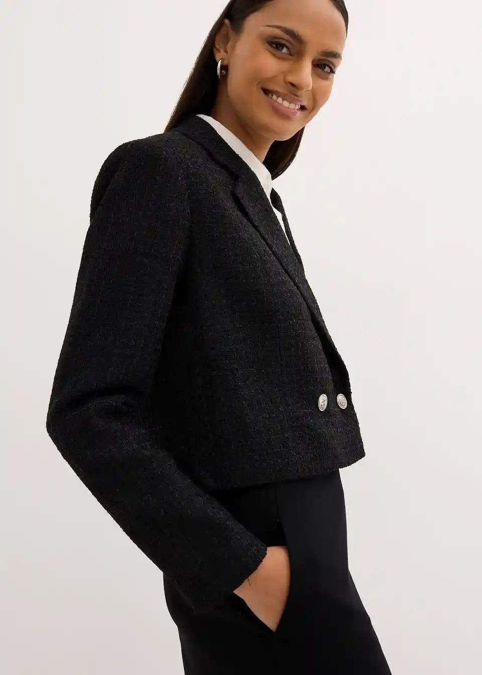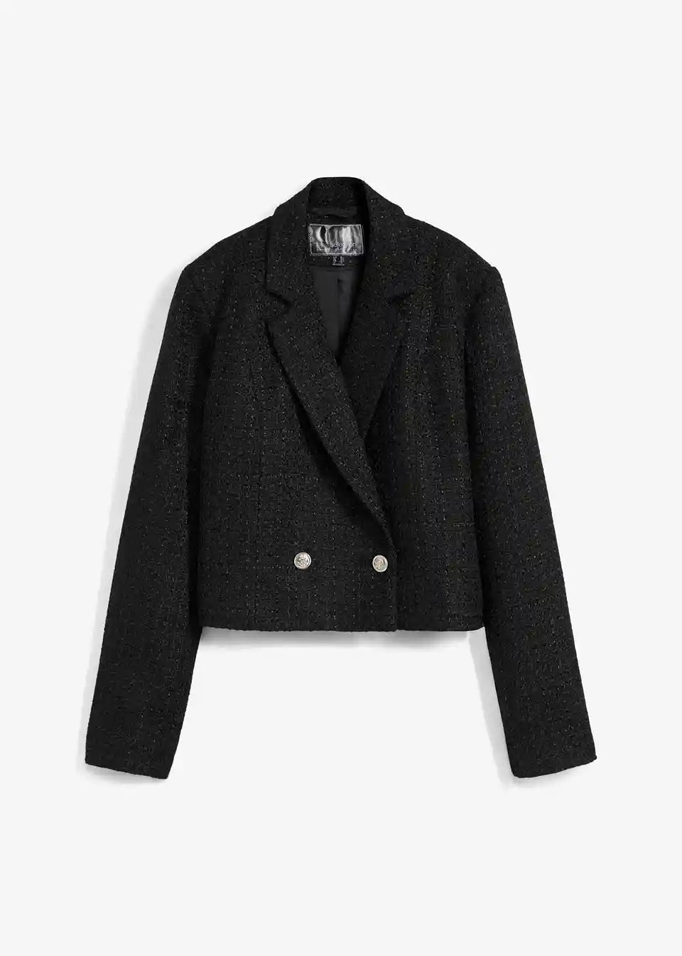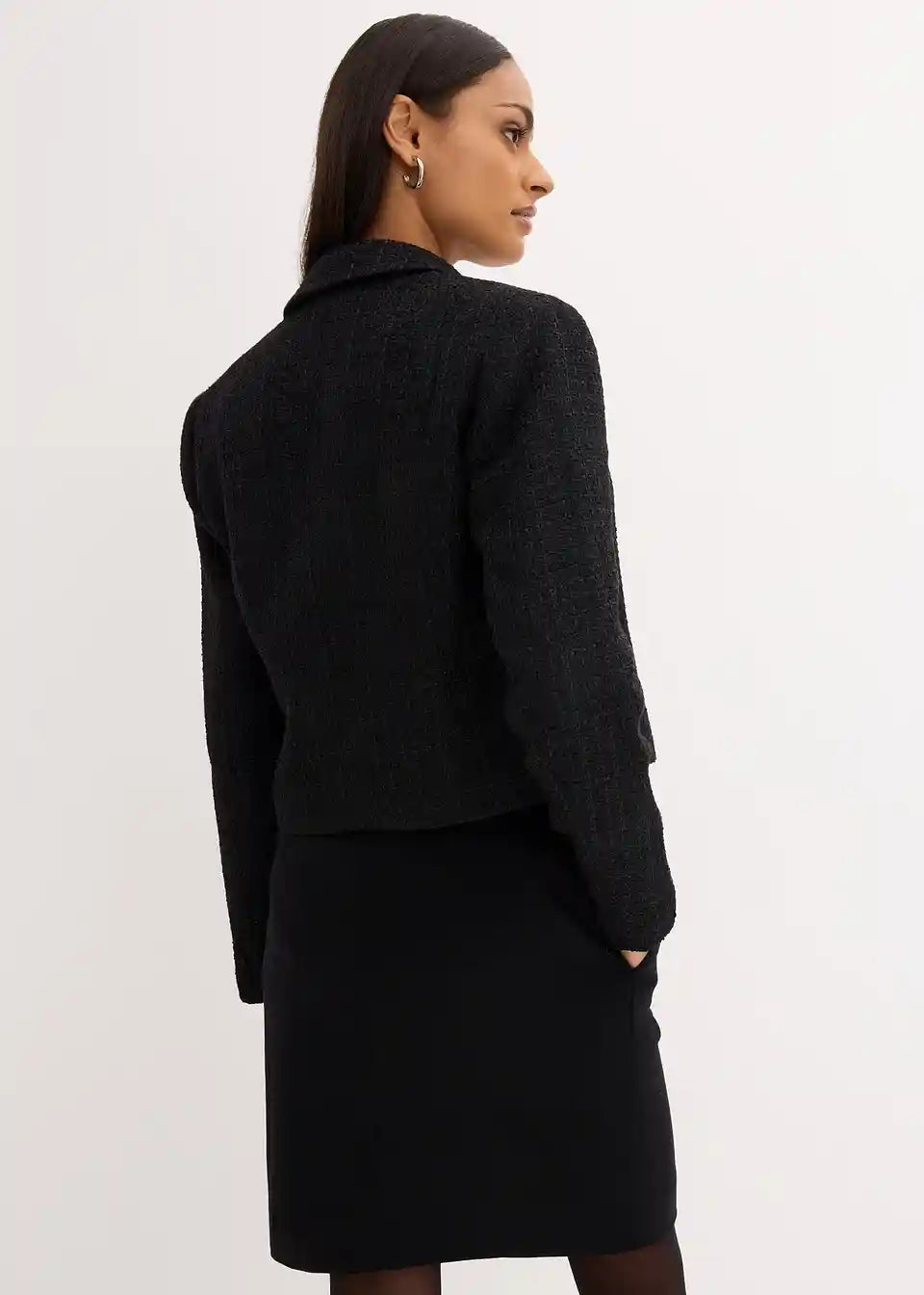 kratek suknjič iz boucléja z diskretnimi bleščečimi poudarki in kovinskimi gumbi