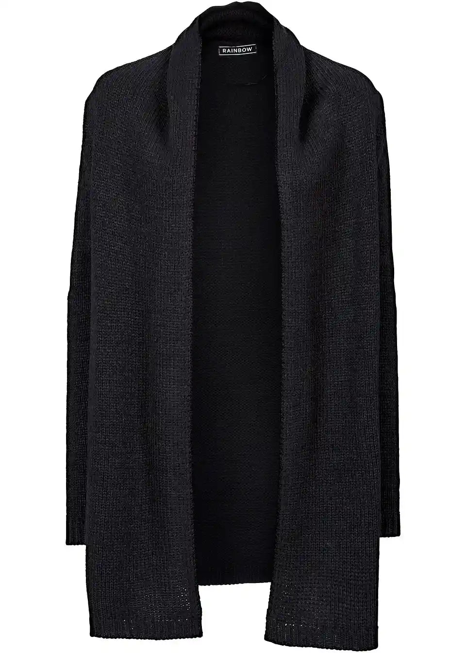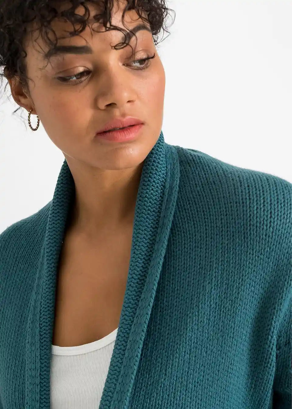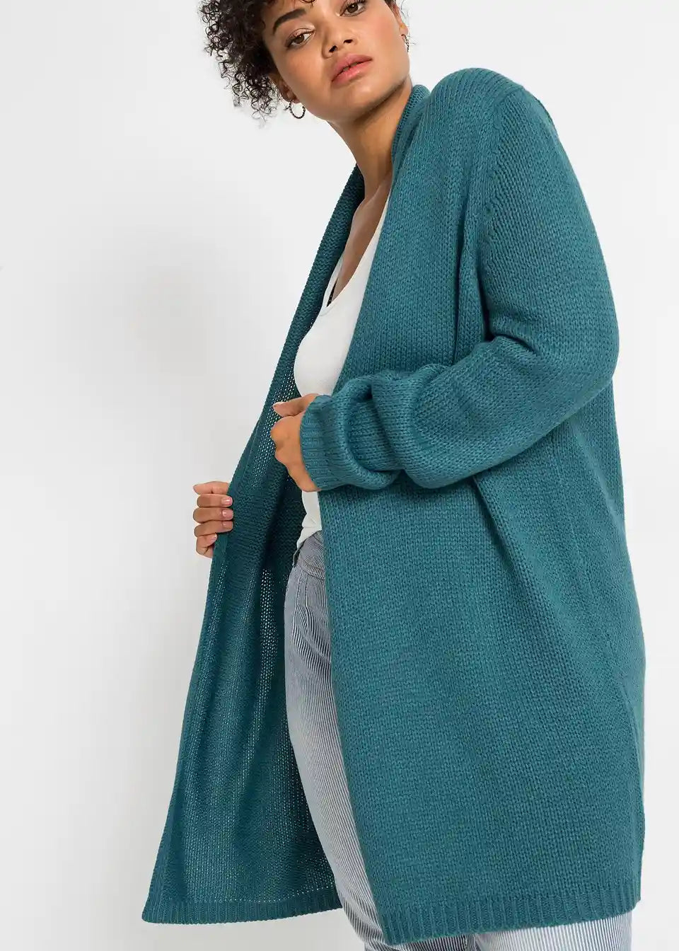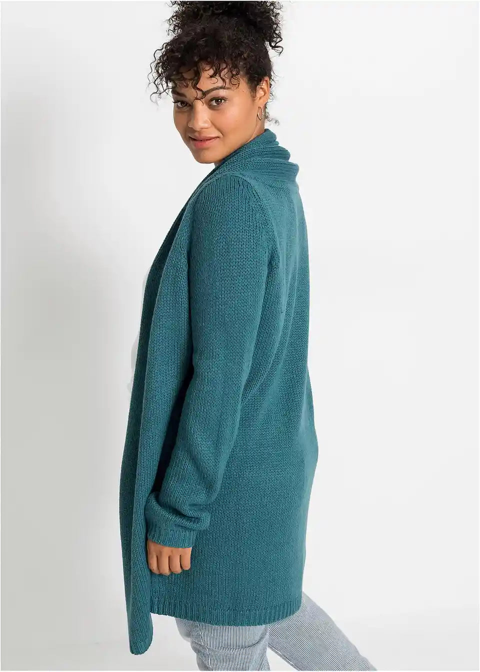 Priljubljen kos za hladnejše dni je ta trendovska pletena jopica. S svojim rahlo oversize krojem se sproščeno prilega telesu. Dolgi rokavi in rob so zaključeni z rebrastim pletenjem, ovratnik pa je sodobno zavihan. Pletena jopica se lahko sproščeno nosi čez stilizirane topke ali majice ter k ozkim kavbojkam.