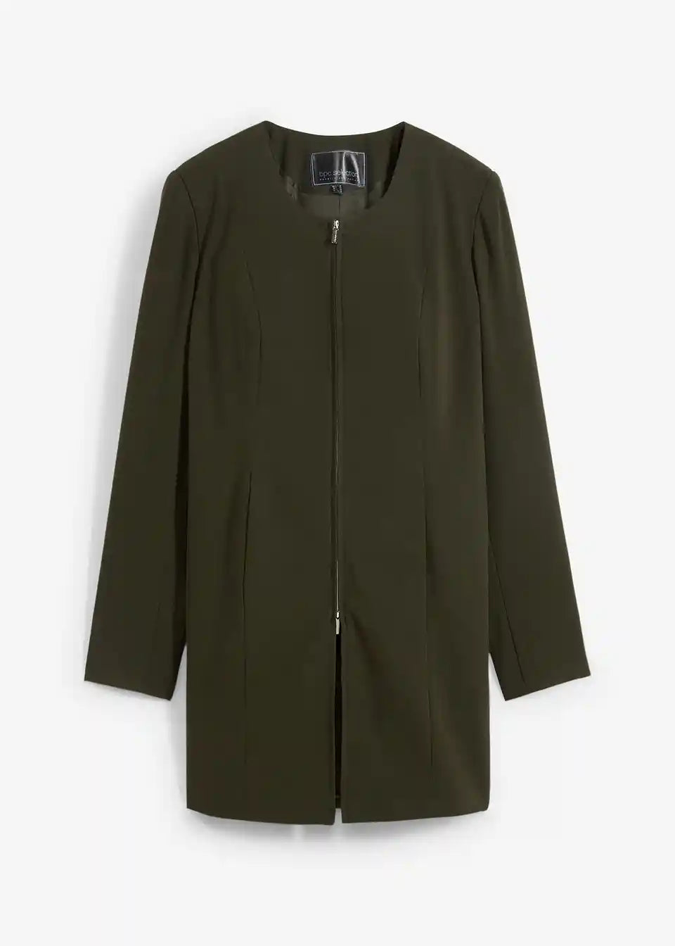 Prilega se postavi, dva žepa z zadrgo in zadrga za zapiranje, ramenski vložki, dolžina pribl. 82 cm pri vseh velikostih, pralno v stroju,