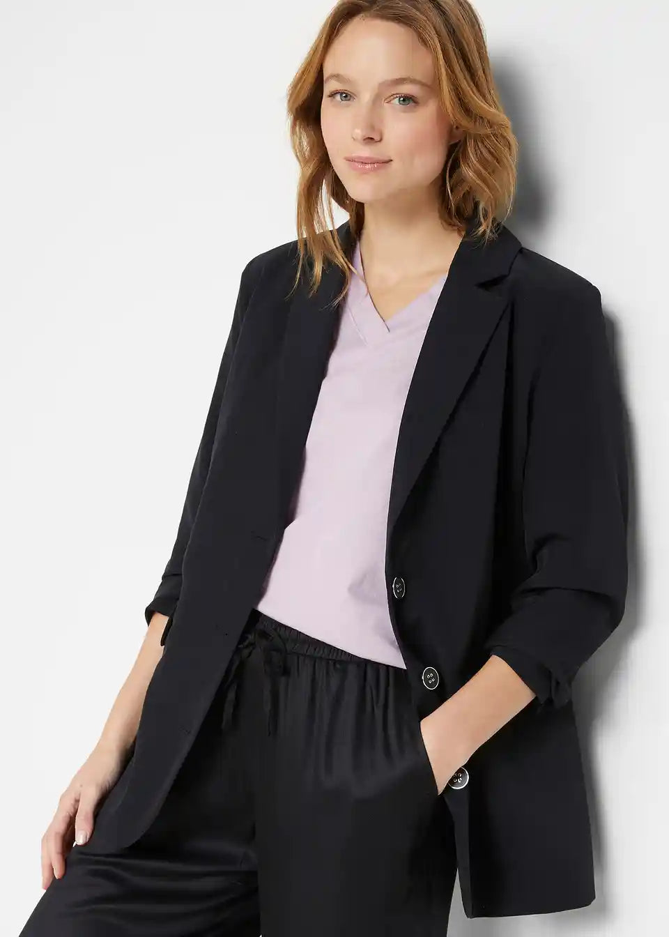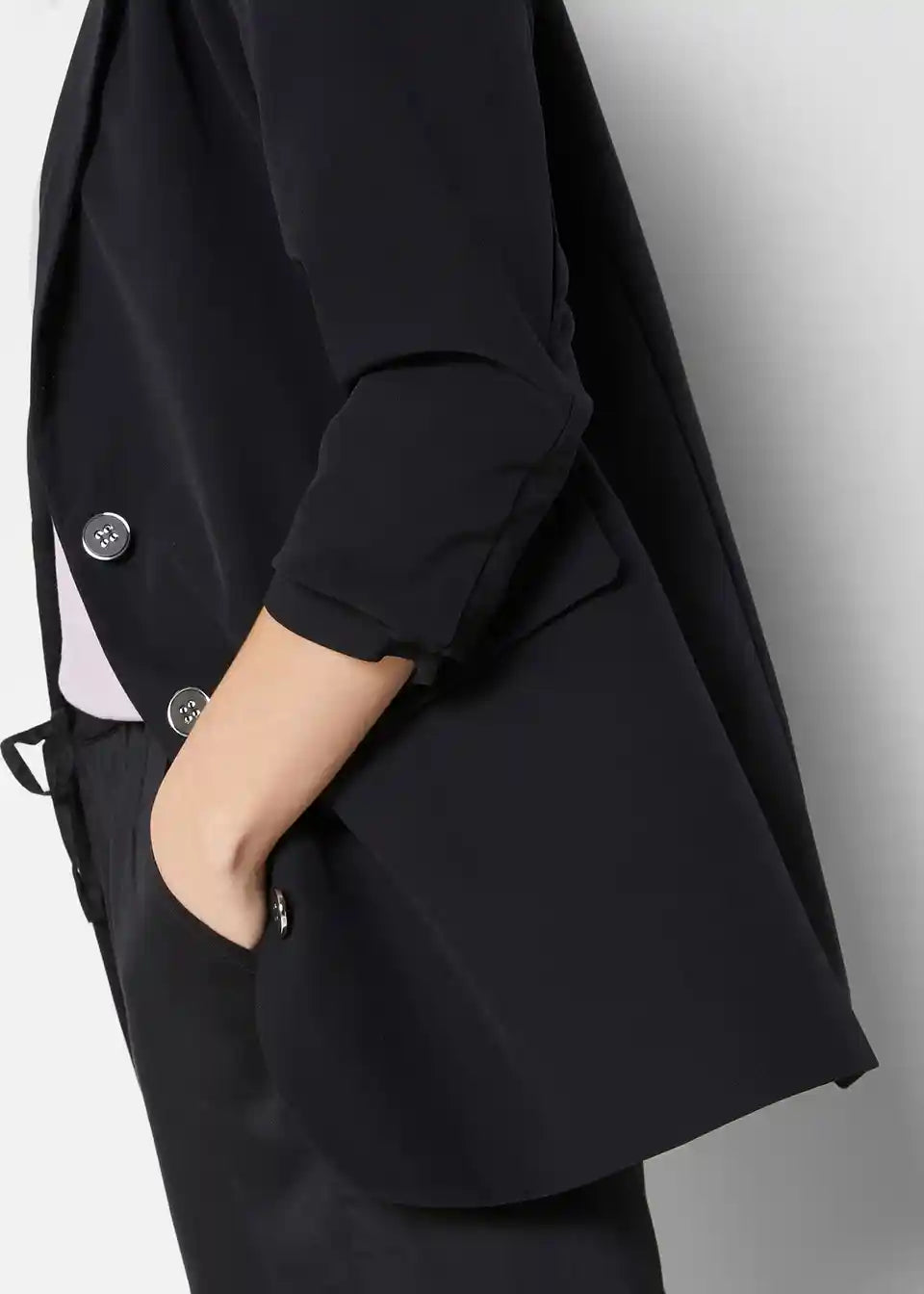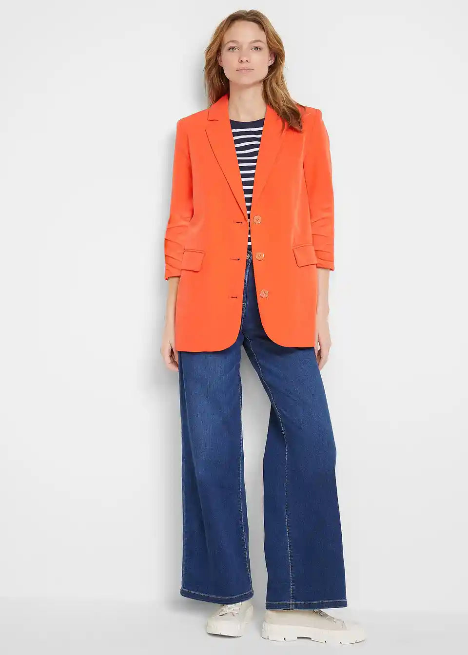 Ravno krojen dolgi blazer z modnimi naborki na rokavih