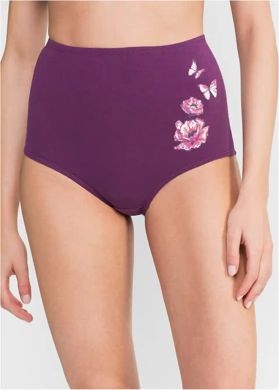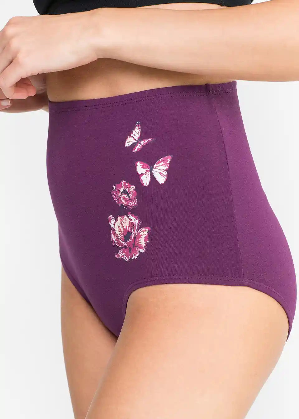 Ta slip prinaša spomladansko razpoloženje v osebno kolekcijo perila - in to kar petkrat. Trije izmed hlačk so enobarvni v vijolični in črni barvi, druga dva pa s potiskom cvetlic in metuljev ustvarjata romantičen pridih. Slip z visokim pasom prepriča z izjemno mehko kakovostjo in prijetnim bombažnim všitkom. Elastični robovi v pasu in na izrezih za noge poudarijo udobje nošenja in poskrbijo za dober oprijem.