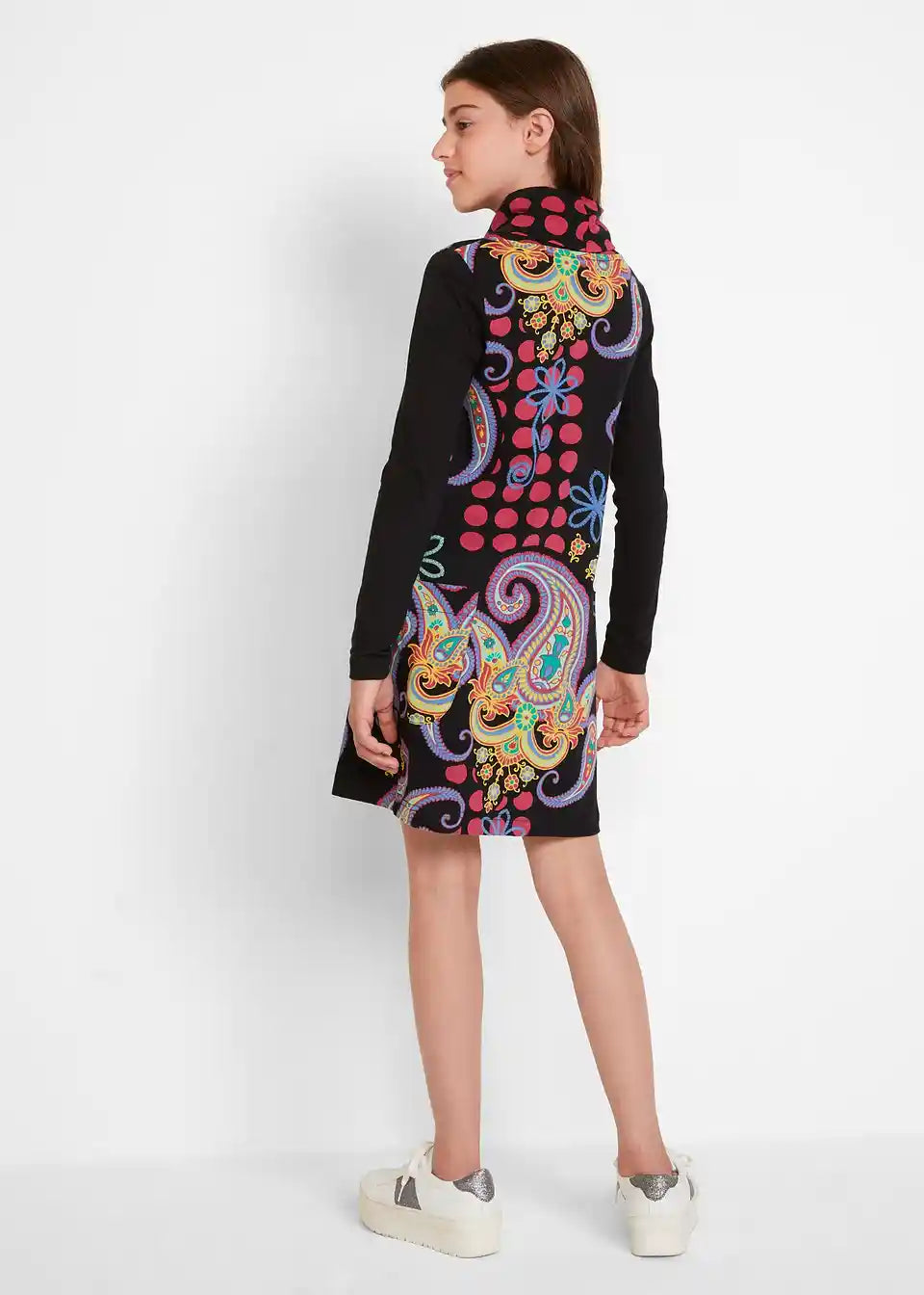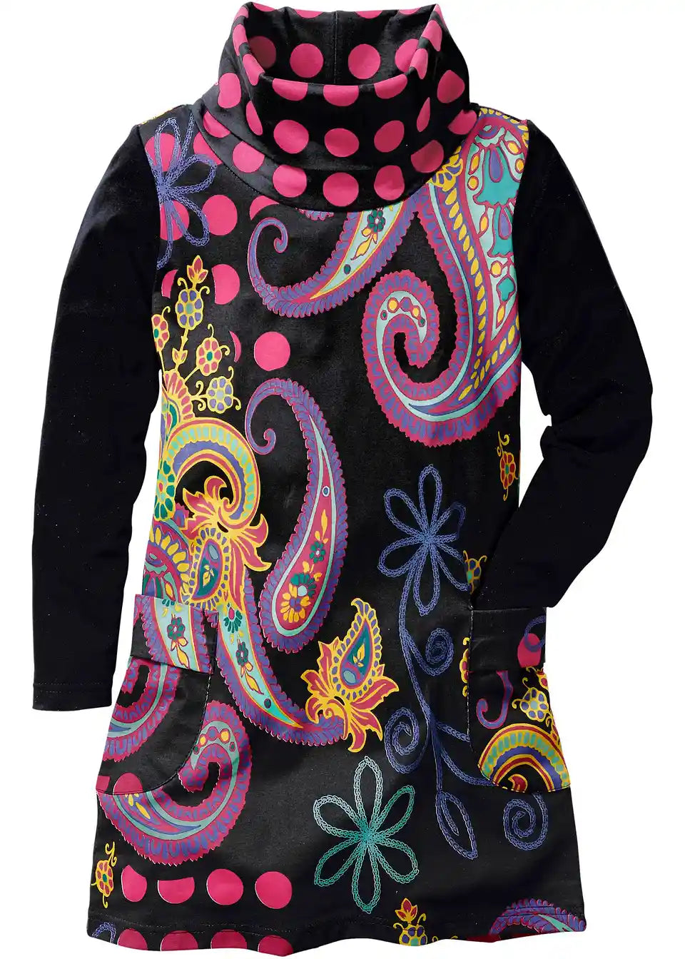 Ta obleka za deklice iz bpc navdušuje s svojim modnim kombiniranjem vzorcev. Dolgi, enobarvni rokavi so v kontrastu z vzorčastim osrednjim delom. Slednji je rahlo razširjen in opremljen z dvema všitima žepoma. Širok ovratnik je okrašen z velikimi pikami. V kombinaciji z legicami je obleka primerna tudi za hladnejše dni. Vsak kos je unikaten!