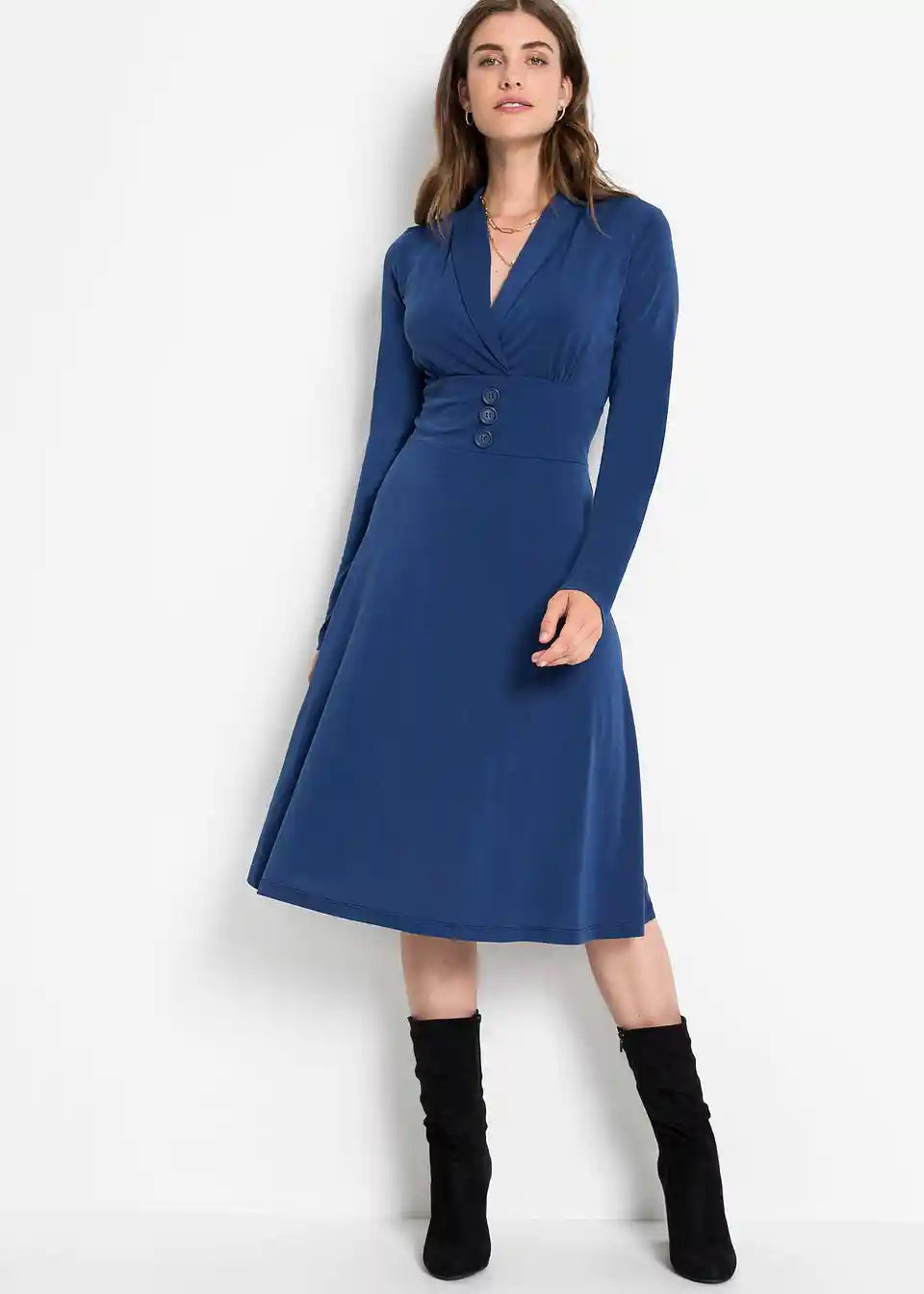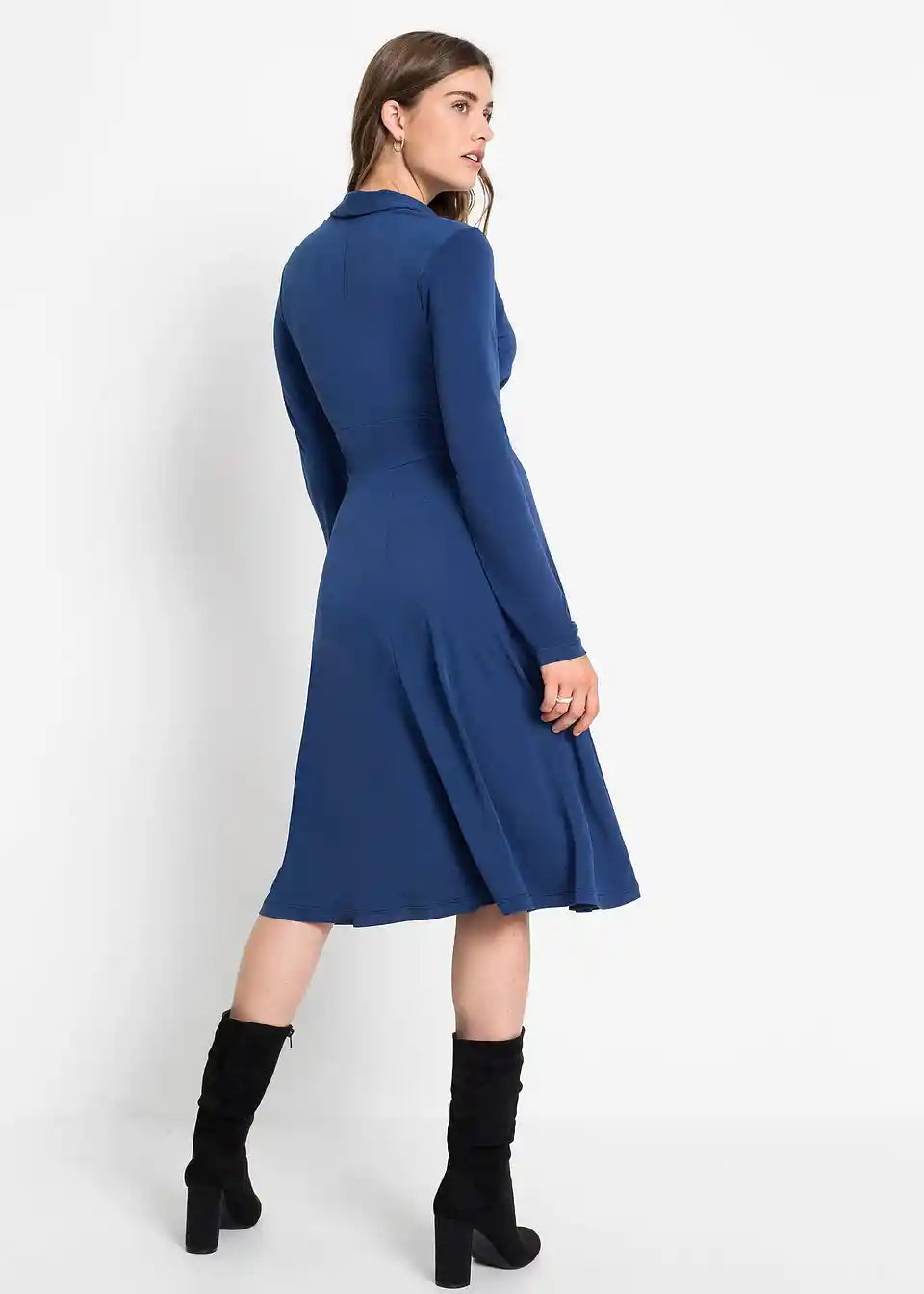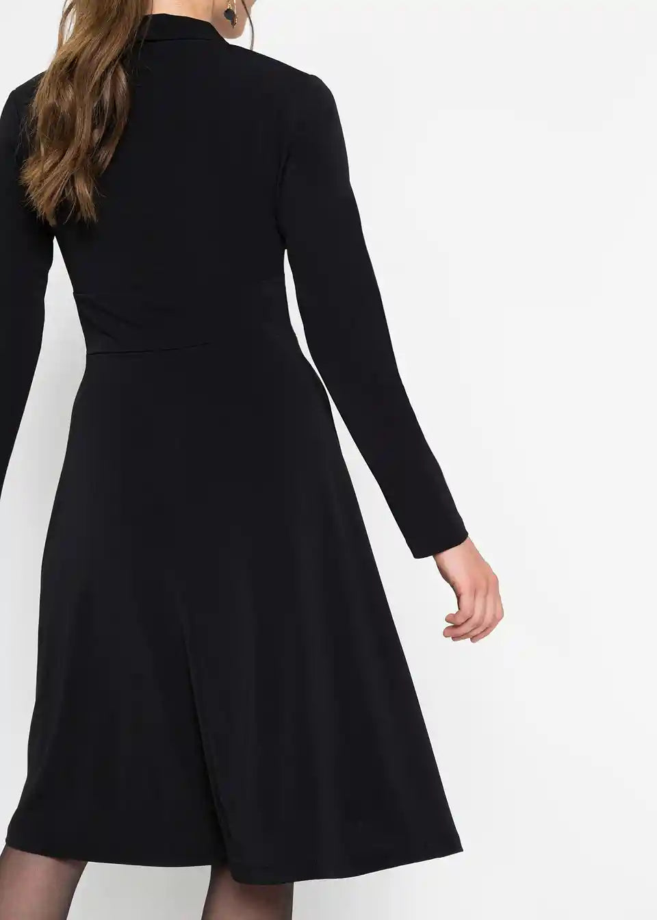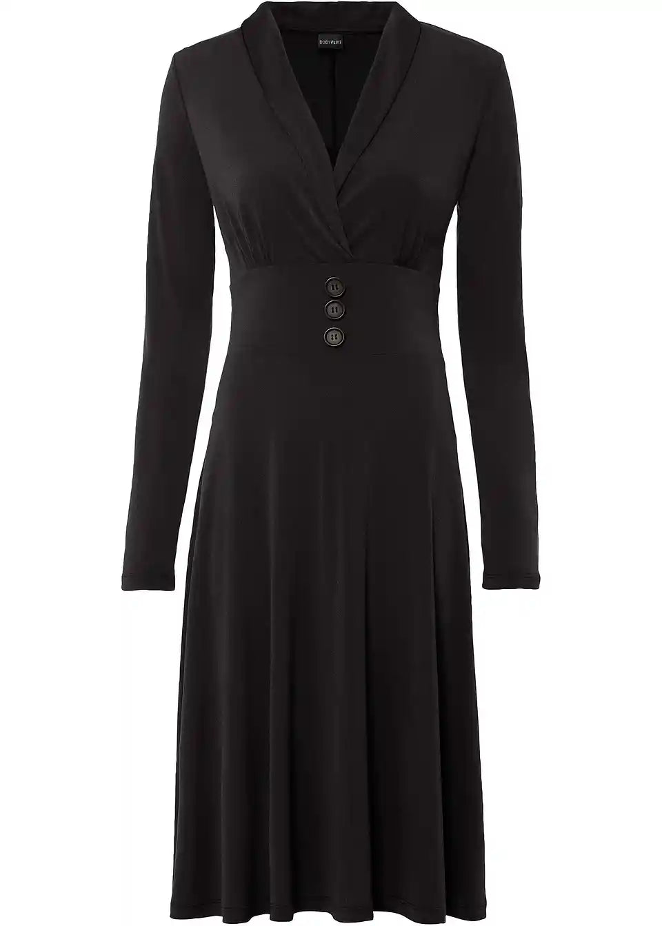Moderna Jersey obleka, okrašena z gumbi, obleka ima izrazit šal ovratnik.