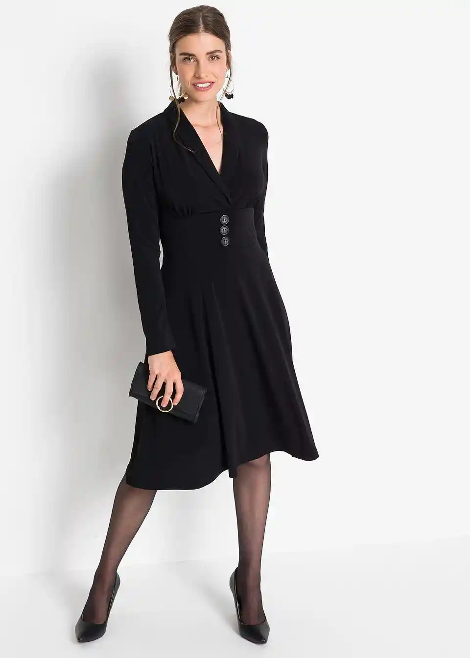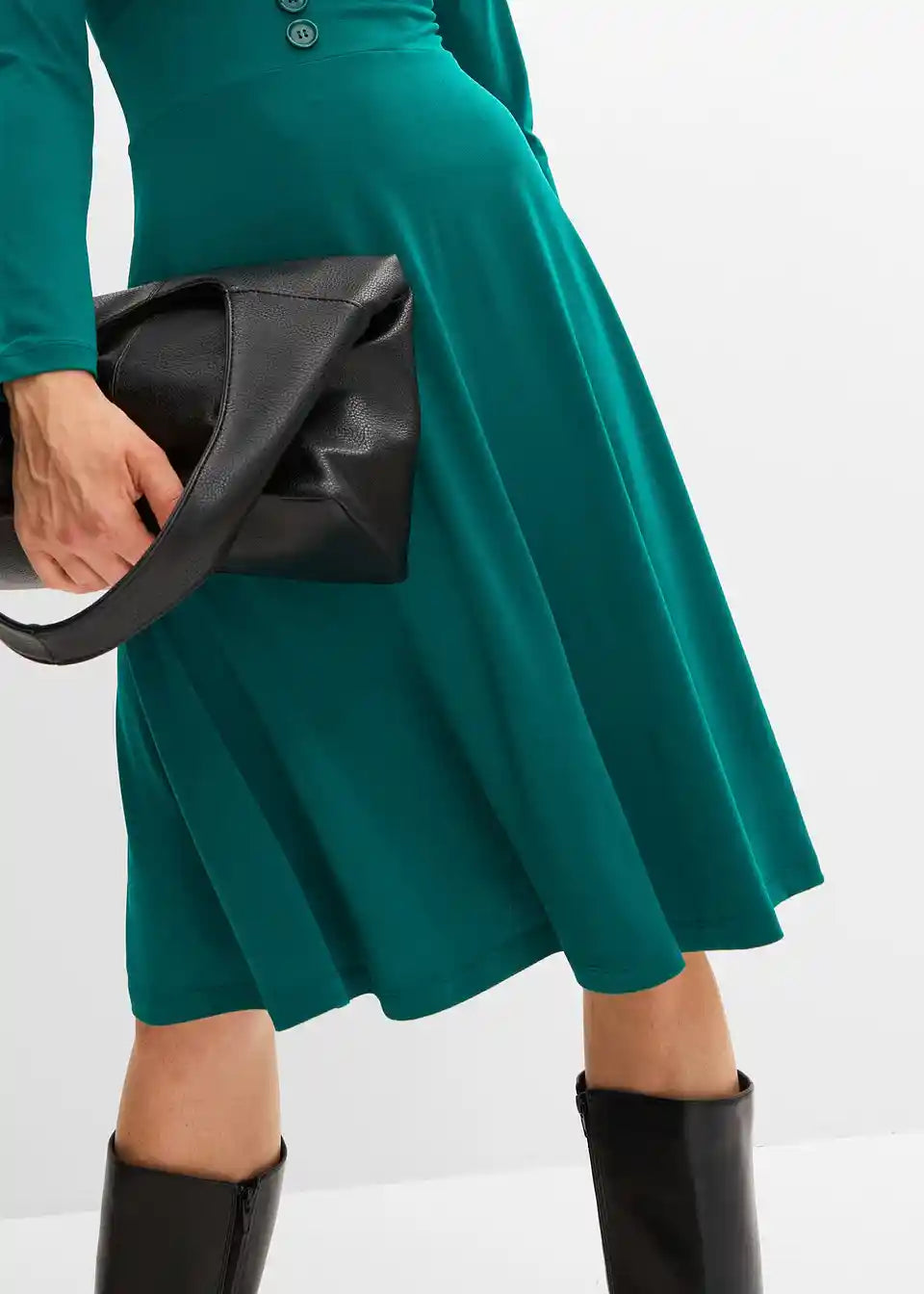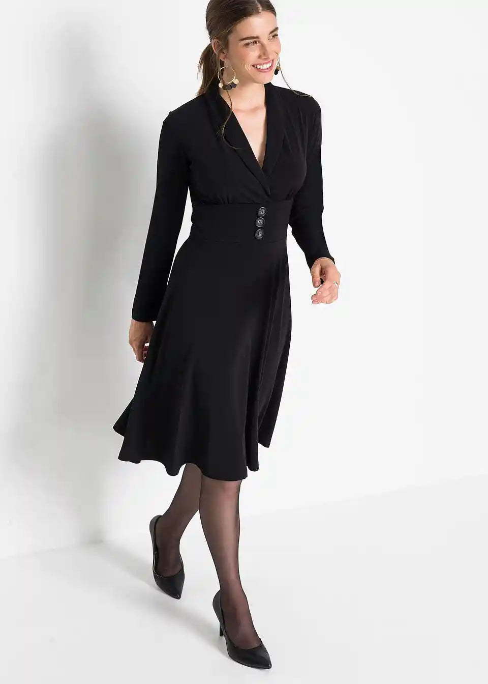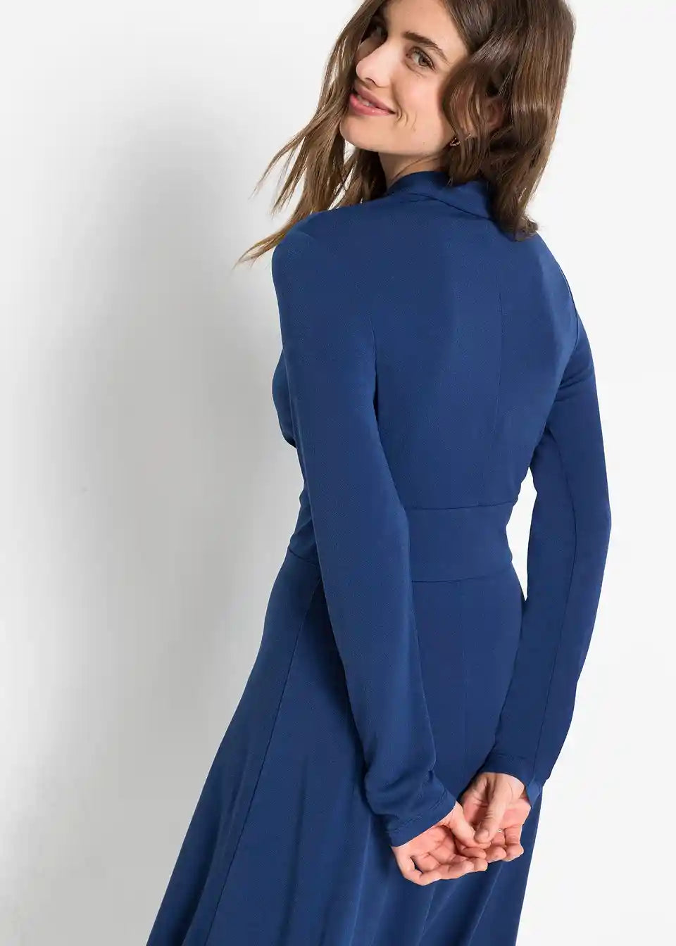 Moderna Jersey obleka, okrašena z gumbi, obleka ima izrazit šal ovratnik.