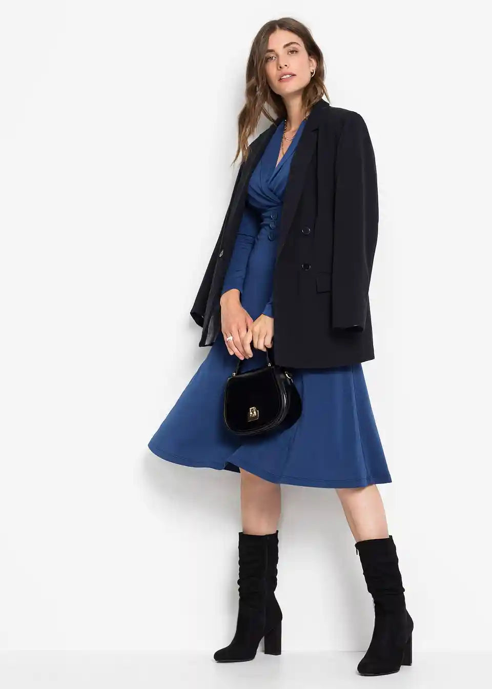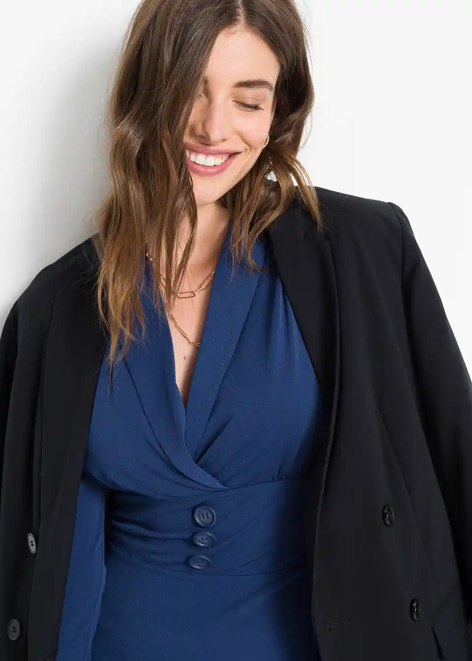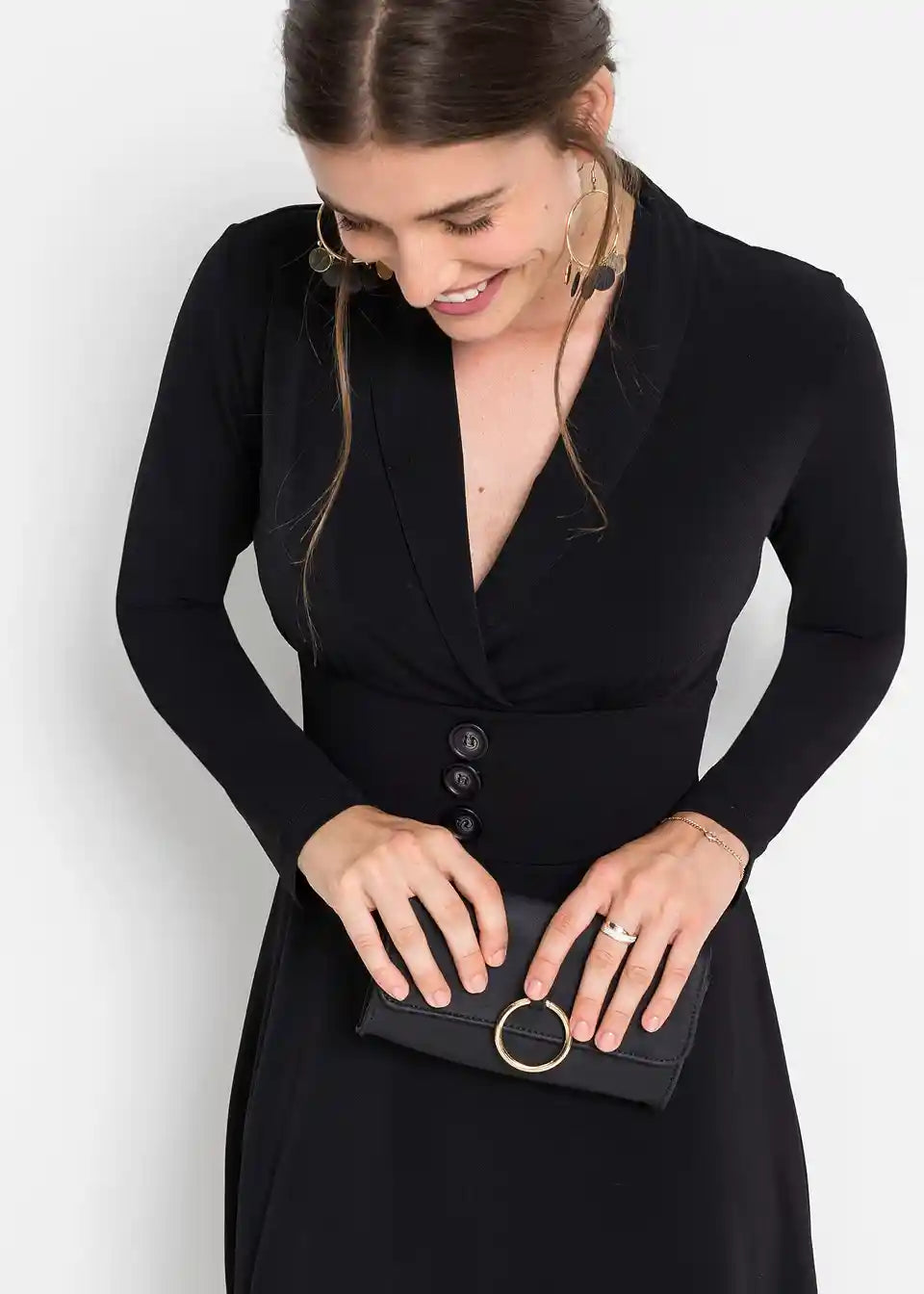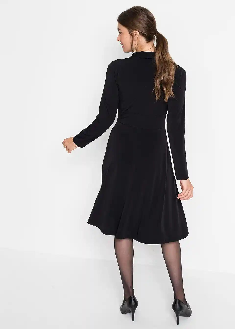 Moderna Jersey obleka, okrašena z gumbi, obleka ima izrazit šal ovratnik.
