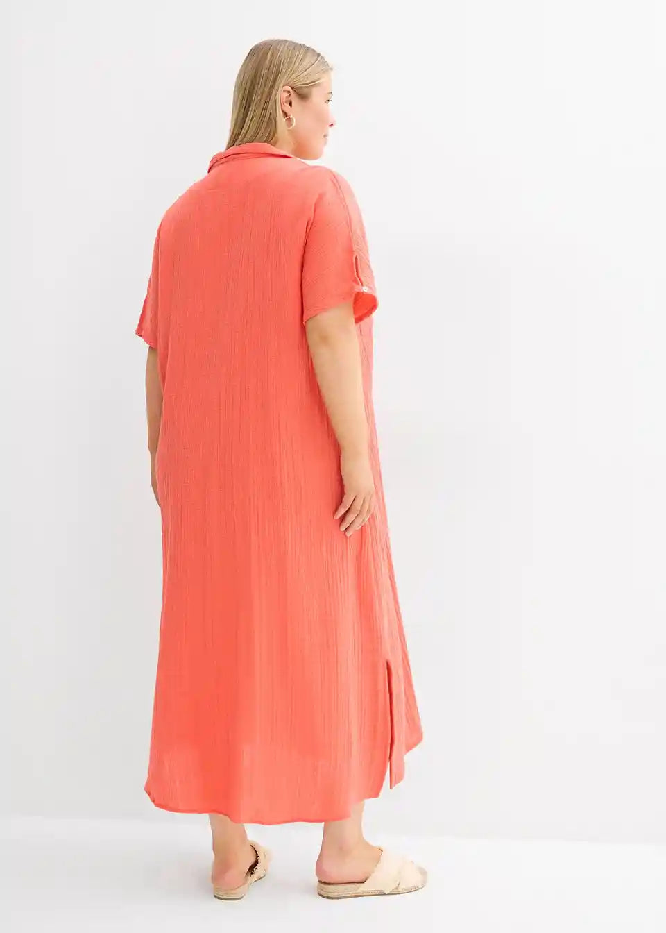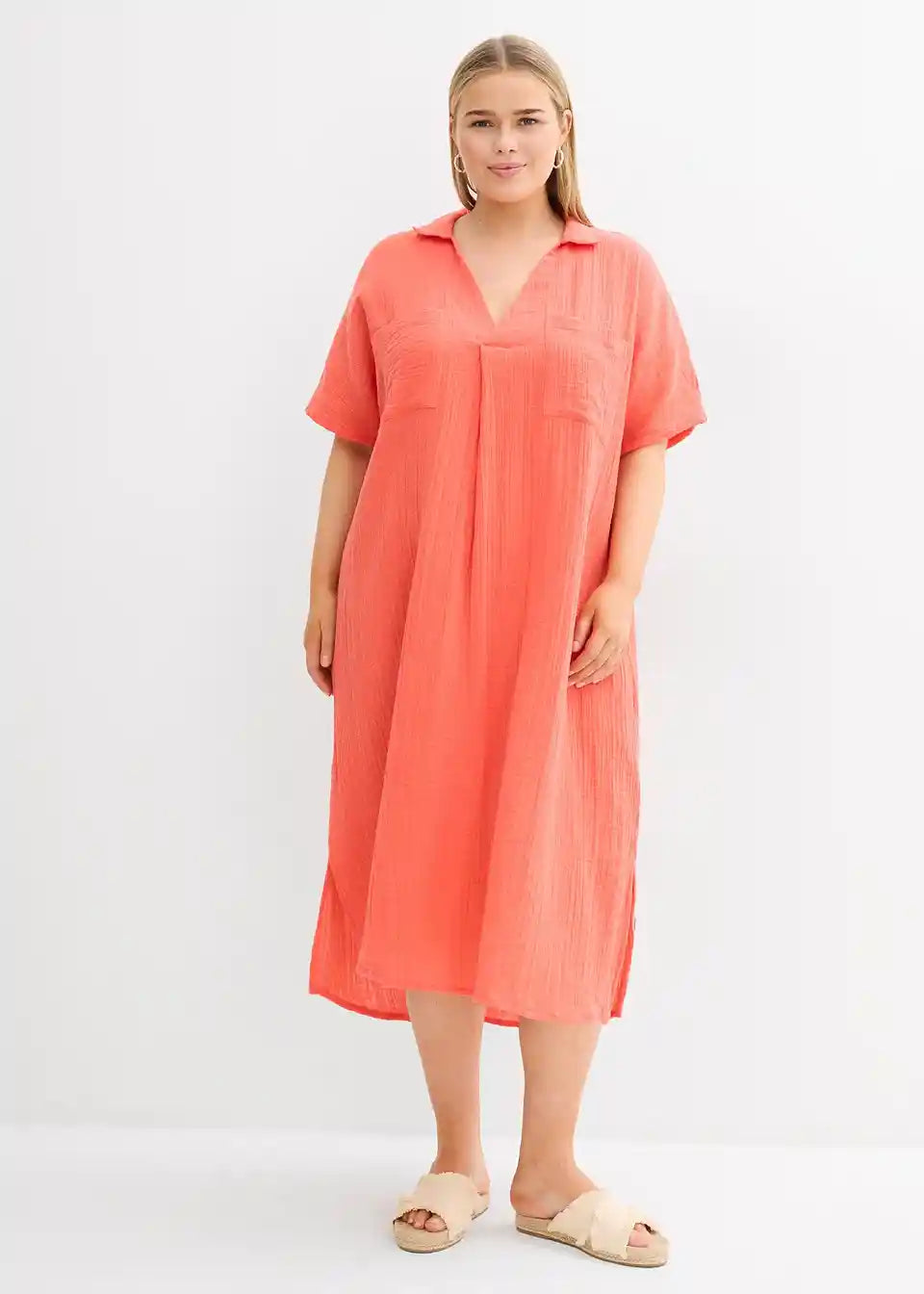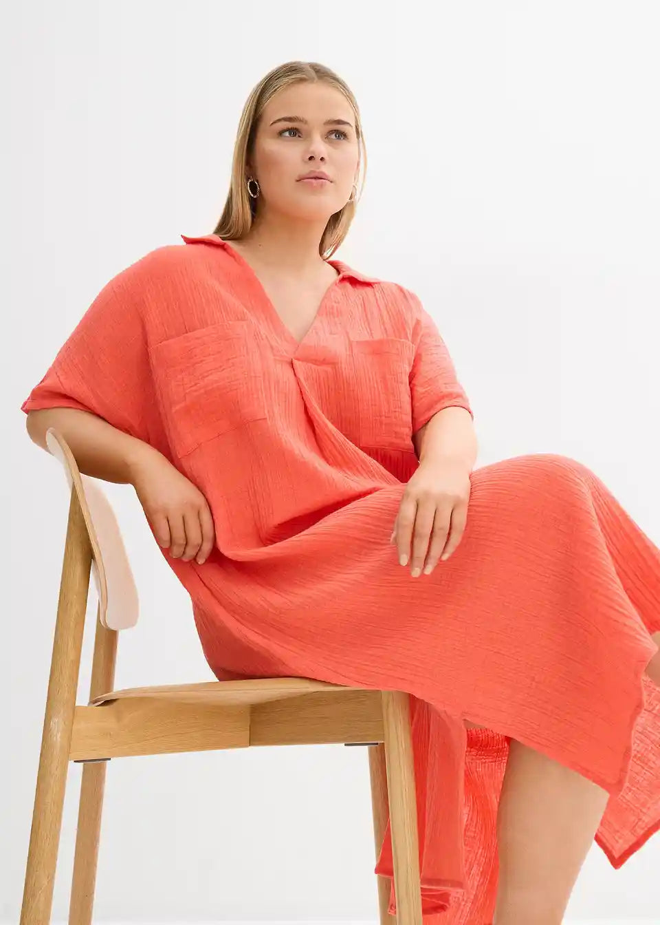 Kaftan obleka v ohlapnem kroju s kimonskimi rokavi in stranskimi razporki na spodnjem robu.