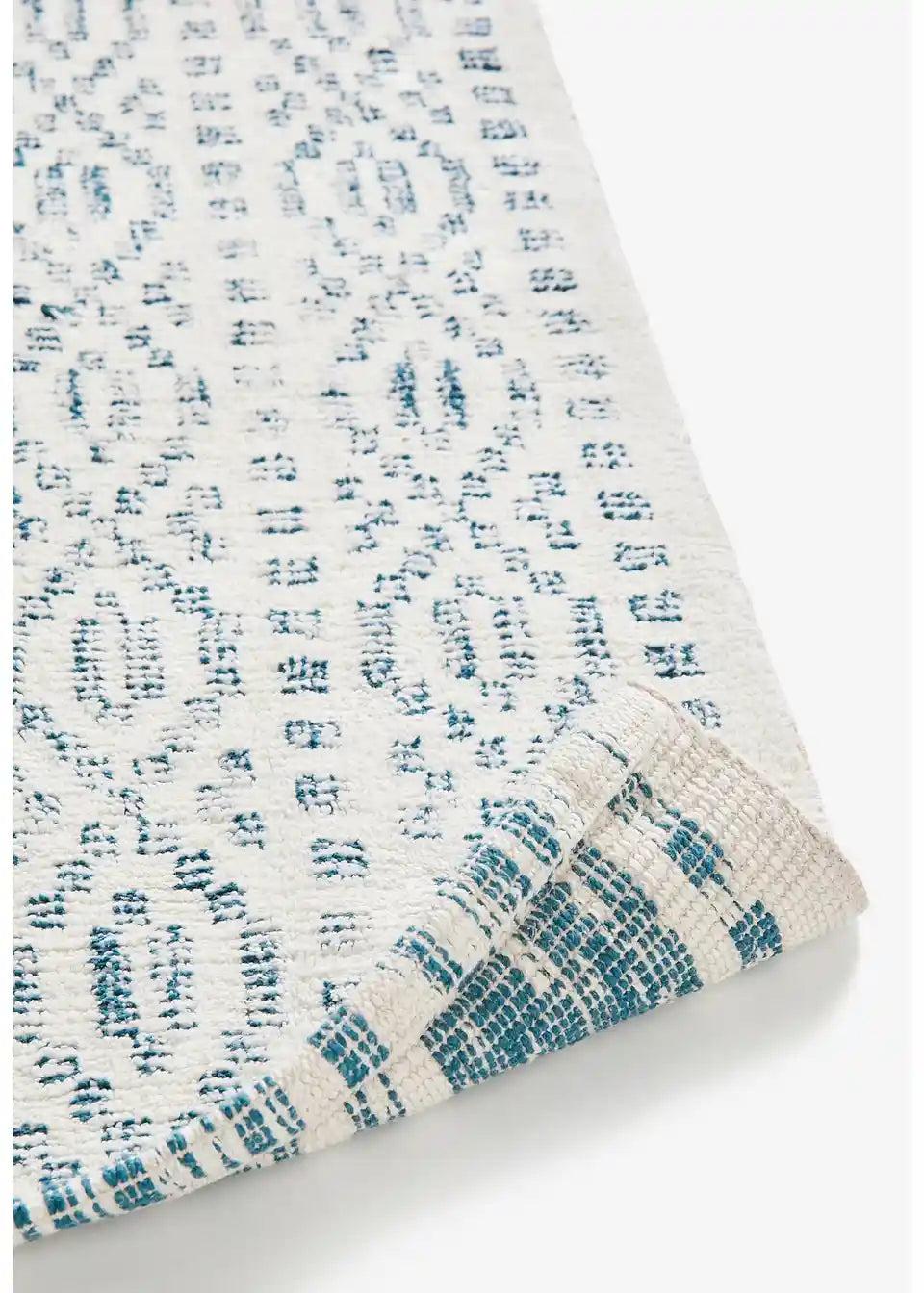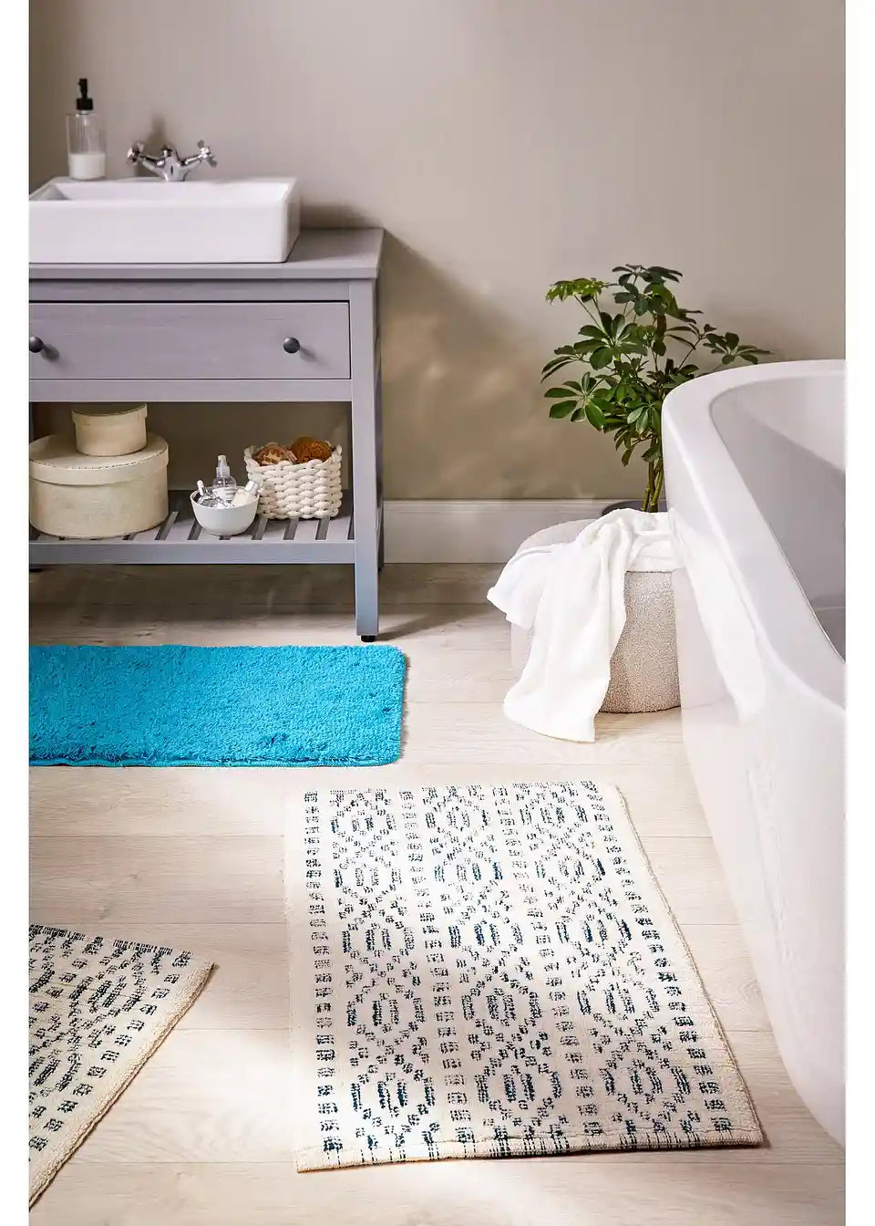 Ročno tkana kopalniška preproga, pralna pri 30 °C, hrbtna stran protidrsna, primerna za talno gretje.