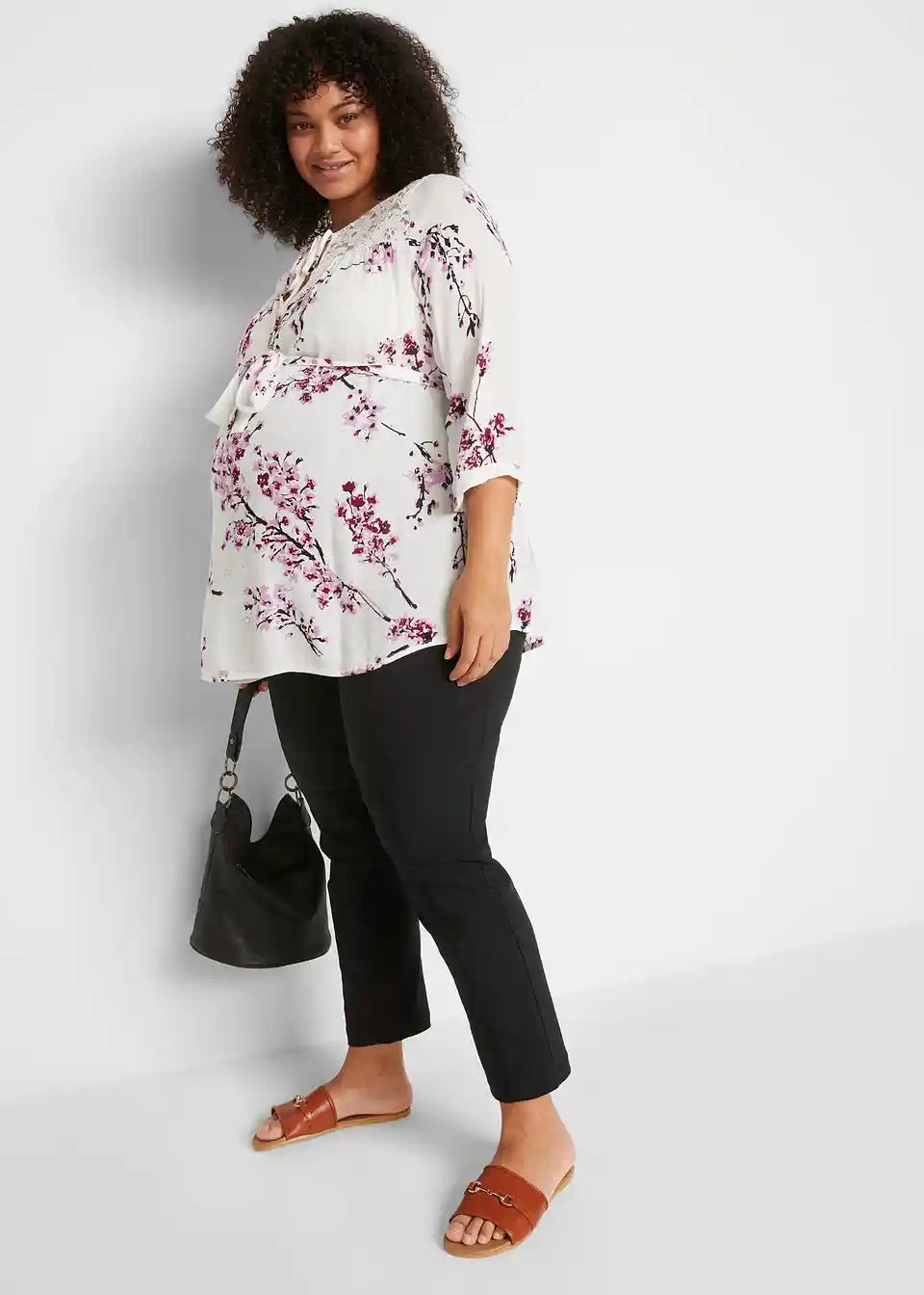 S pomočjo vezalnega traku je možno to nosečniško bluzo s 3/4-rokavi individualno prilagoditi po širini. Tako se udobno prilega v različnih mesecih nosečnosti. Zmečkan videz in detajl vezanja na izrezu dodata bluzi poseben videz.