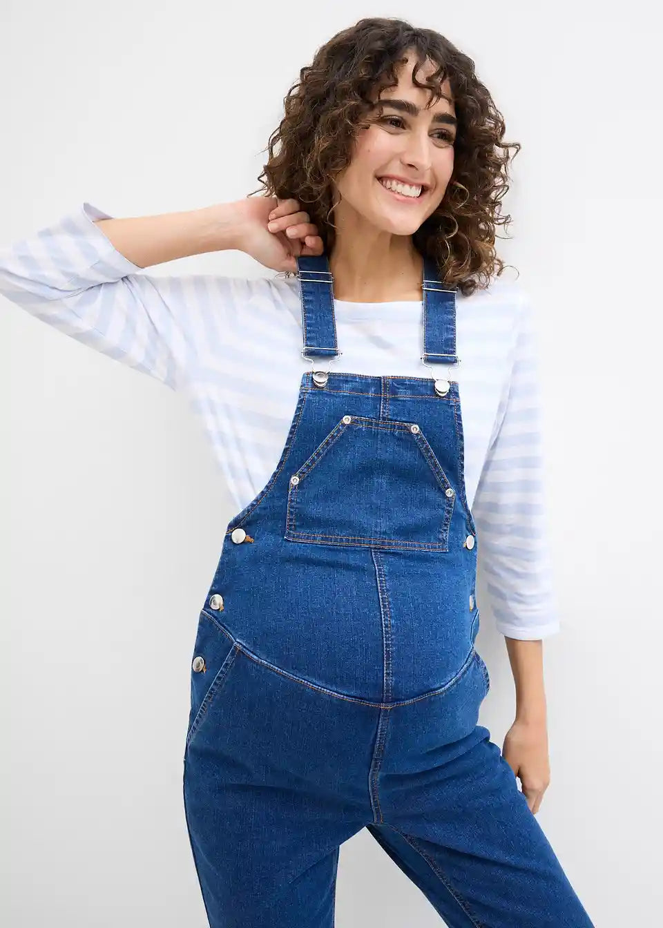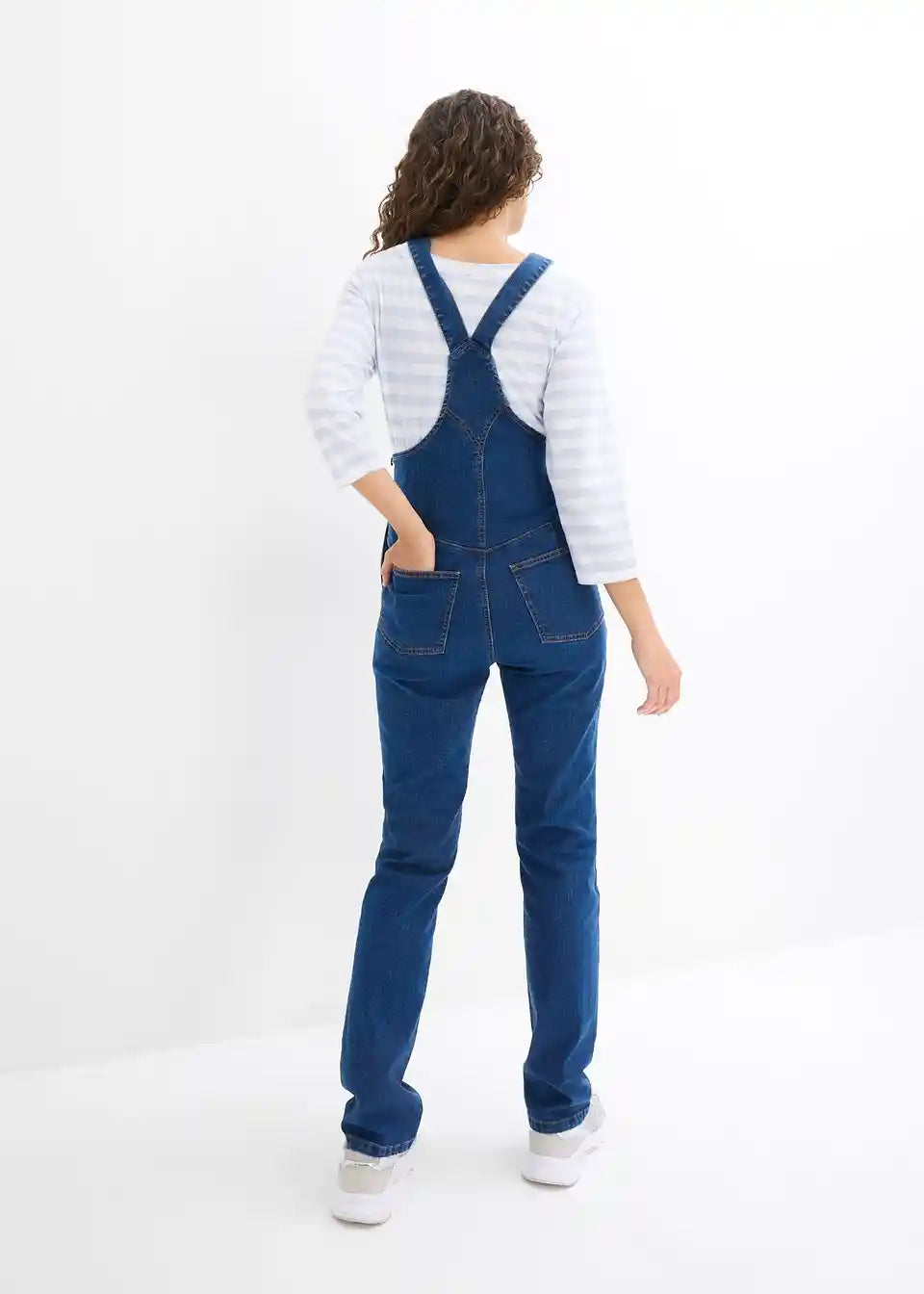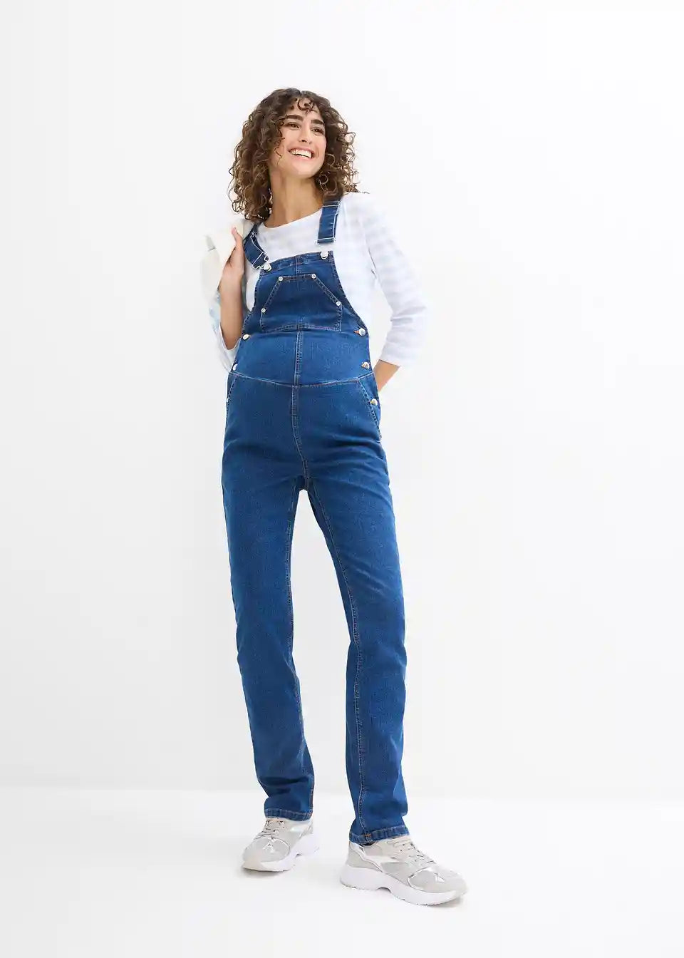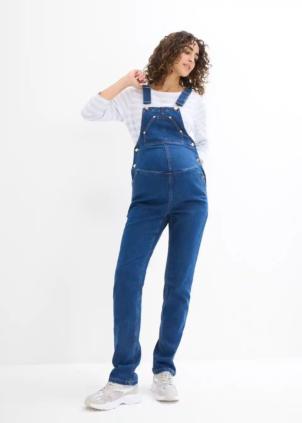 Nosečniške kavbojke z naramnicami iz mehkega raztegljivega denima imajo modne in hkrati priročne prsne, stranske in zadnje žepe. Nastavljivi stranski vstavki omogočajo prilagajanje širini trebuha. Tudi naramnice se lahko udobno prilagajajo po dolžini.