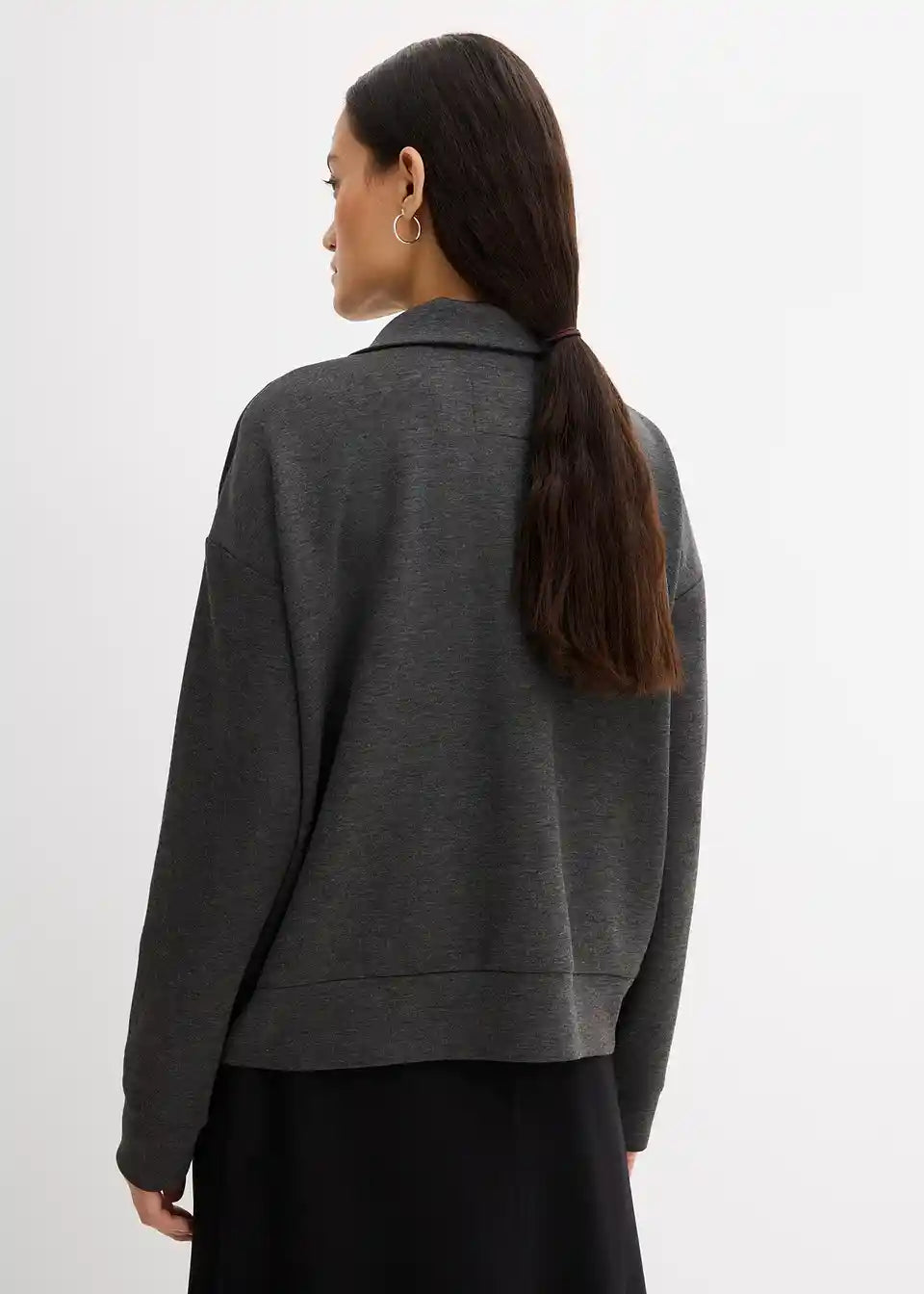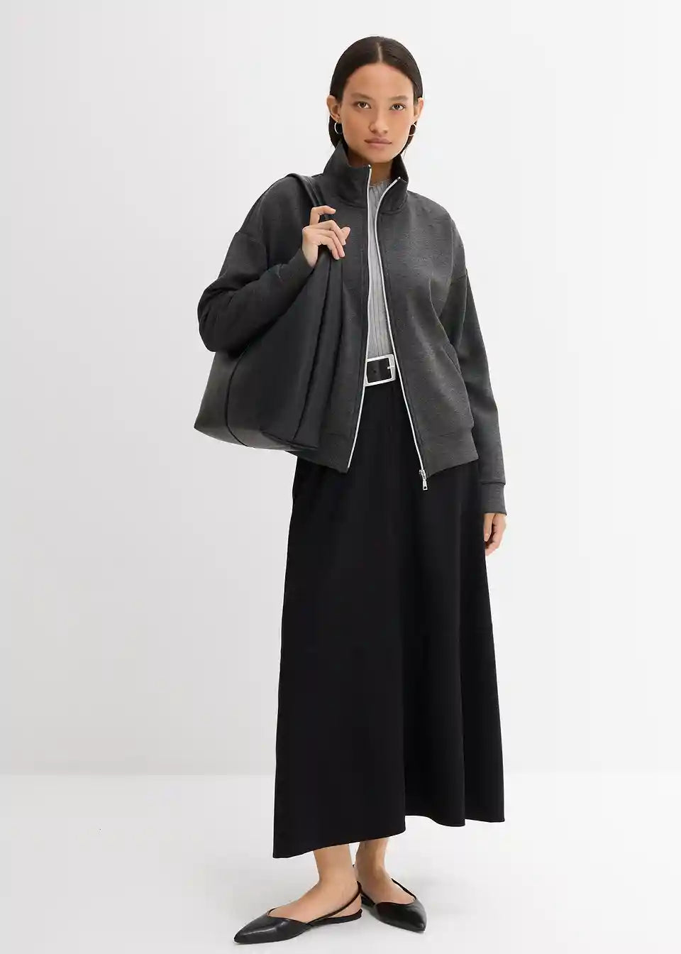 Ohlapna jakna iz debelejšega scuba materiala s pokončnim ovratnikom, zadrgami spredaj, v rokave podaljšanimi ramami in žepi z letvico spredaj