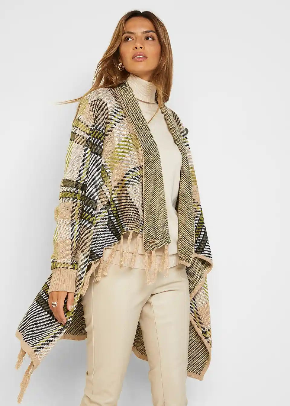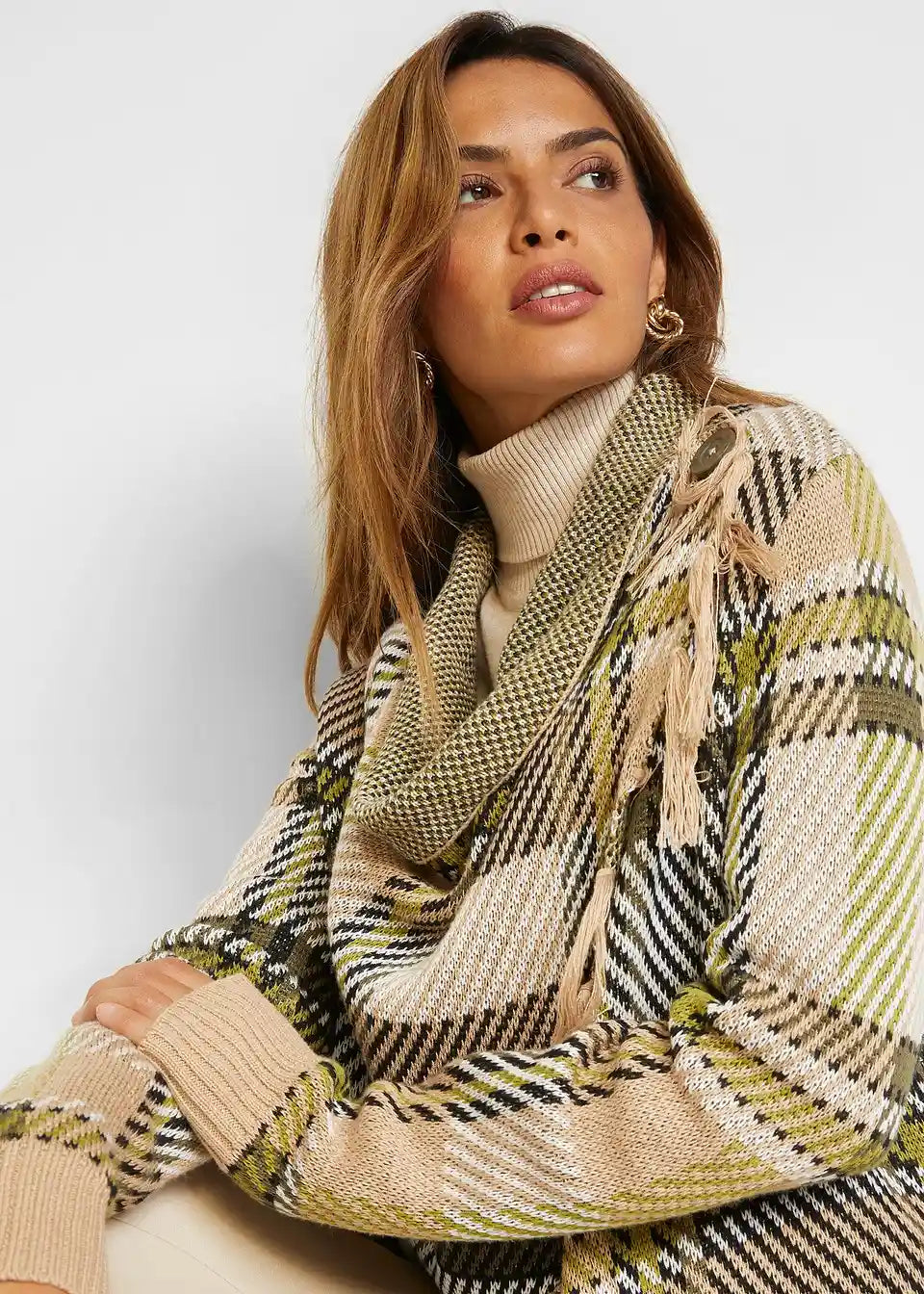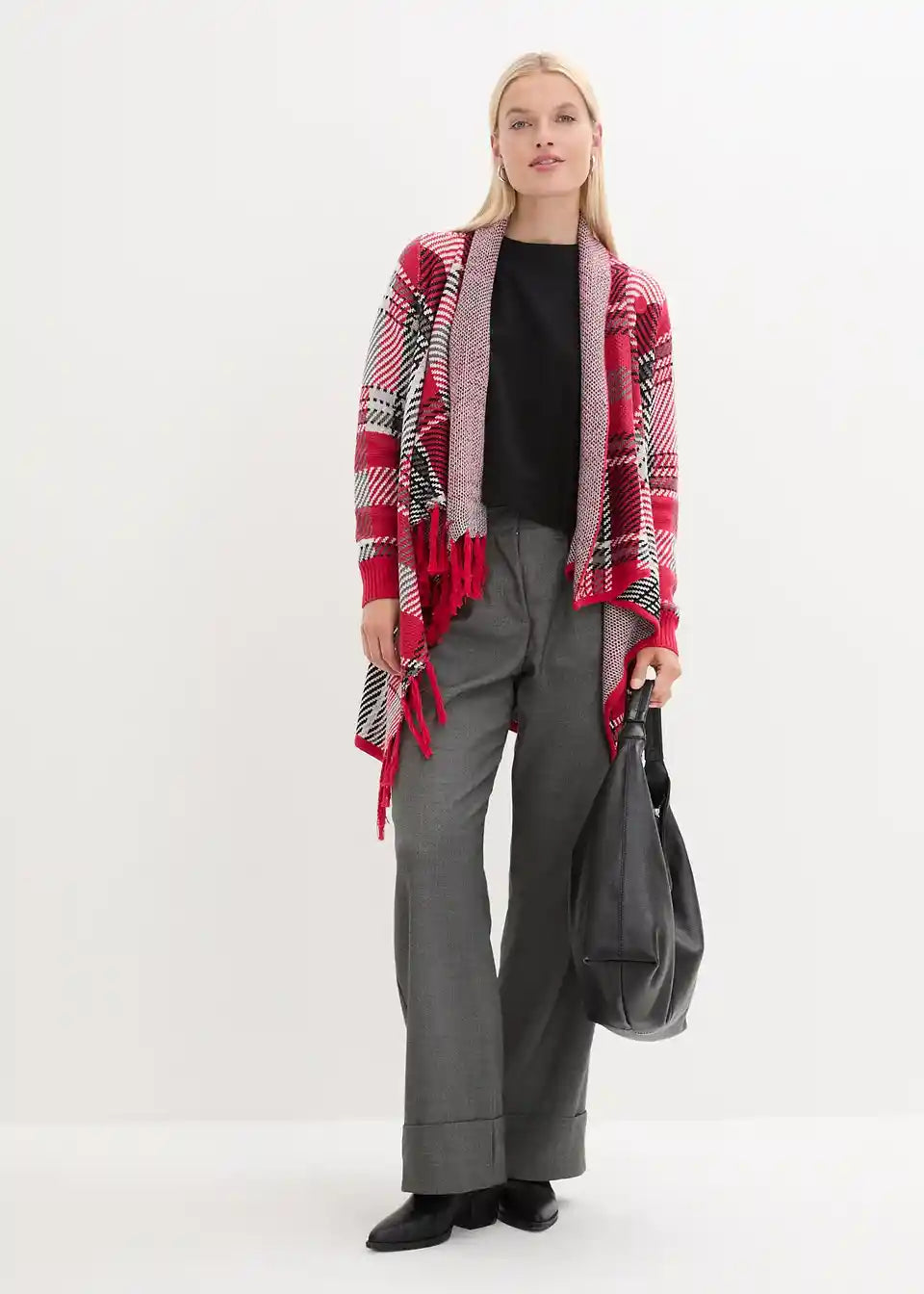 Udobna pletena jopica v asimetričnem kroju z resicami
