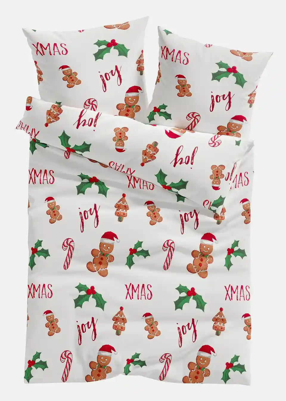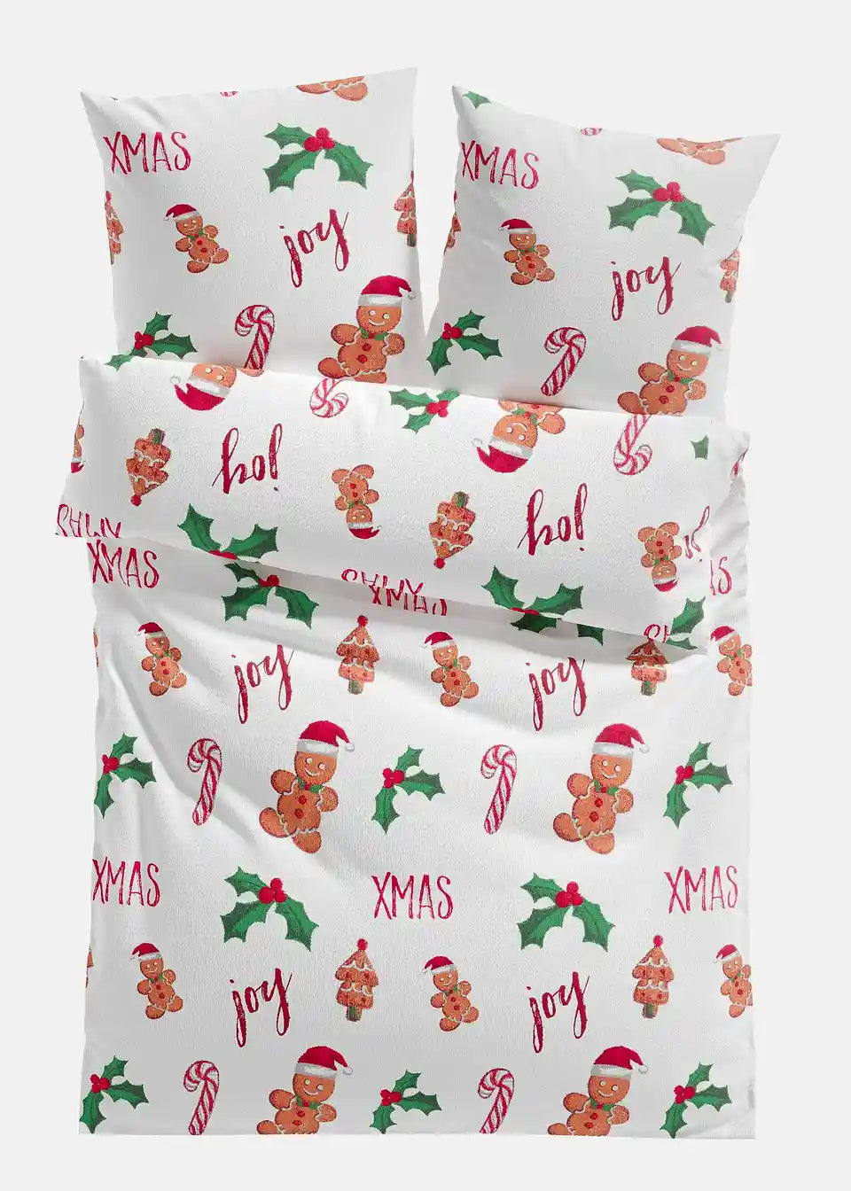 osteljnina z motivom medenjakovih mož in sladkornih palčk po celotni površini pričara praznično vzdušje v spalnici.