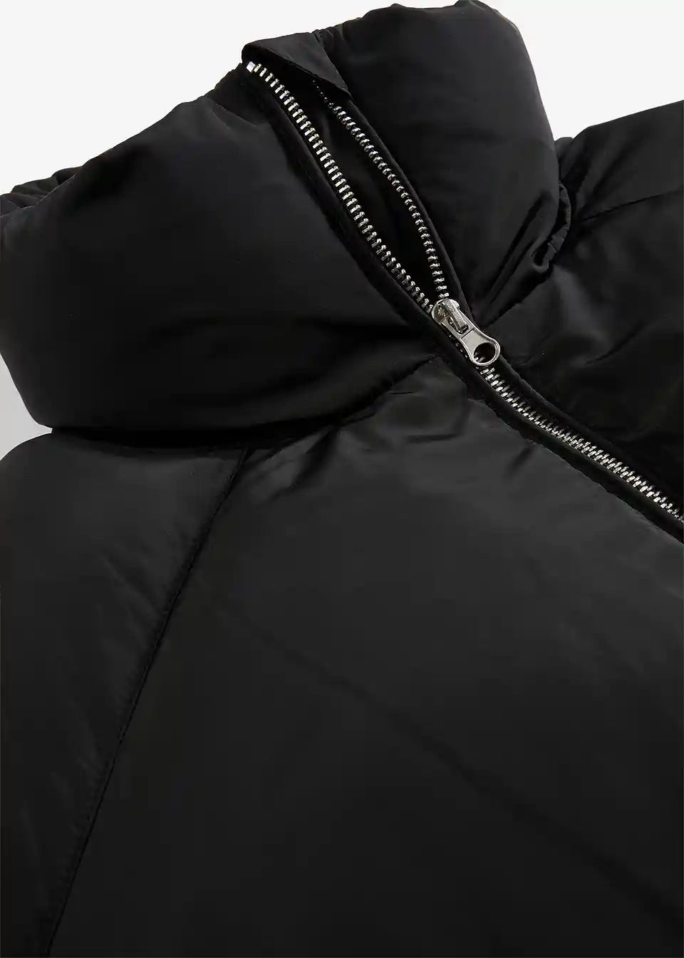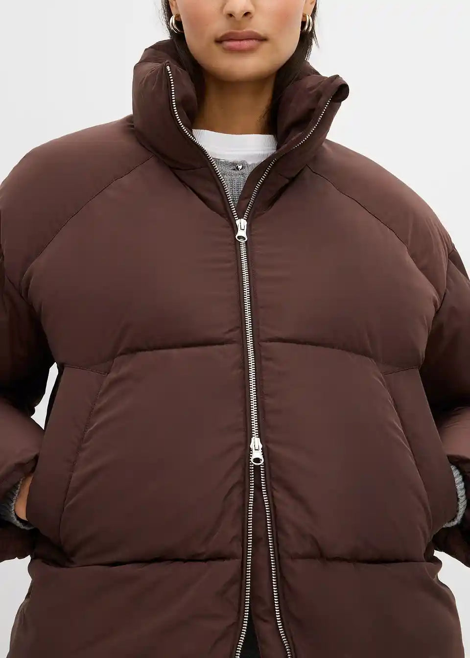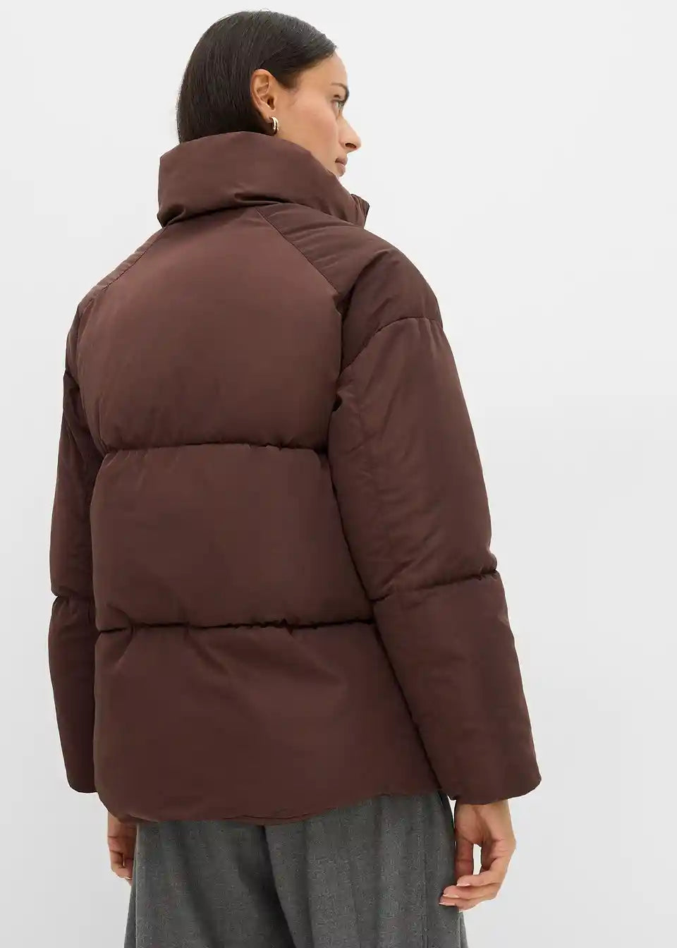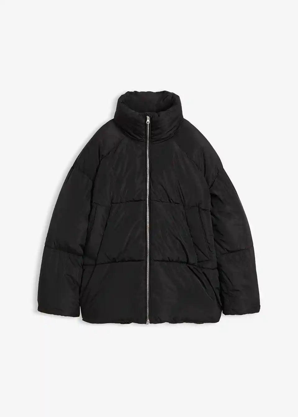 Široko krojena prešita jakna s poševnimi žepi z letvico spredaj in v rokave podaljšanimi ramami