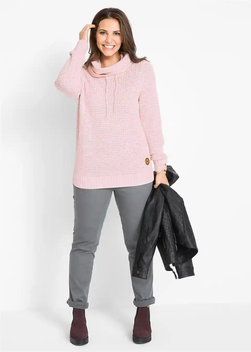 Ta pulover znamke bpc je vsestranski kos, ki izžareva sproščenost. Pleteni pulover z zanimivim vzorcem se odlično kombinira z udobnimi kavbojkami, romantičnim maksi krilom ali trendovskimi pajkicami. Dekorativni elementi so majhen našitek in zaključki vrvic na ovratniku iz imitacije usnja. Širok visok ovratnik, reglan rokavi ter visoki patentni zaključki na rokavih modno zaokrožijo ta prijeten pulover.