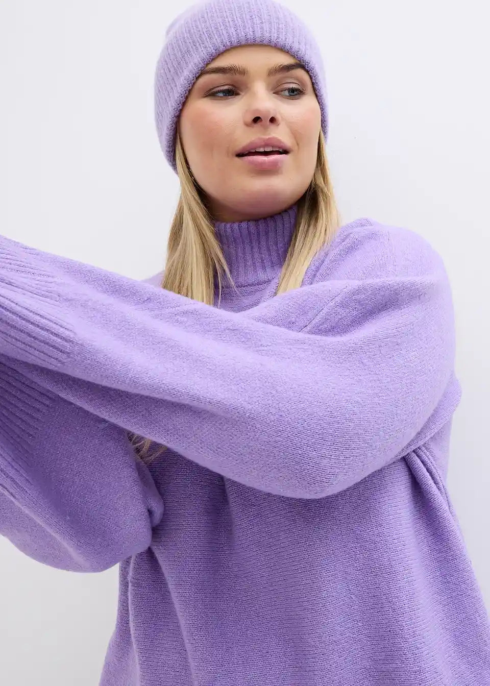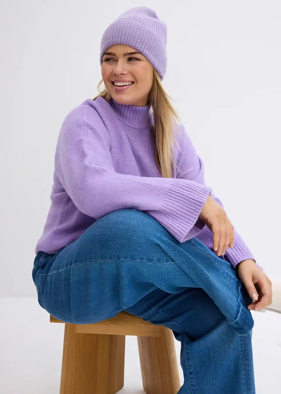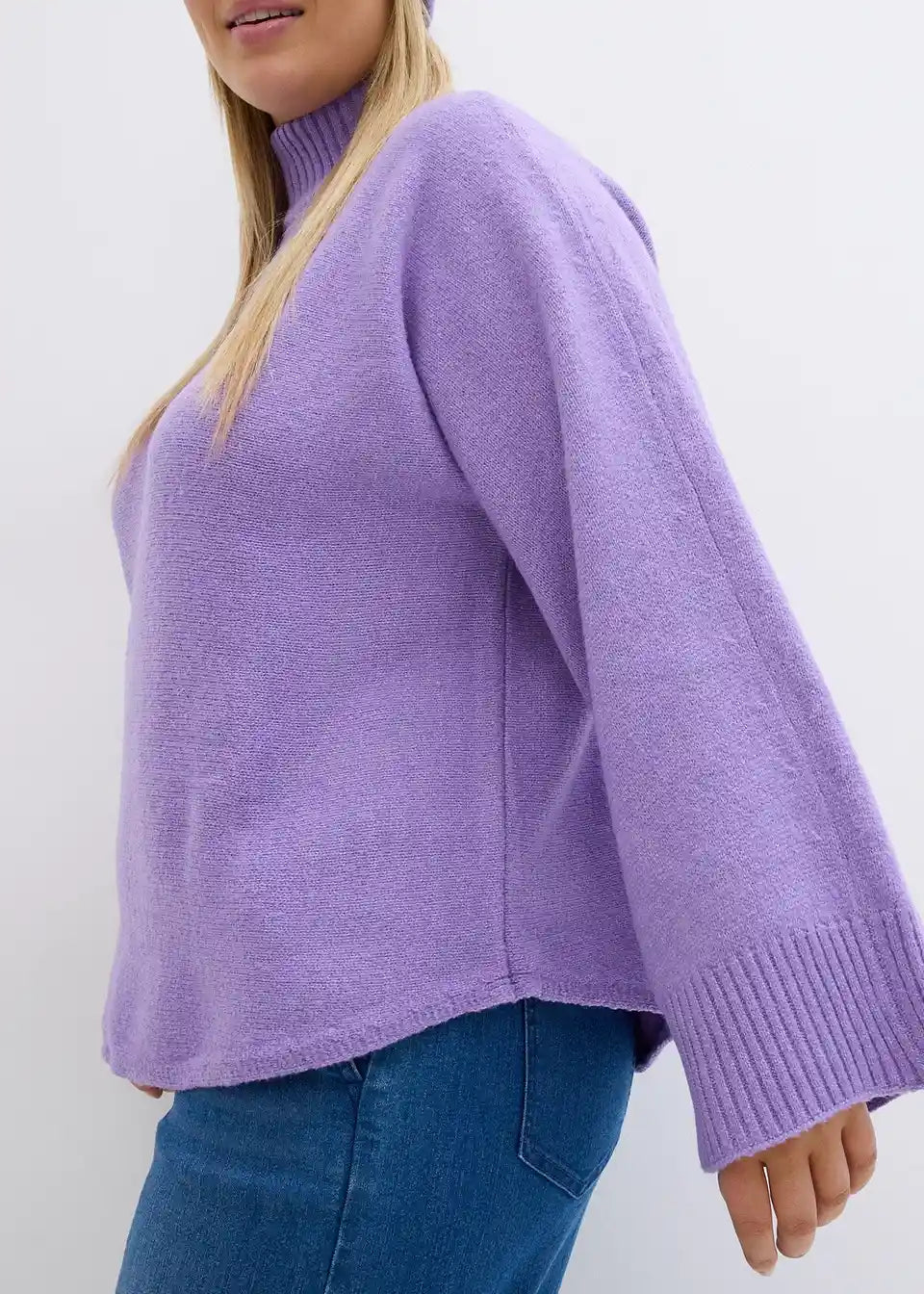 Moderen Pulover s Stoječim Ovratnikom, zaobljenim Robom in širokimi Rokavi