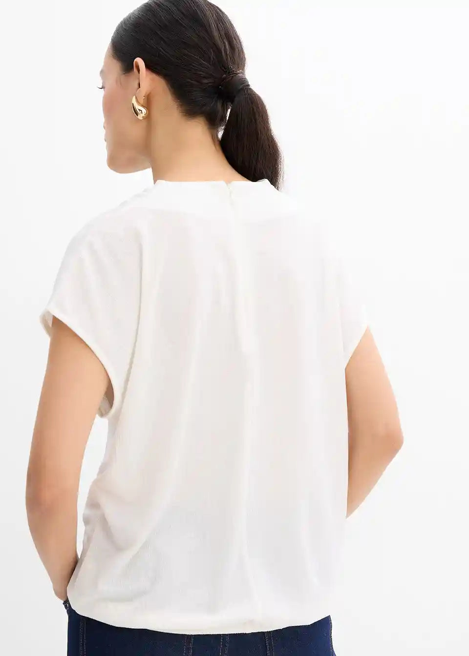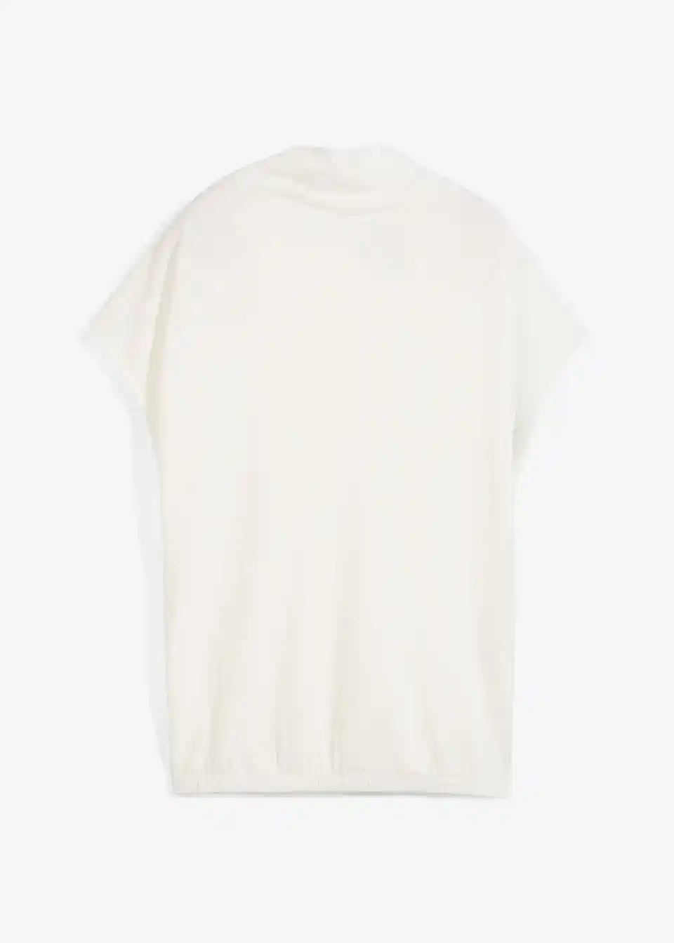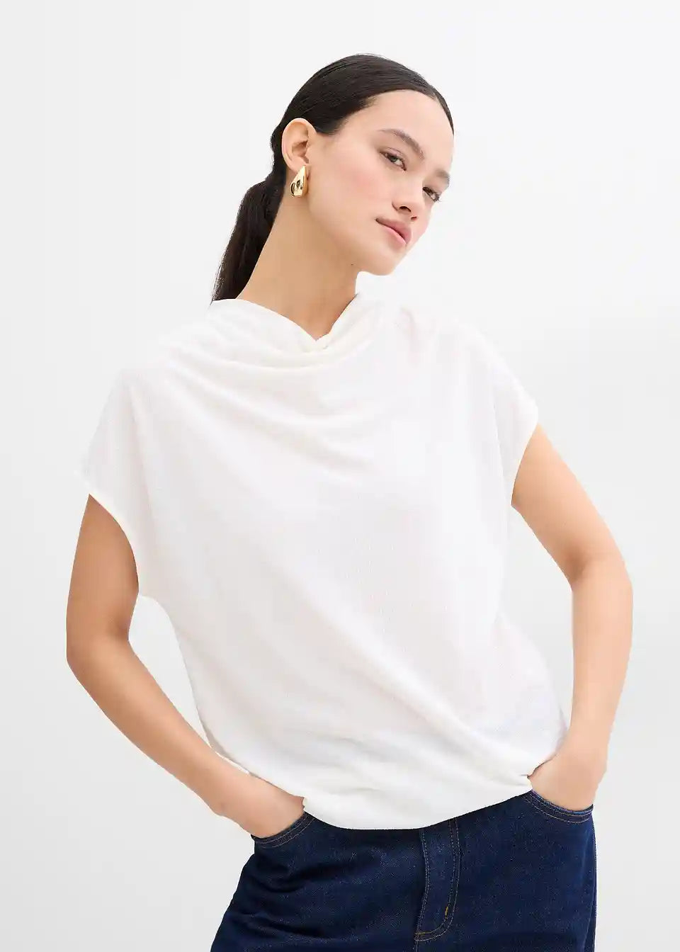 Brezrokavni top z vodoravnim ovratnikom in napihnjenim robom z elastičnim zaključkom