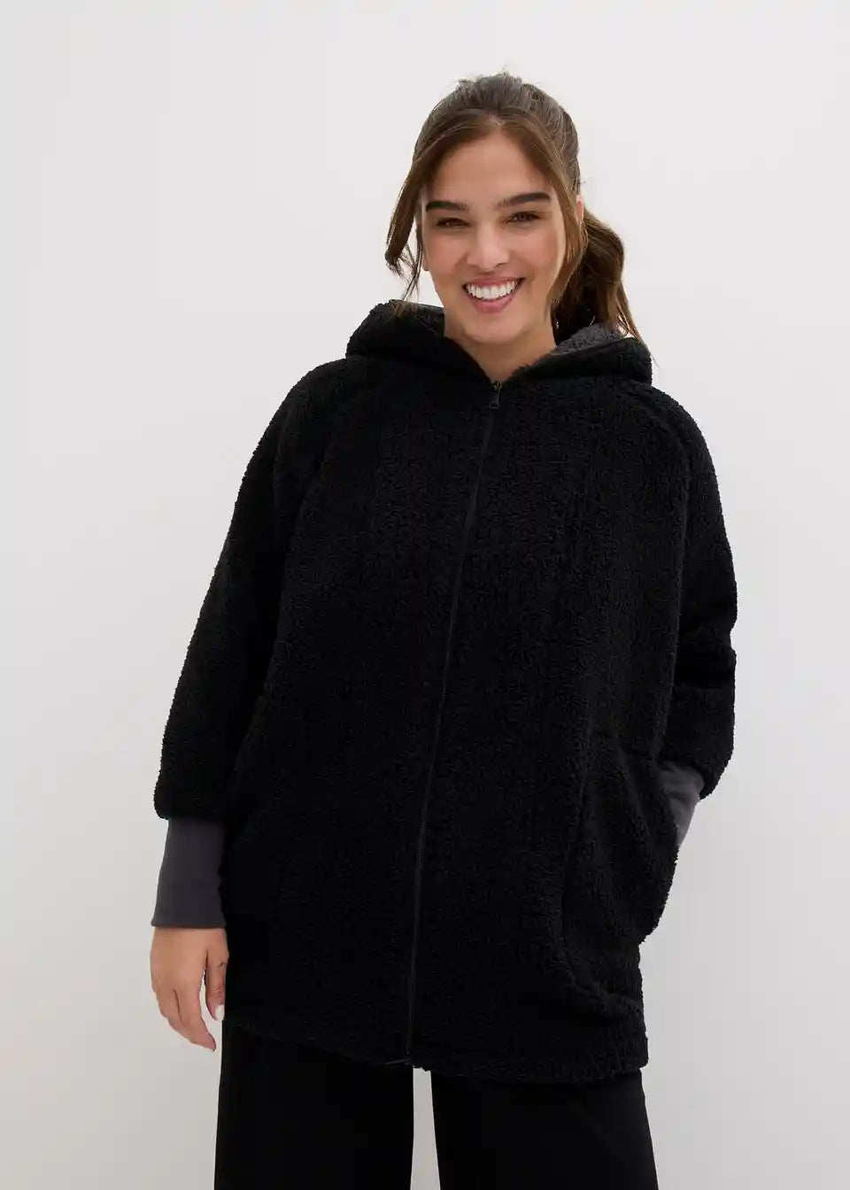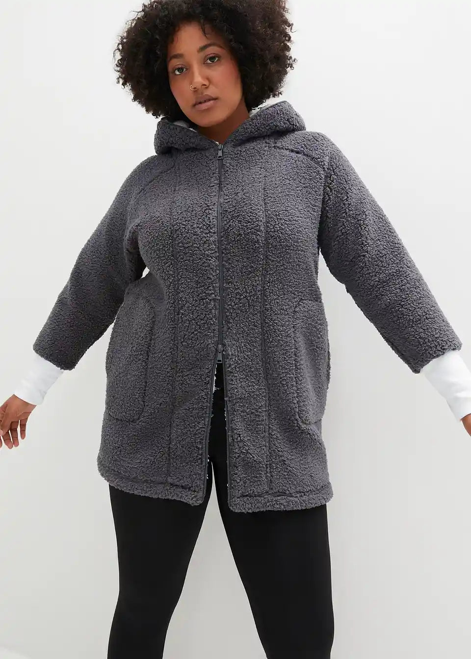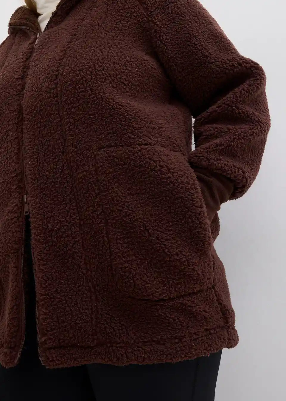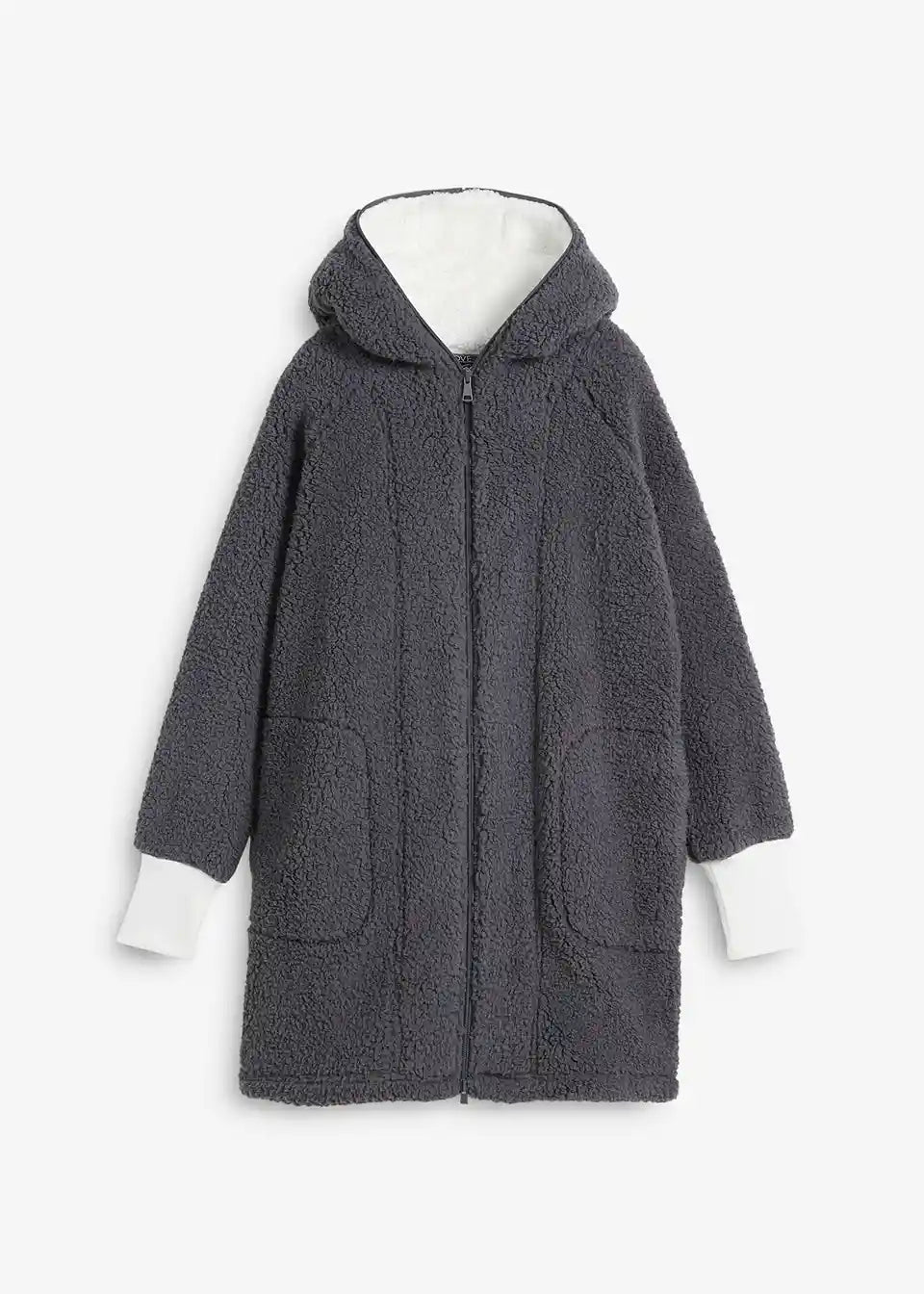 Oversized Teddy-Fleece plašč z žepi in 2-smerno zadrgo, ki jo je mogoče zapreti, vključno s kapuco