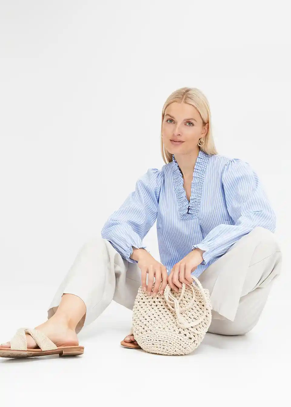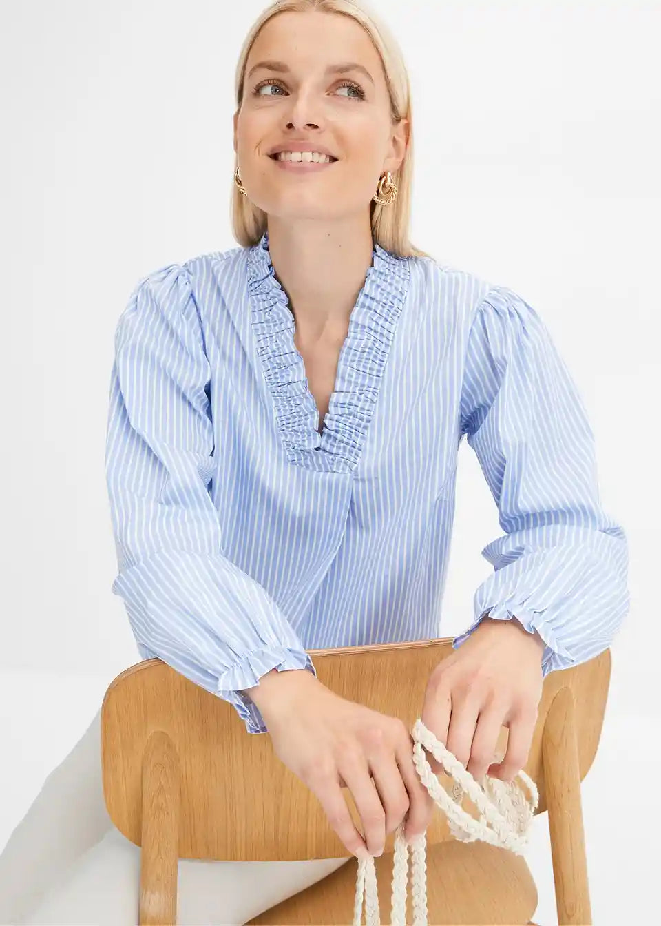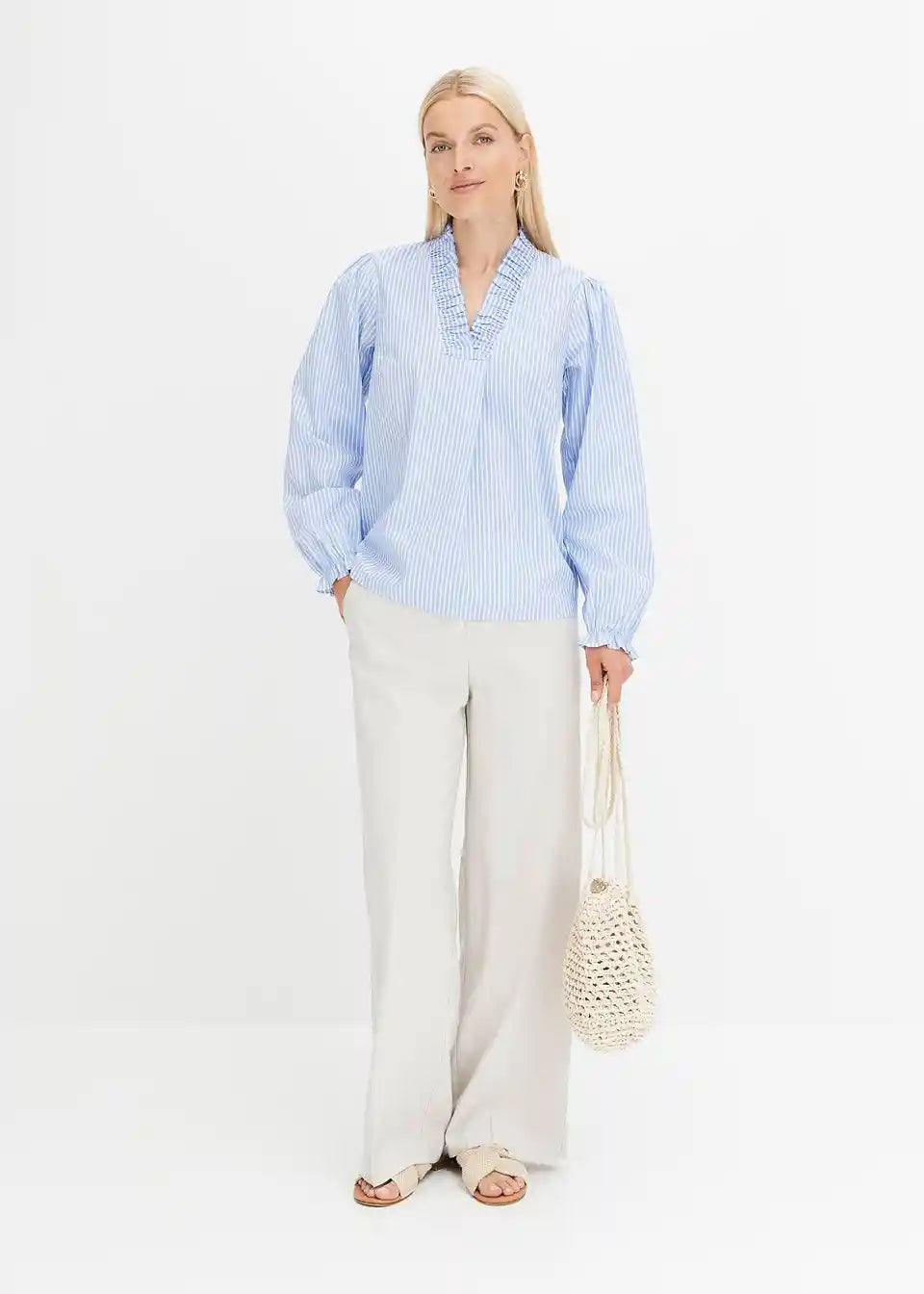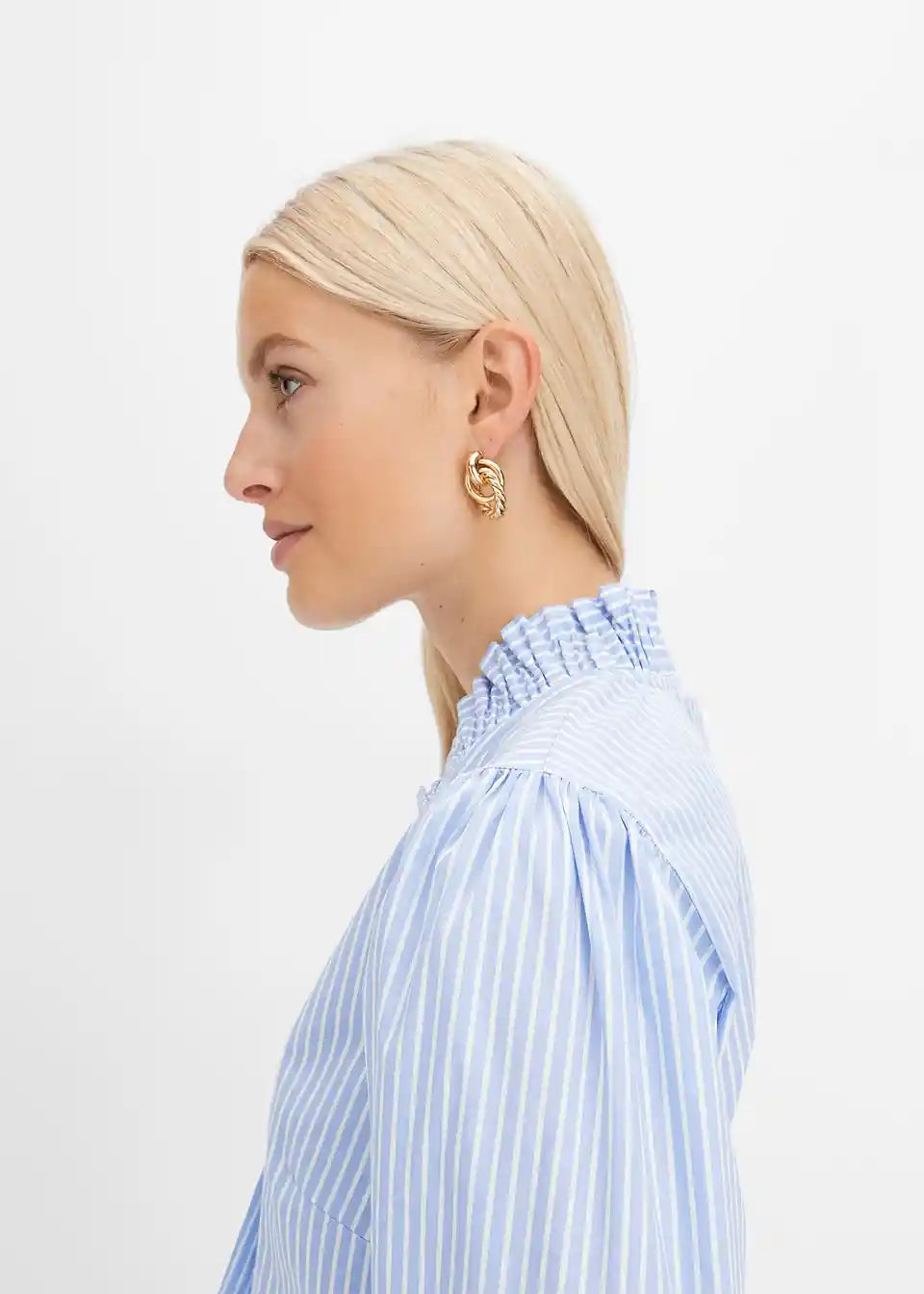 ženska bluza z dizajnom črt in nabrano na izrezu