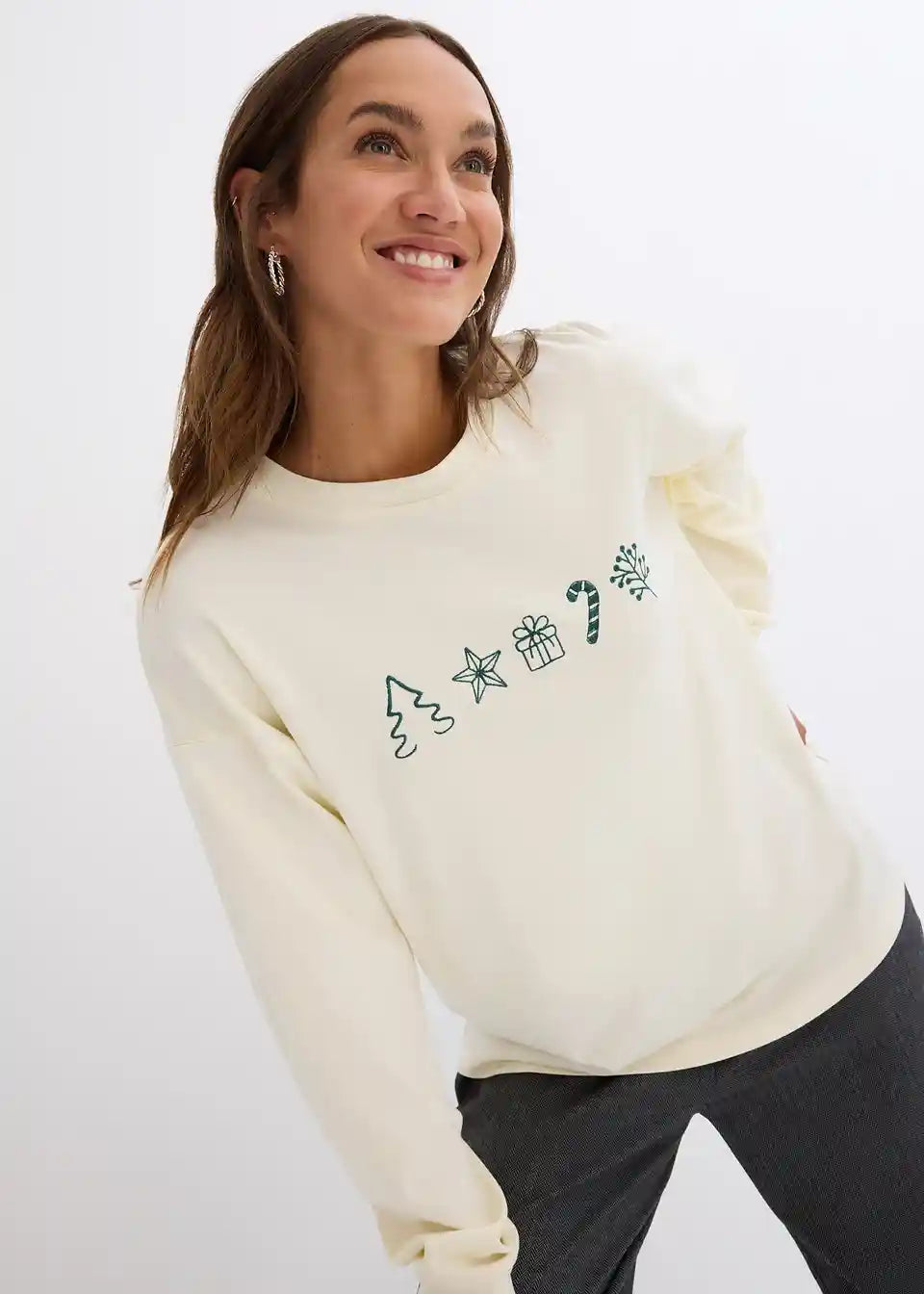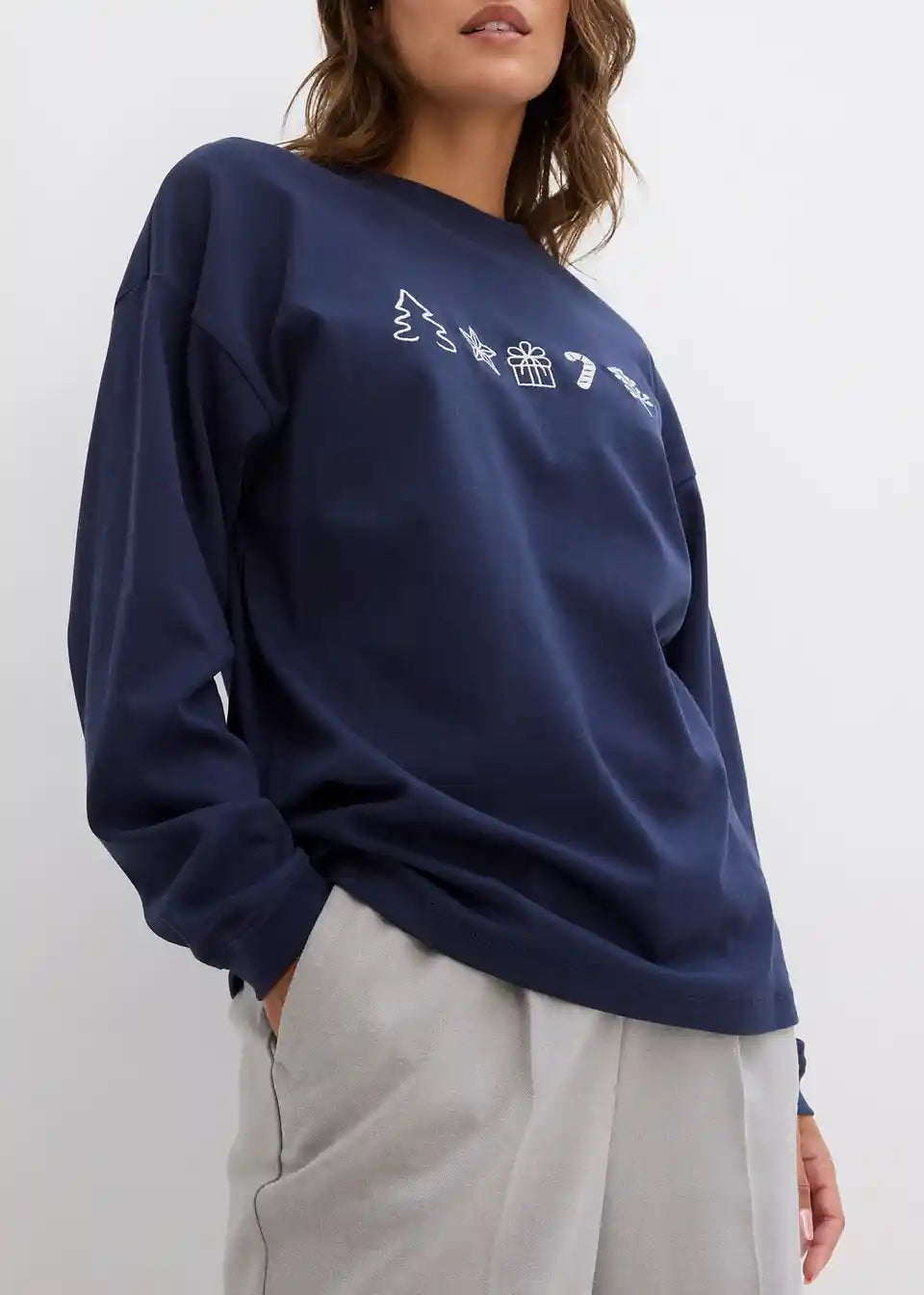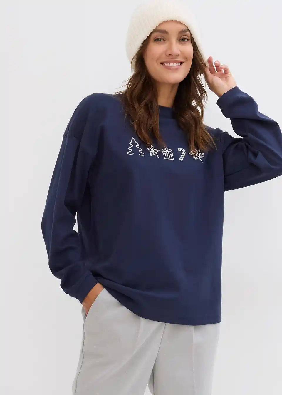 Izvezena božična ohlapna majica z dolgimi rokavi
