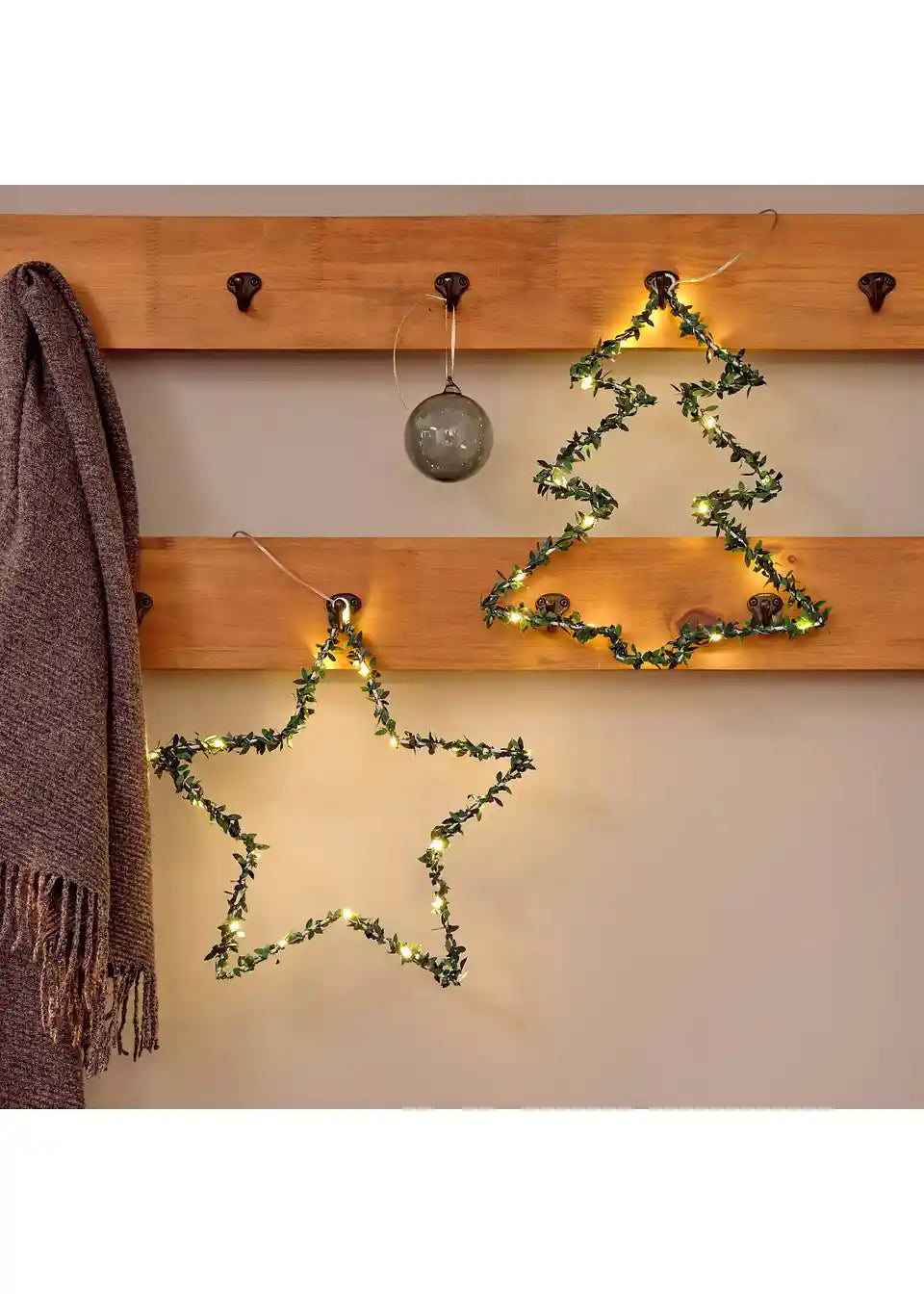 Ustvarite praznično vzdušje z dekoracijo v obliki božičnega drevesca in zvezde. Obe imata po 20 LED lučk. Primerno za obešanje na vrata, okno ali steno. Dimenzije smreke Š/V pribl. 30x35 cm, zvezda premer pribl. 35 cm.