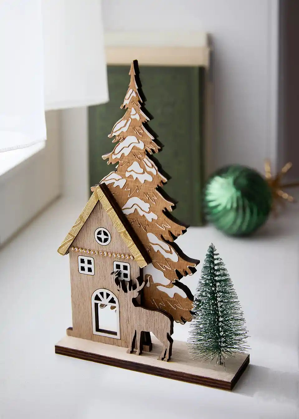 Čarobni leseni dekorativni predmet s hiško in jelenčkom za zimsko dekoracijo