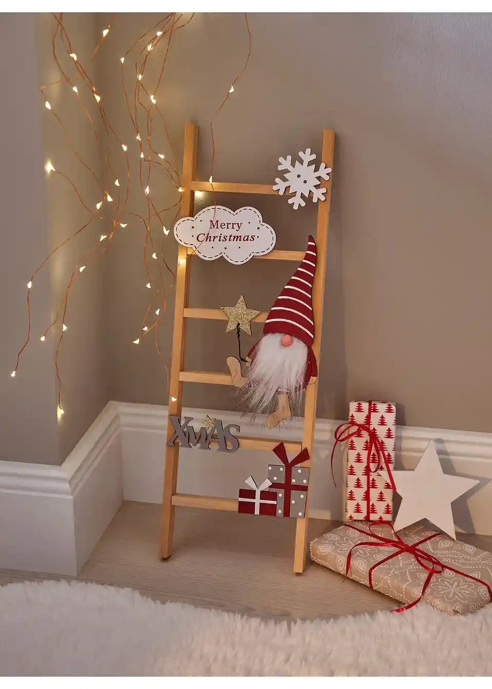 Prisrčna dekoracija za naslonitev na steno – lestev s škratom, darili ter napisom Merry Christmas. Prava paša za oči v božičnem času.