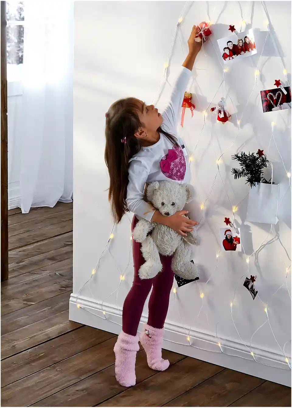 Skupaj 66 toplobelih LED diod je pritrjenih na tej božični stenski in vratni dekoraciji v mreži božičnega drevesca. Ta svetlobna mreža je primerna izključno za notranje prostore. S prisesalnimi kljukicami jo lahko pritrdite na različna vrata ali stene in tako v vsak prostor vnesete praznično vzdušje. Po želji lahko mrežo dodatno okrasite z dodatki, kot so okrasne krogle ali božični obeski. LED-stenska in vratna dekoracija v mreži božičnega drevesca je sodobna posebnost, ki vsakemu prostoru doda praznični sijaj.