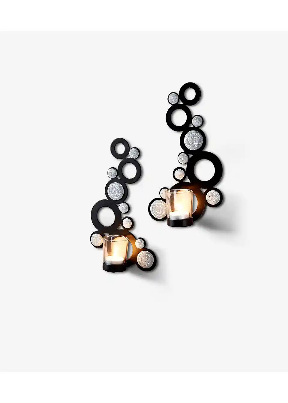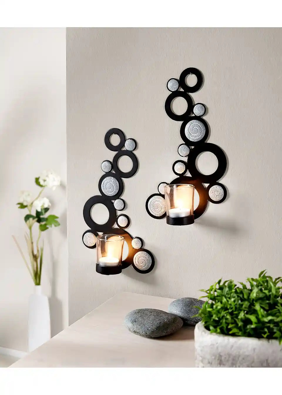 S stenskim svečnikom kamen kot 2-delni set pridobite moderen in brezčasen dodatek za svoj dom. Svečnika sta izdelana iz črnega železa. Dodatni vizualni poudarek so različni sivi elementi v elegantnem videzu kamna. Vsak svečnik je primeren za eno čajno svečko. Stenski svečnik kamen v 2-delnem setu se odlično poda na vsako steno vašega doma in poskrbi za romantično vzdušje.