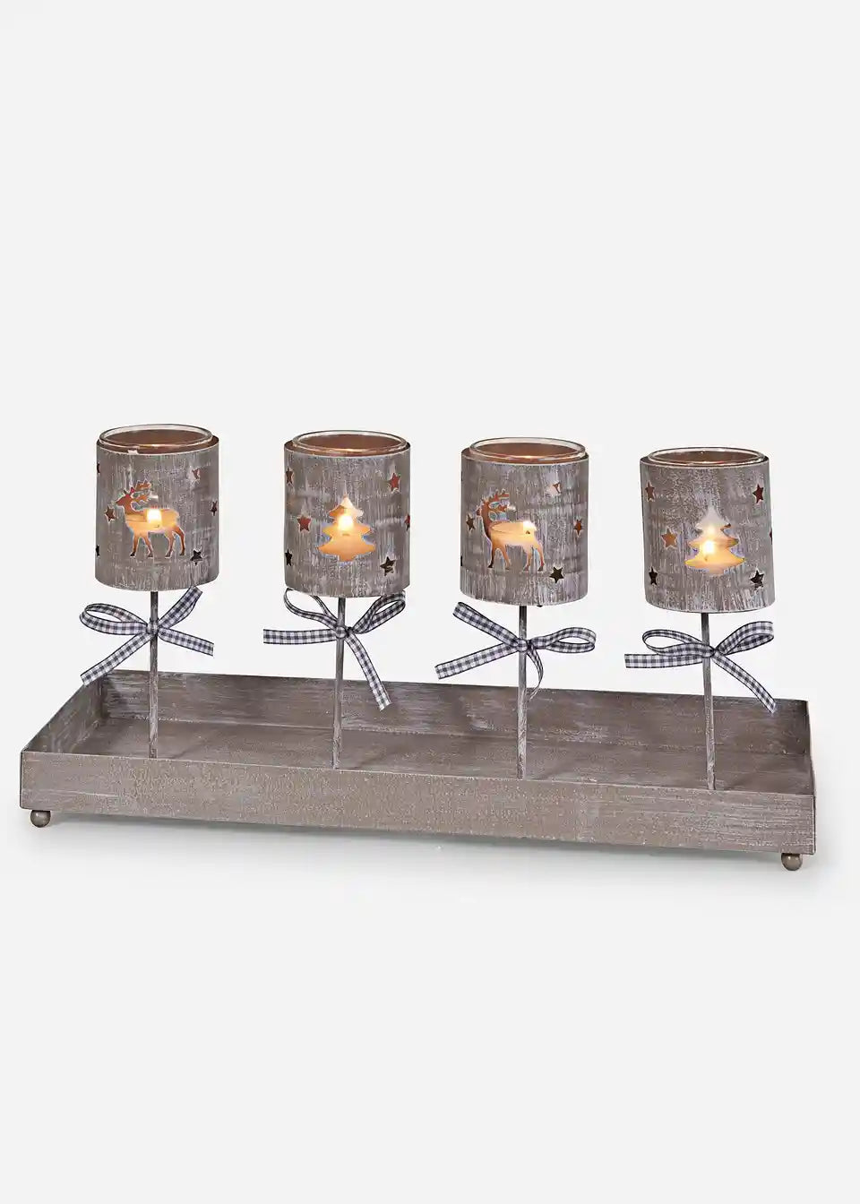Stilski adventni aranžma s štirimi okrasnimi svečniki prinaša praznično vzdušje v božični čas. Elegantni svečniki iz kovine so okrašeni s prikupnimi motivi, kot so božična drevesca in severni jeleni, ter ustvarjajo prijetno atmosfero. Vsak svečnik je nameščen na stabilnem kovinskem ogrodju v preprostem in sodobnem dizajnu. Idealen za postavitev na mizo ali okensko polico, ta aranžma ponuja privlačen način za praznovanje adventnega časa. Popoln za dvigovanje pričakovanja na božič in zagotavljanje tople svetlobe v temnih zimskih dneh. Časovno neobčutljiv dekorativni element, ki združuje tradicijo in slog.