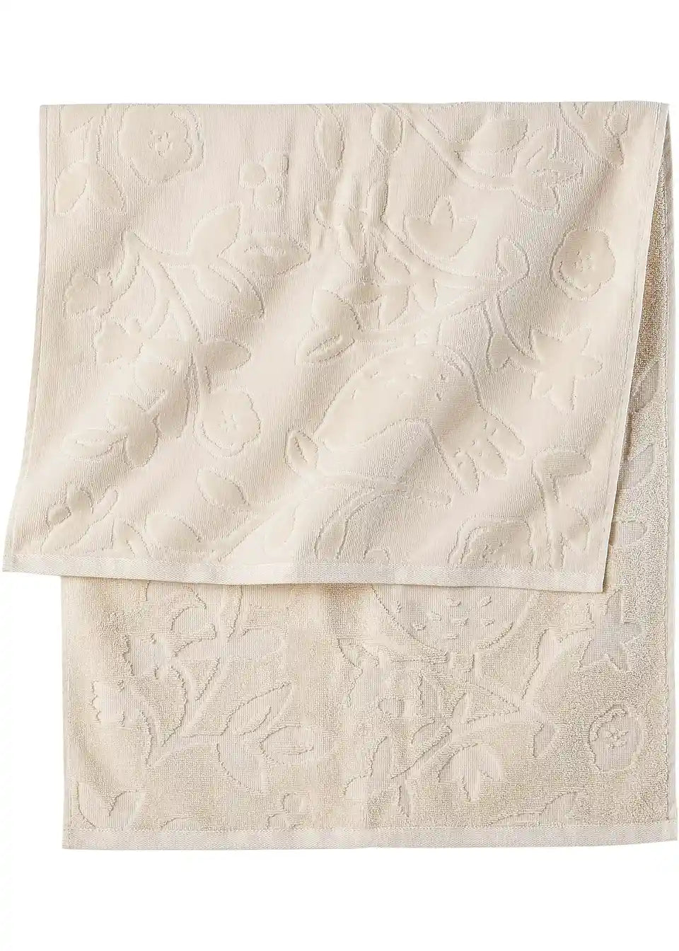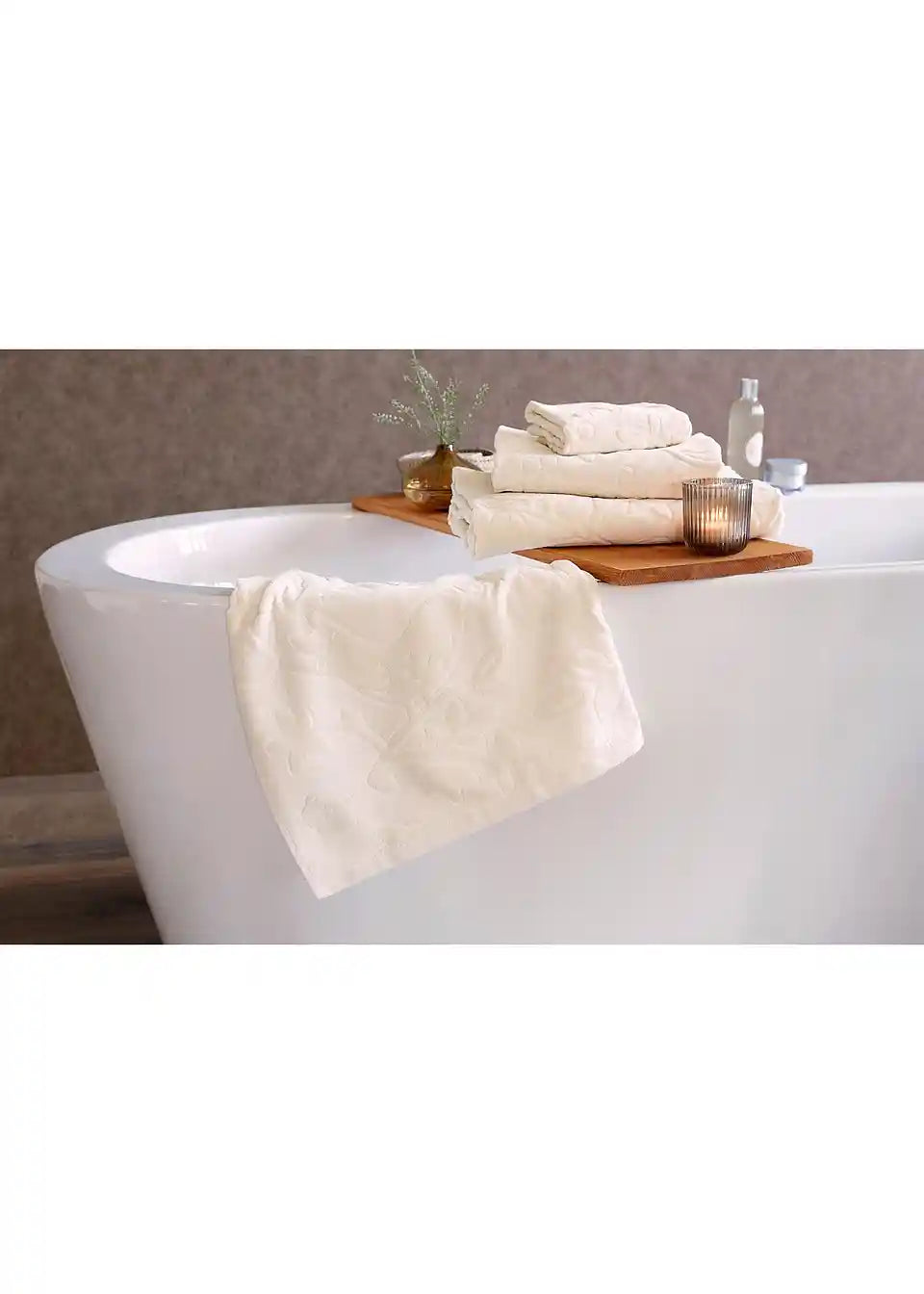 Strukturirana površina zagotavlja subtilen vzorec cvetov, pralna pri 60°C, prijetno mehka in zelo vpojna kakovost.