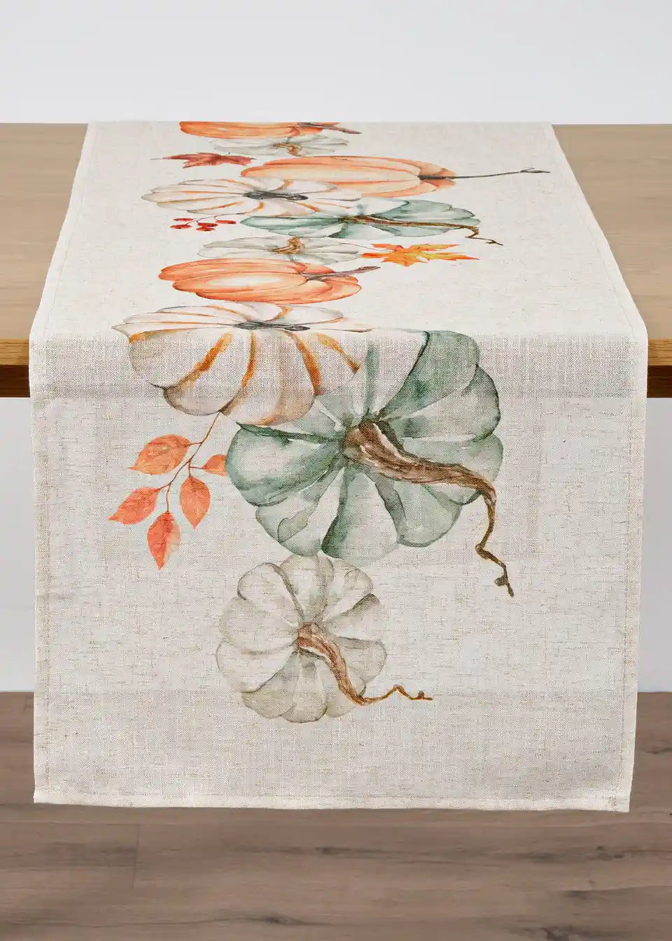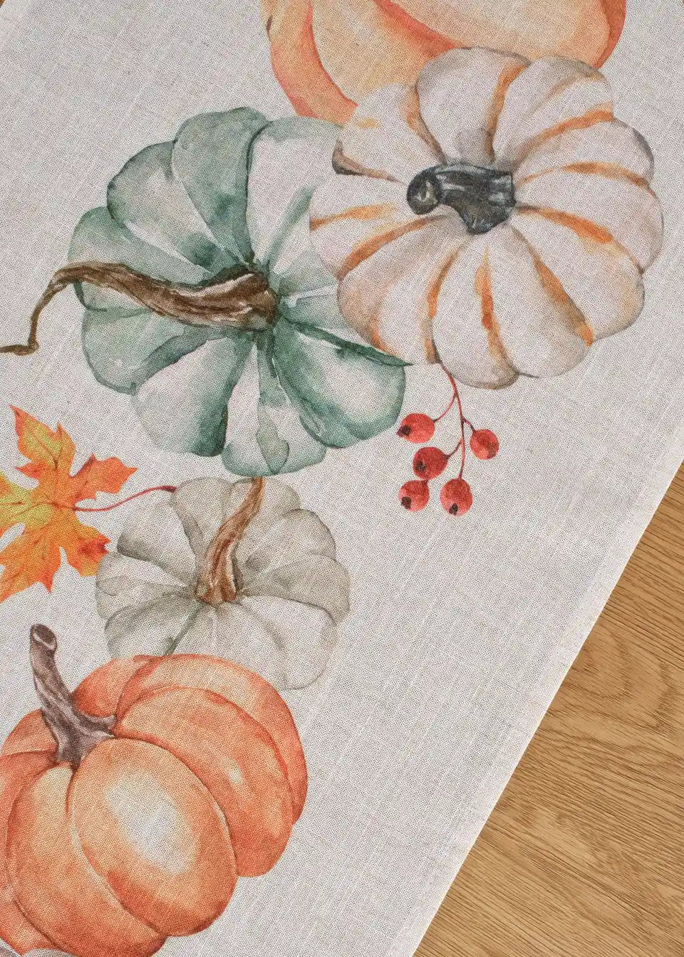 Podolgovat prt s potiskom buč je dekorativen in primeren za jesen. Digitalni tisk naredi barve še posebej briljantne.