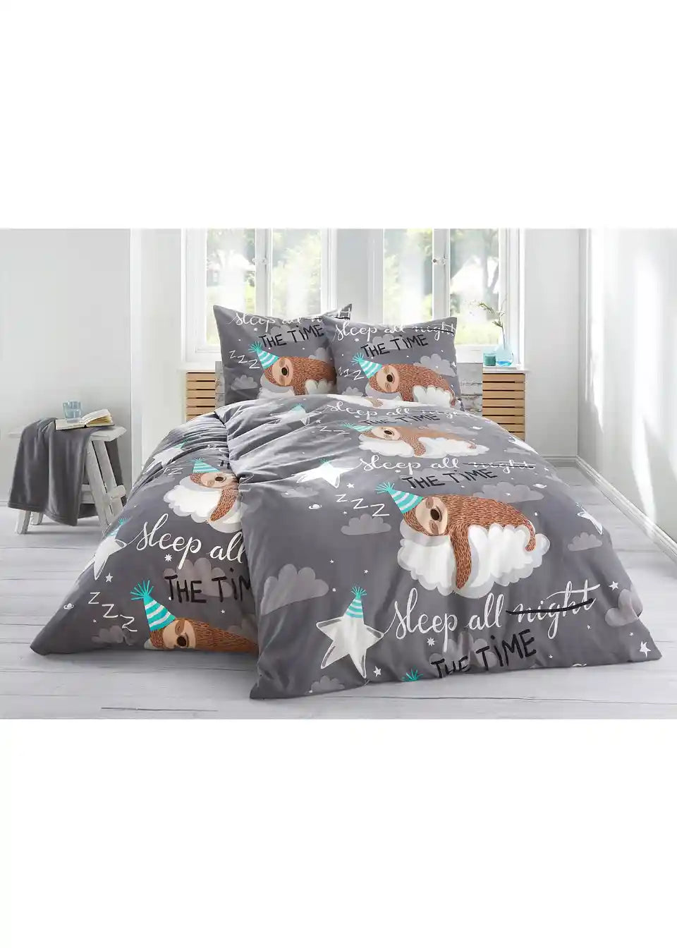 Za ljubitelje lenivcev nujna izbira: potiskana posteljnina z motivom lenivca in napisom.
