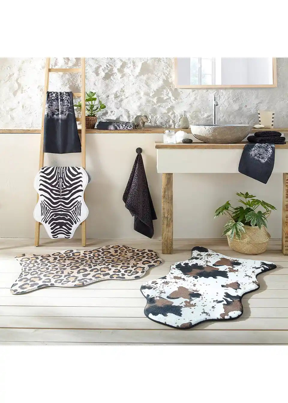 Brisača s trendovskim leo vzorcem za stilsko kopalnico, pralna na 60°C, mehka in vpojna kvaliteta. Vse dimenzije so približne.