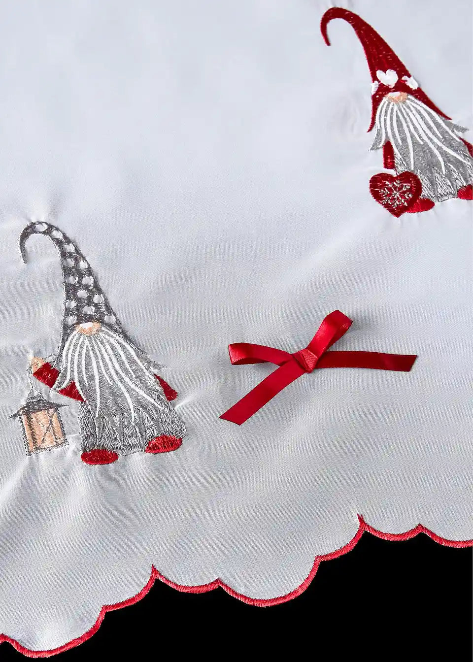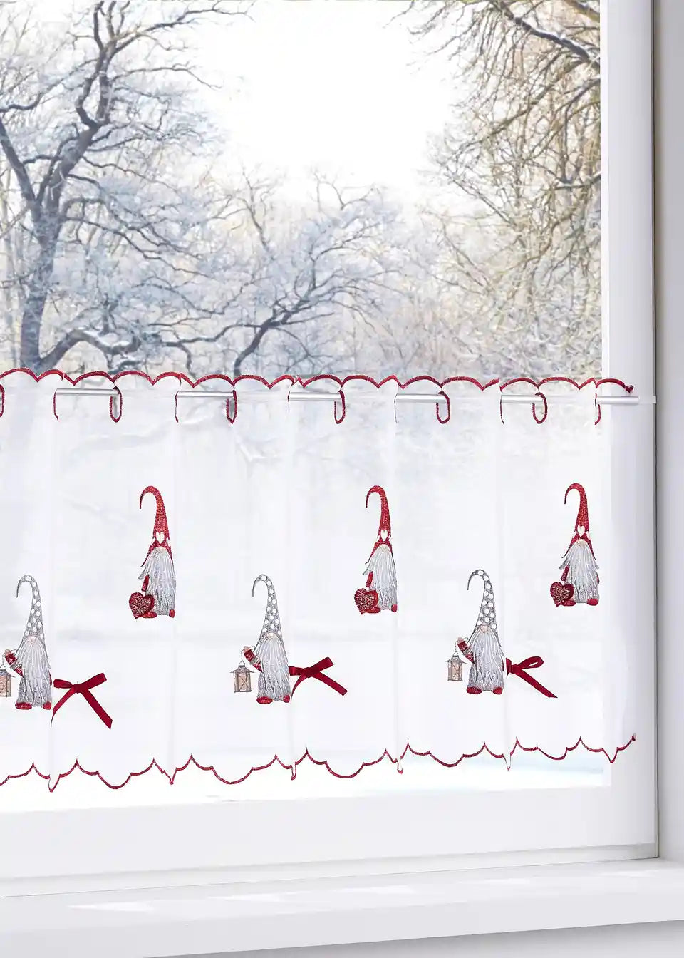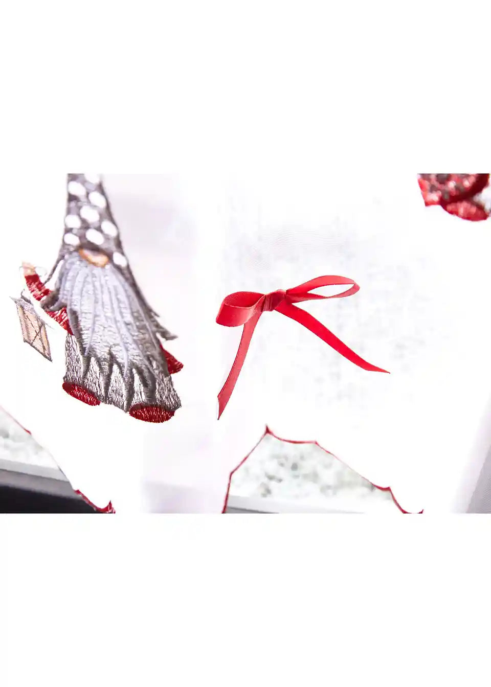 Praznična kratka zavesa s prisrčnimi prišitimi pentljami in izvezenimi škrati iz zračnega lahkega kakovostnega voileja. Ustrezno so na zgornjem in spodnjem robu (ki sta zaobljena) dodane rdeče vezenine. Primerna za palice do 3 cm premera.