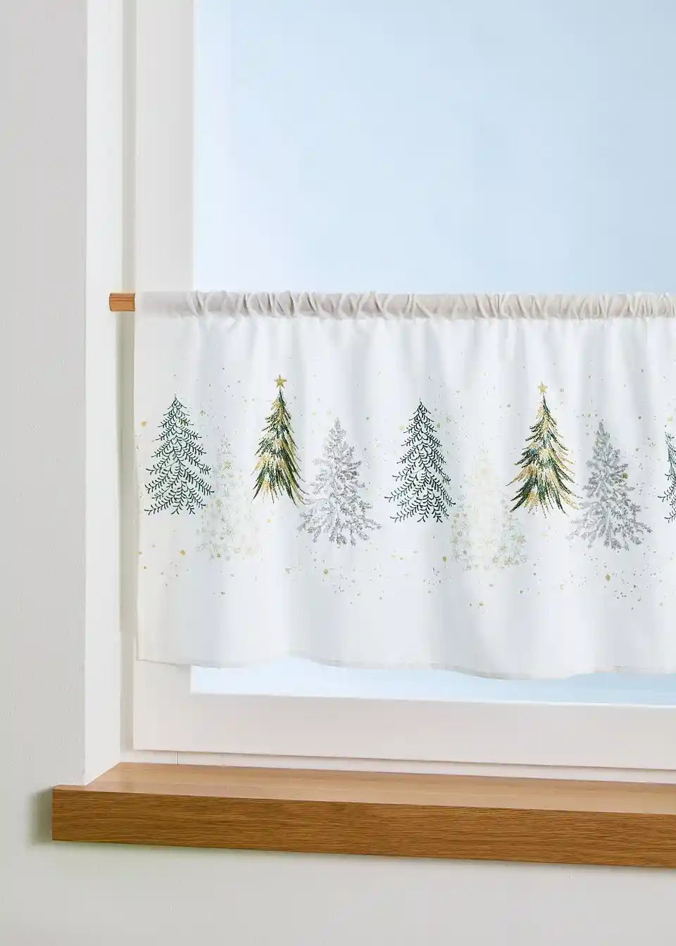 Polovična zavesa v videzu platna je nevpadljiva zaščita pred pogledi in idealna dekoracija za praznično božično vzdušje. Lep motiv s sijajnim učinkom je natisnjen in delno izvezen.