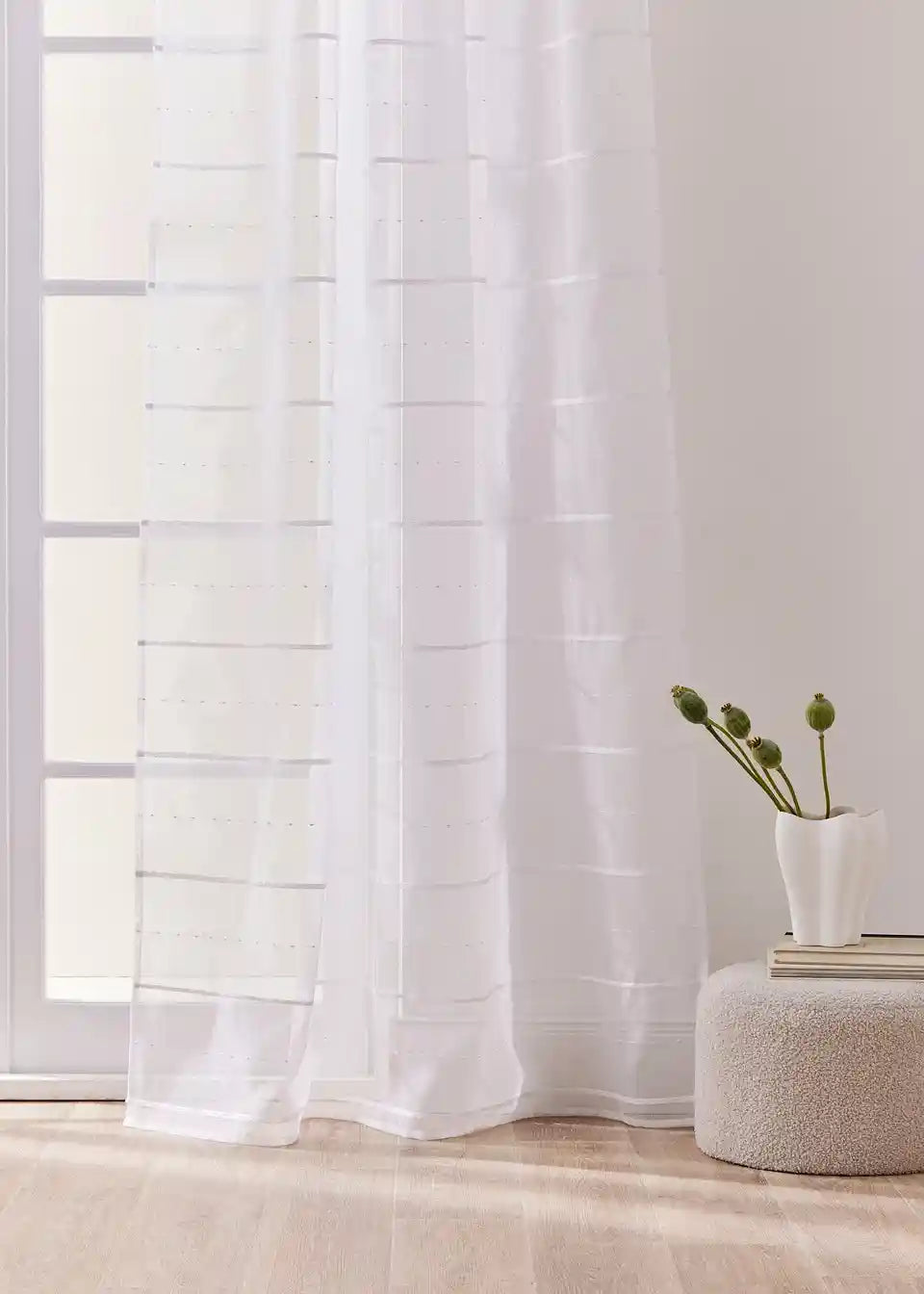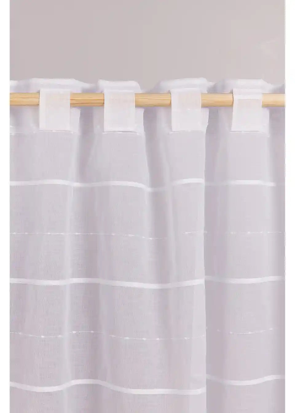 Prosojna gotova zavesa z diskretnimi črtami v 3D videzu. Zavesa v beli barvi se odlično kombinira in je vsestransko uporabna.