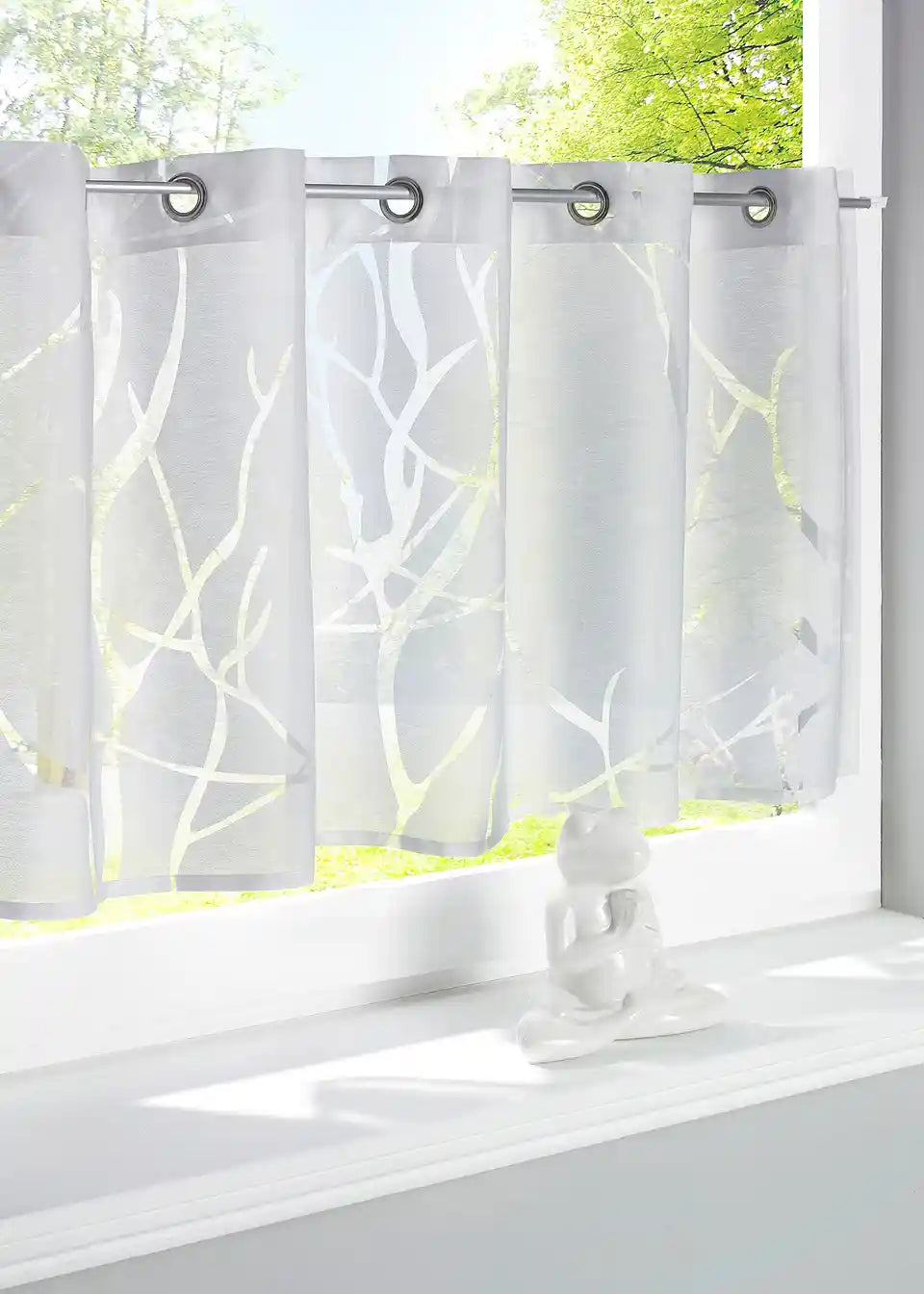 Ausbrenner vzorec na zavese za okna ustvarja čudovite učinke in naravni videz. Kakovostna zavesa iz mešanice materialov je primerna za kuhinjska ali jedilniška okna, prepuščanje svetlobe pa pričara prelepo vzorčenje v tvojem prostoru.