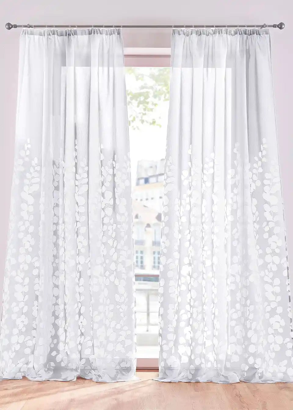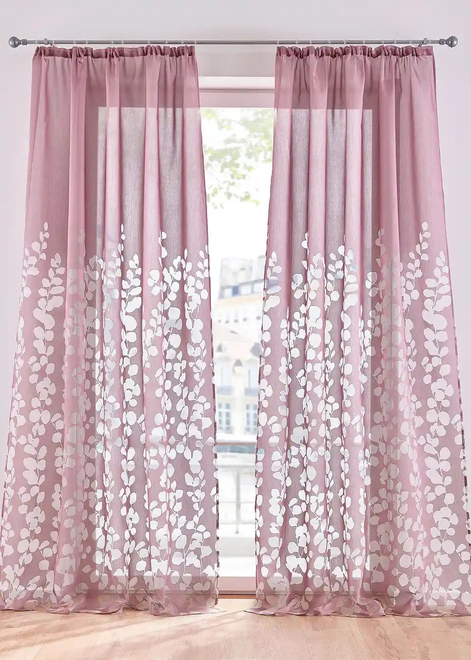 Čudovite prosojne zavese iz visokokakovostne izžgane tkanine s poudarjenim dizajnom listov, ki se proti vrhu razprši. Na voljo v privlačnih barvah za dom, ki se lepo ujemajo z mnogimi barvami notranje opreme! Oblika listov je pri vseh štirih velikostih enako velika.