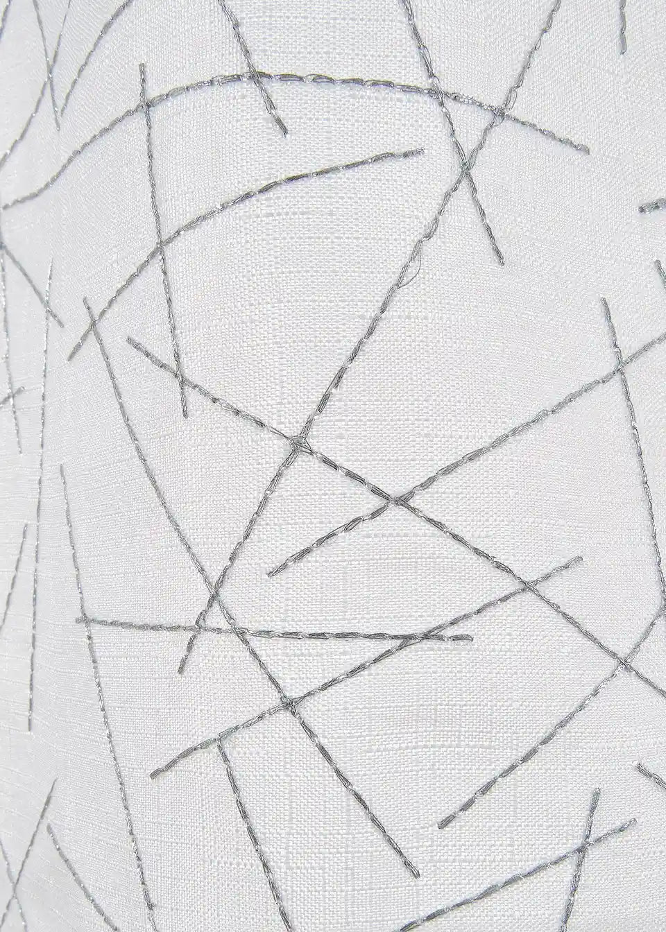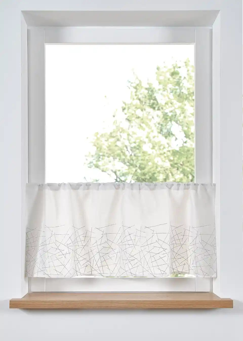 Kuhinjska zavesa ima dovršen pridih, saj jo krasijo srebrne vezenine z nežnim sijajem. Na moderen način polepša vaše kuhinjsko okno.