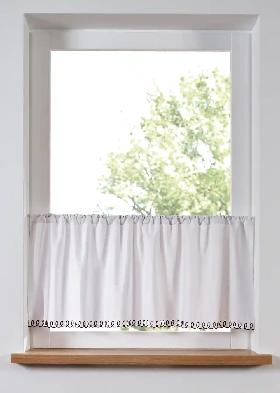 Kakovostna polovična zavesa iz čistega ekološkega bombaža z nevpadljivo vezenino na obrobi ter prehodom za palico za preprosto namestitev in materialom za preprosto čiščenje.