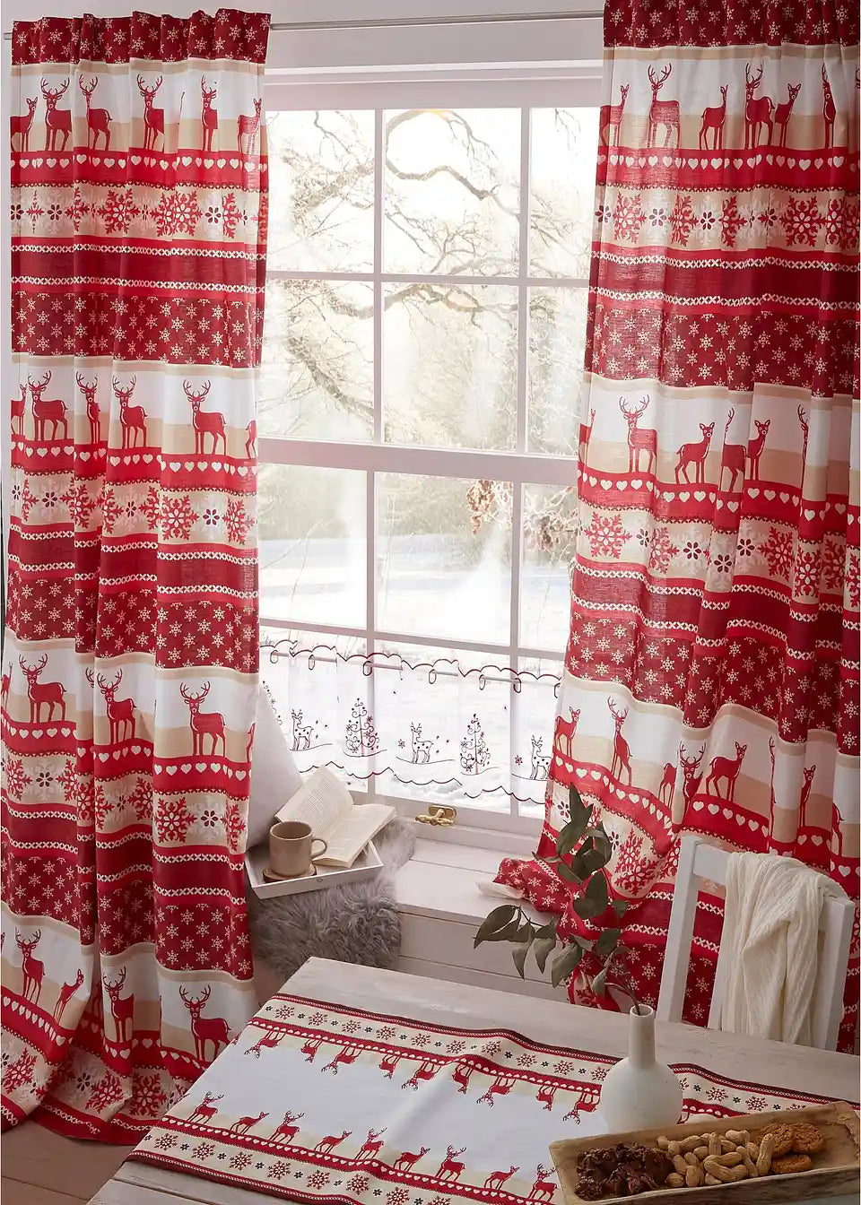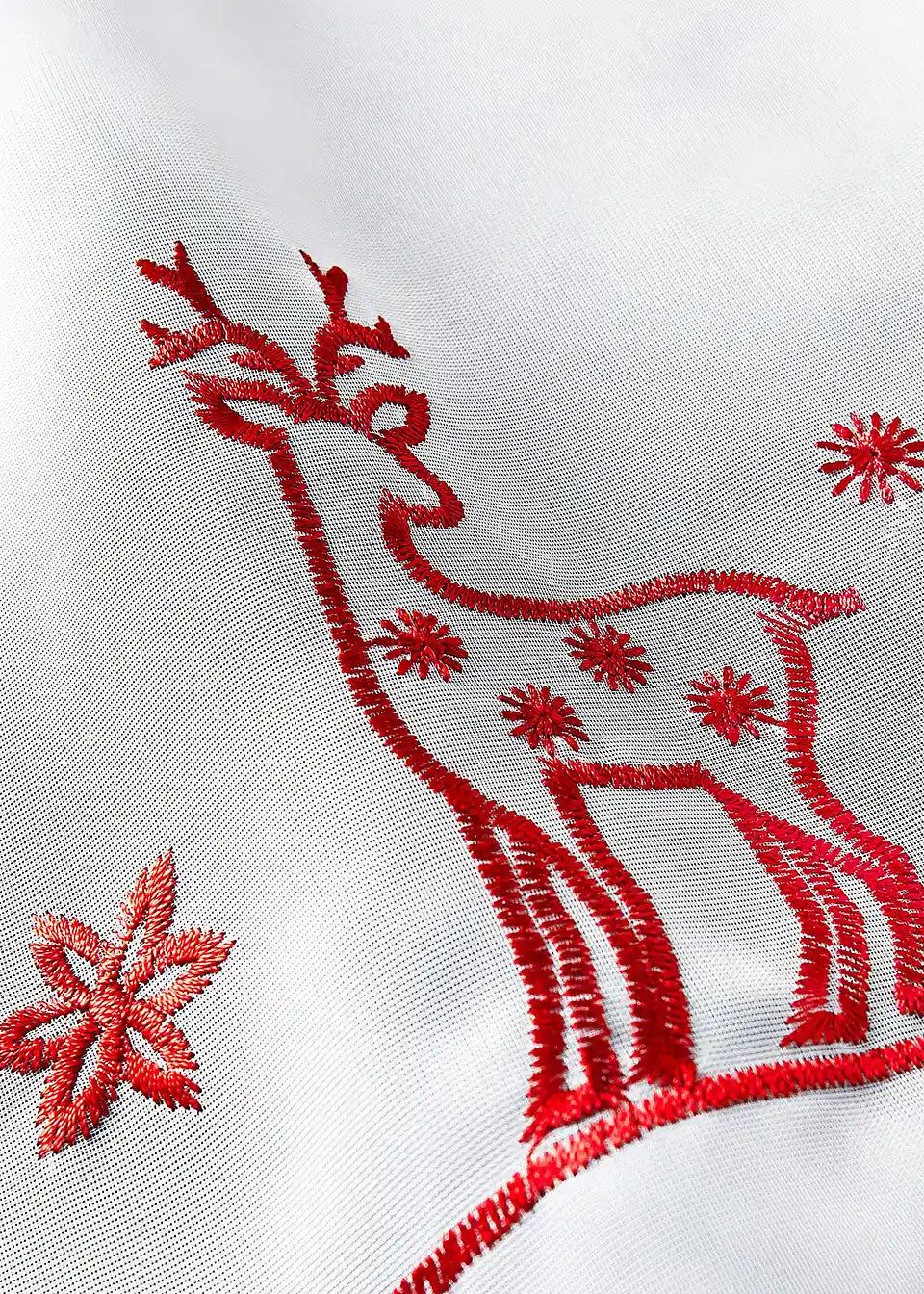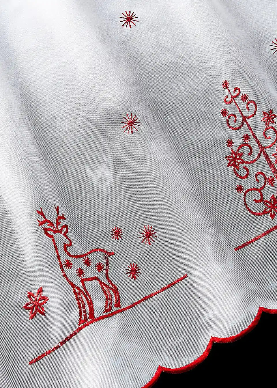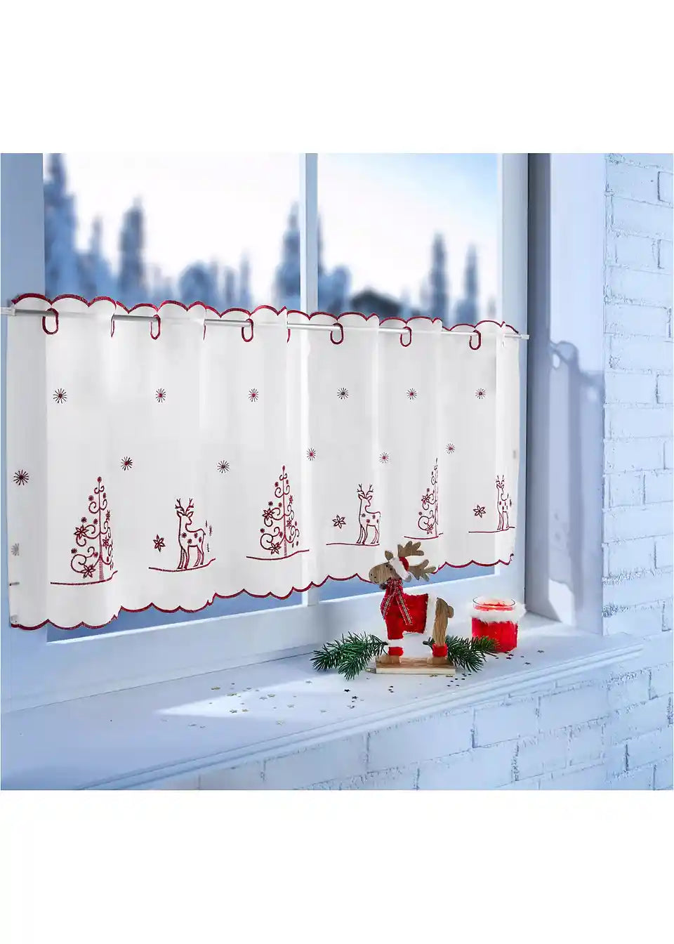S to očarljivo kuhinjsko zaveso bo božič lahko prišel! Kratka zavesa prepriča s svojim lepim vezenjem jelenov in smrek, izdelana je iz finega voala. Namesti se z uporabo luknjičaste letve in je primerna za drogove do premera 3 cm.