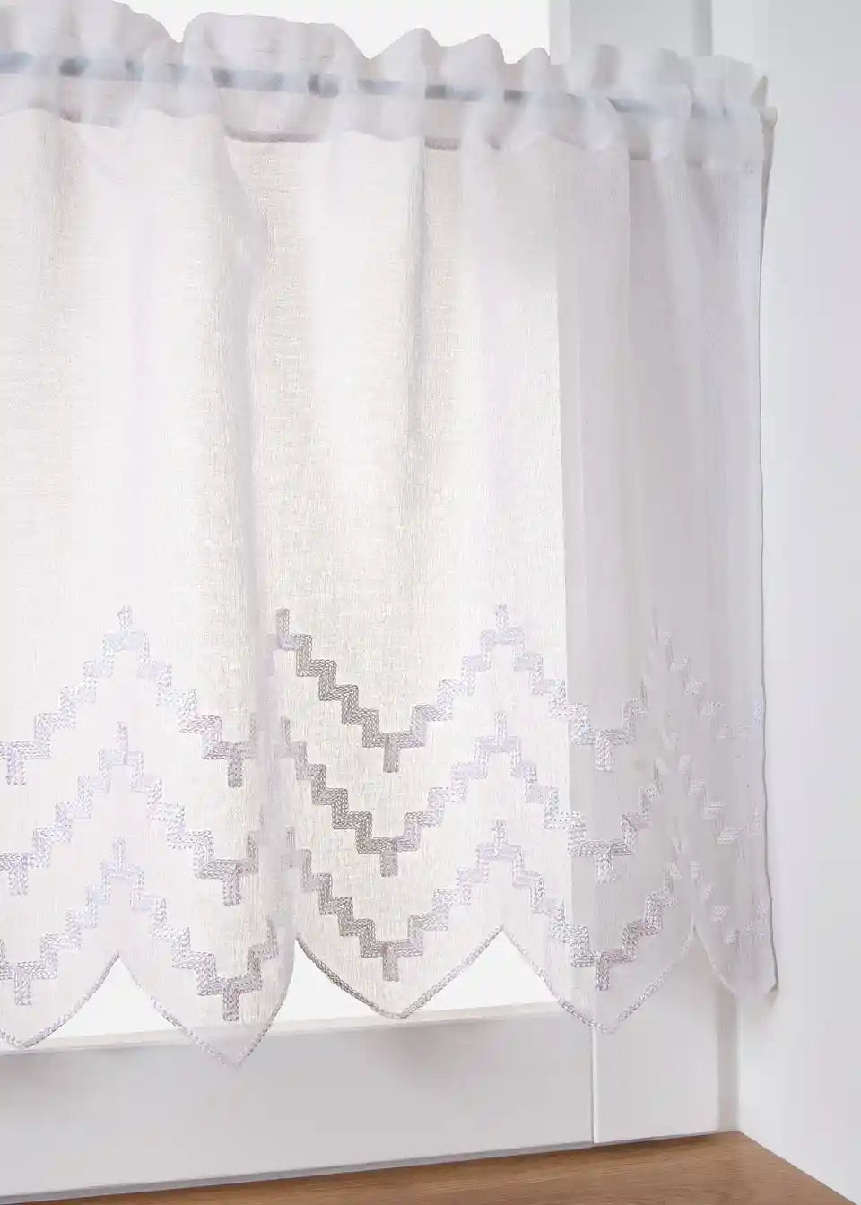 Moderna polovična zavesa z recikliranim poliestrom in zelo kakovostno vezenino. Enostavna namestitev s pomočjo prehoda za palico ter z vezenino za dekorativni poudarek.