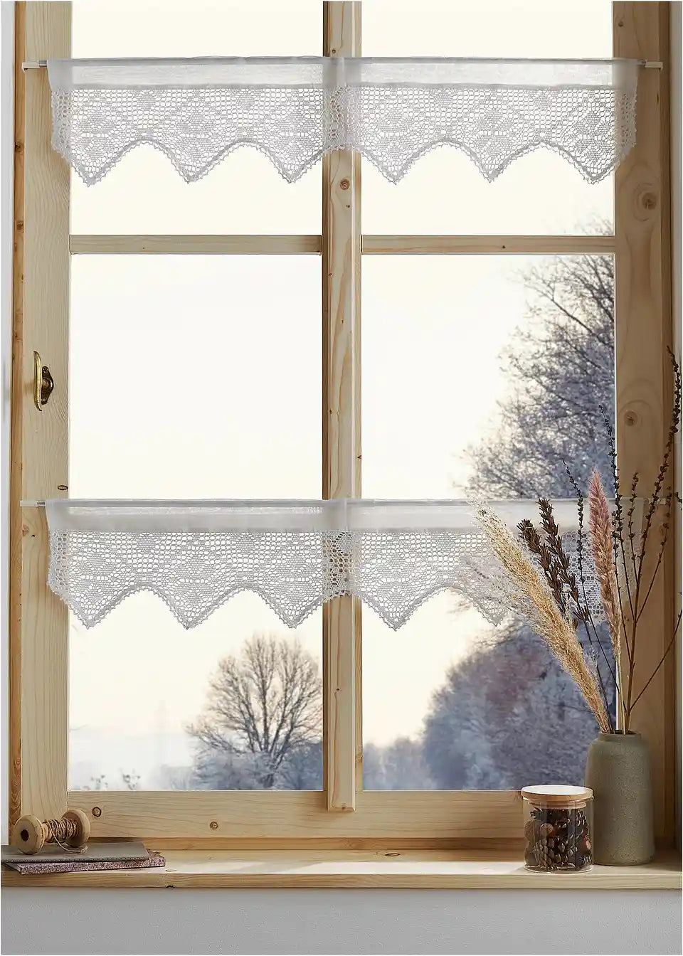 Kvačkana Scheibengardine posebne vrste. Je prosojna in ozko krojena, zato jo lahko uporabite tudi kot trak za mize ali za druge namene. S tunelsko zanko lahko Scheibengardine enostavno okrasite. Dimenzije tkanine so: 20 cm višina in 90 cm širina.