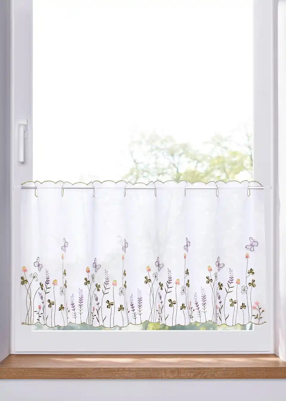 Polovična zavesa s cvetlično vezenino