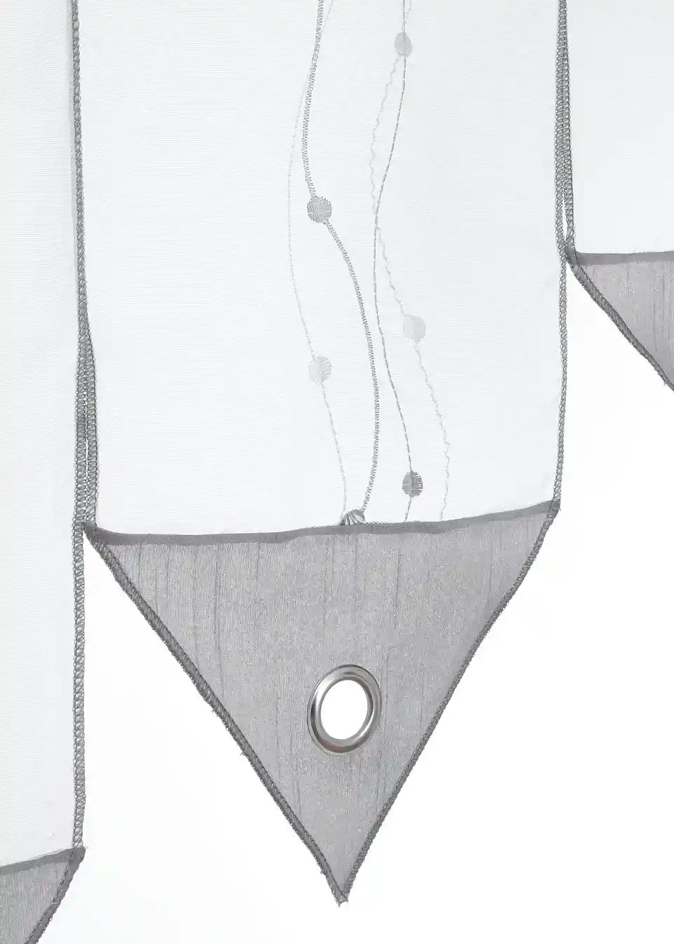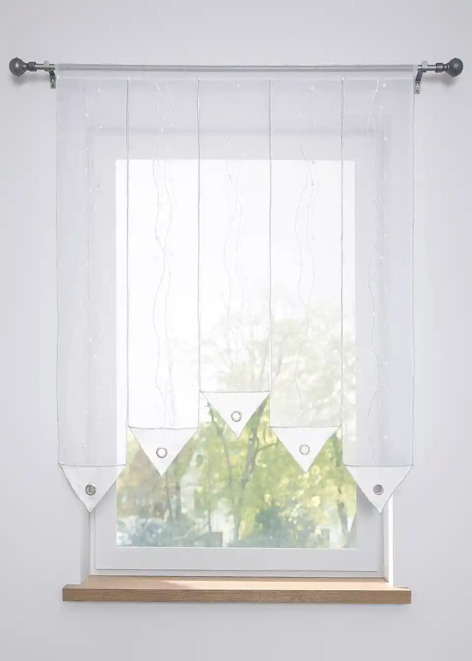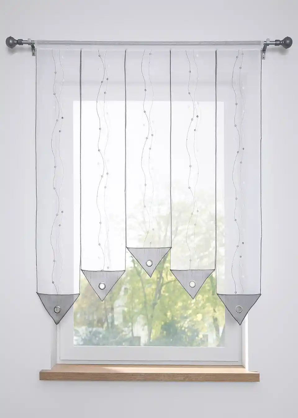 Ta panelna zavjesa ima posebno obdelavo, saj so posamezni trakovi blaga zgoraj povezani skozi tunelski všitek. Vsak trak je opremljen z izbranim vezenjem, trikotnim zaključkom z obročkom in je širok približno 20 cm, torej širina določa število trakov blaga. Tako je panelna zavjesa posebna dekoracija, ne samo za kuhinjsko okno.