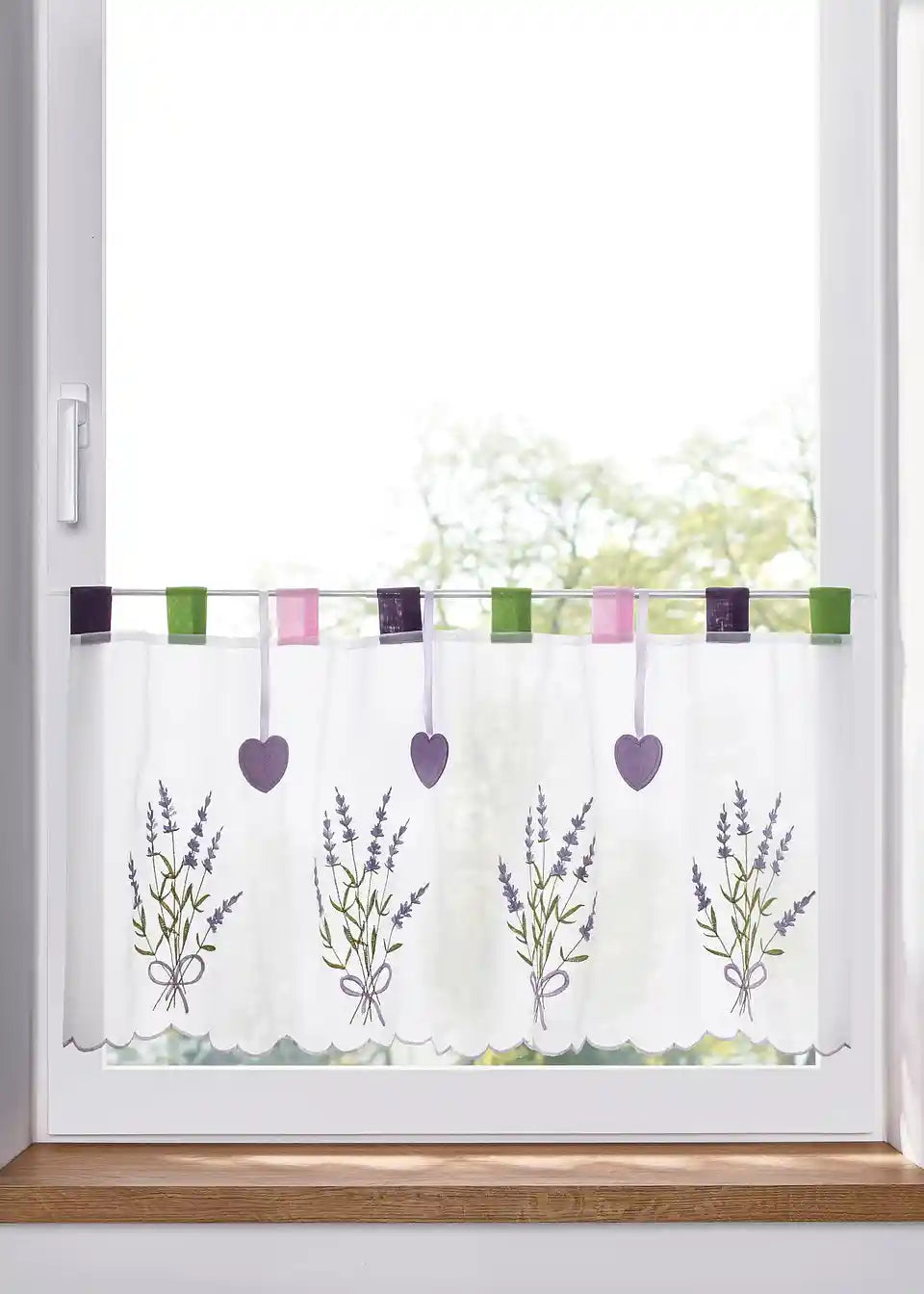 Prisrčna kuhinjska zavesa s čudovito Lavandel-vezenino in majhnimi visečimi srčki: Te lahko po potrebi tudi odstranite. Absolutna paša za oči za tvoje kuhinjsko okno!