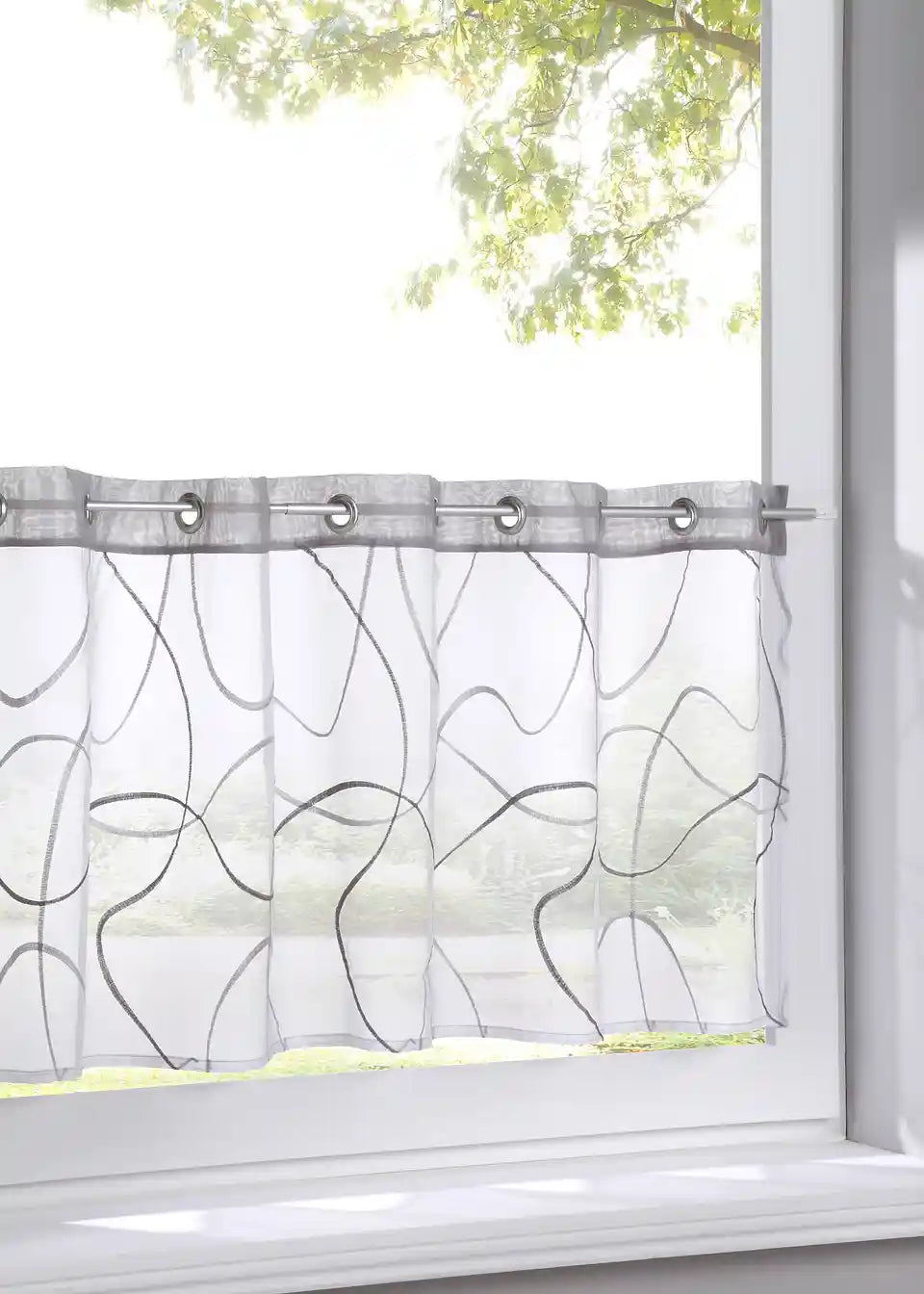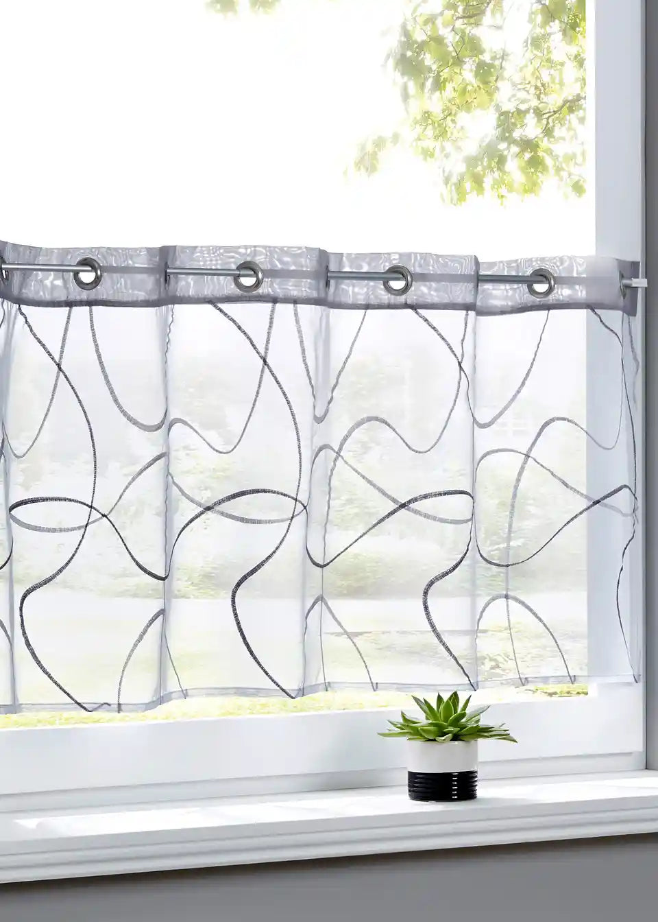 Čudovit dizajn za tvojo kuhinjo: prekrivalo za okno je izdelano iz prosojne voile kakovosti in prepriča z izrazitim vezenjem ter obrobo v barvi. Moderno celostno podobo poudarja obesitev z obročki.