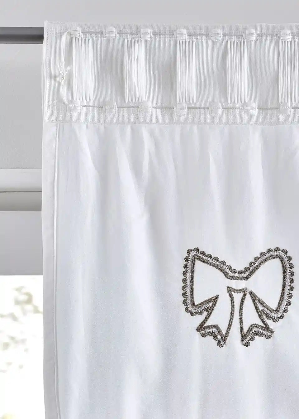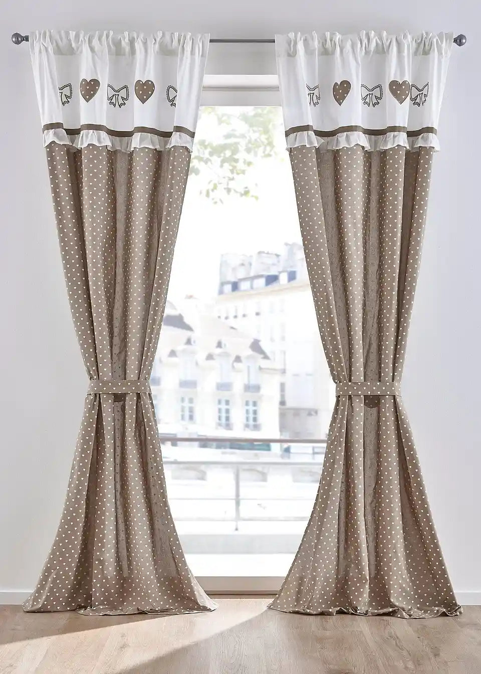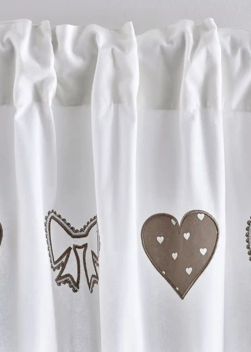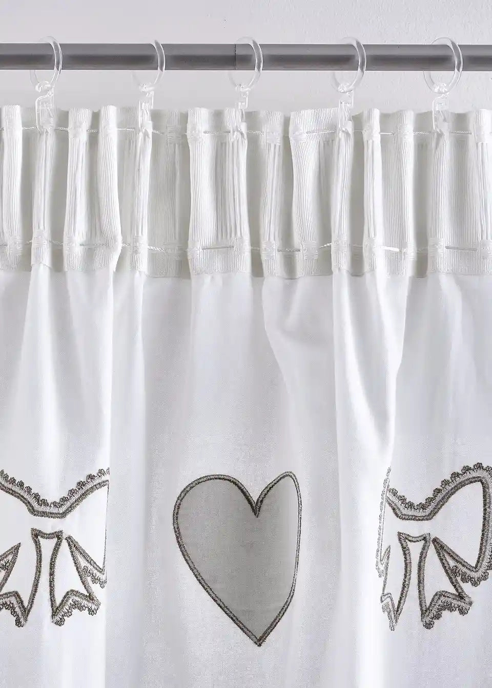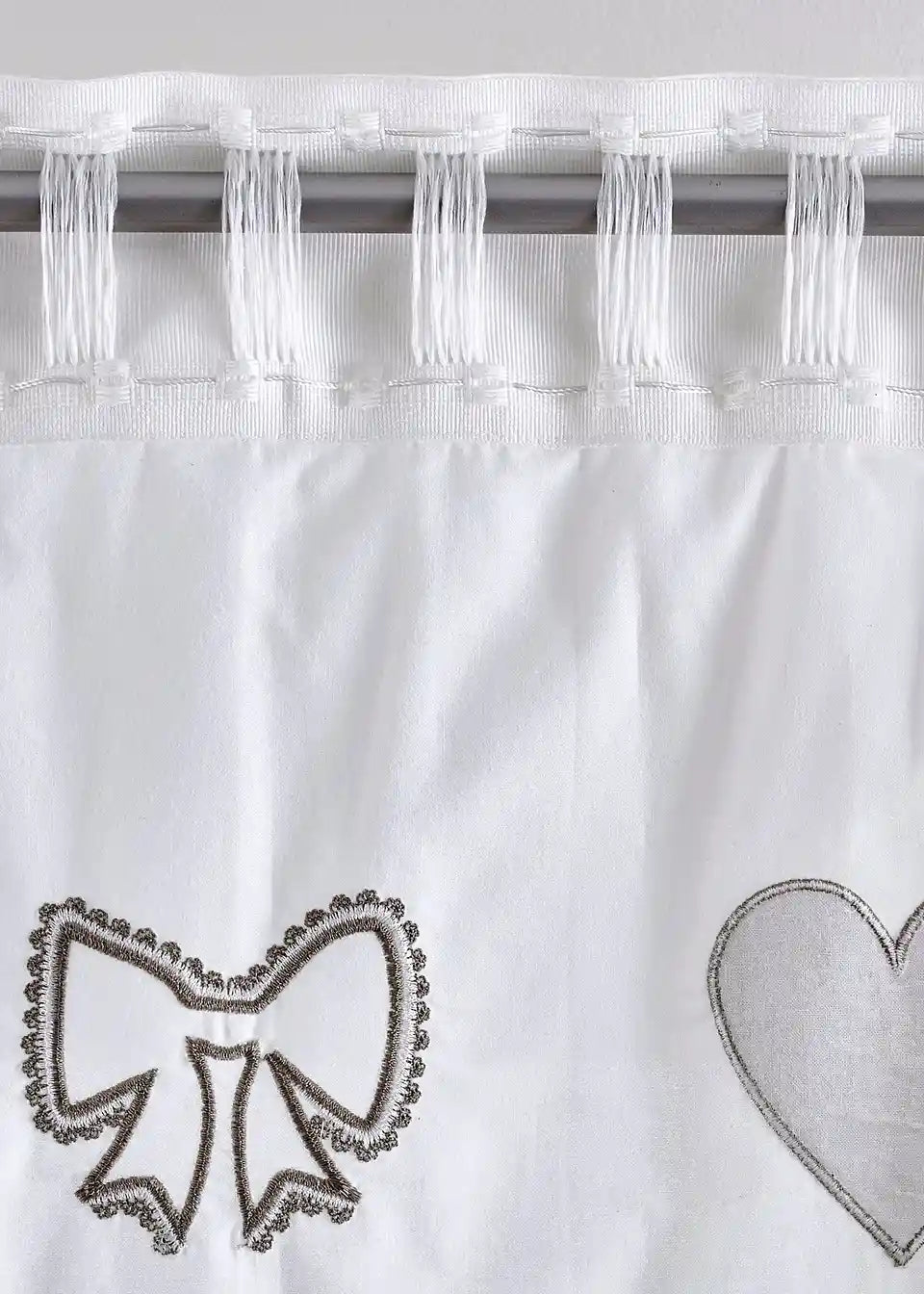 Ta romantična zavesa iz čiste ekološke bombažne tkanine se predstavlja v čudovitem podeželskem slogu. Na zgornjem delu je vezen z lepimi pentljami in srci. Podeželski videz je čudovito poudarjen z majhnimi potiskanimi srčki. Ustrezni držali za zaveso dodata zadnji pridih.